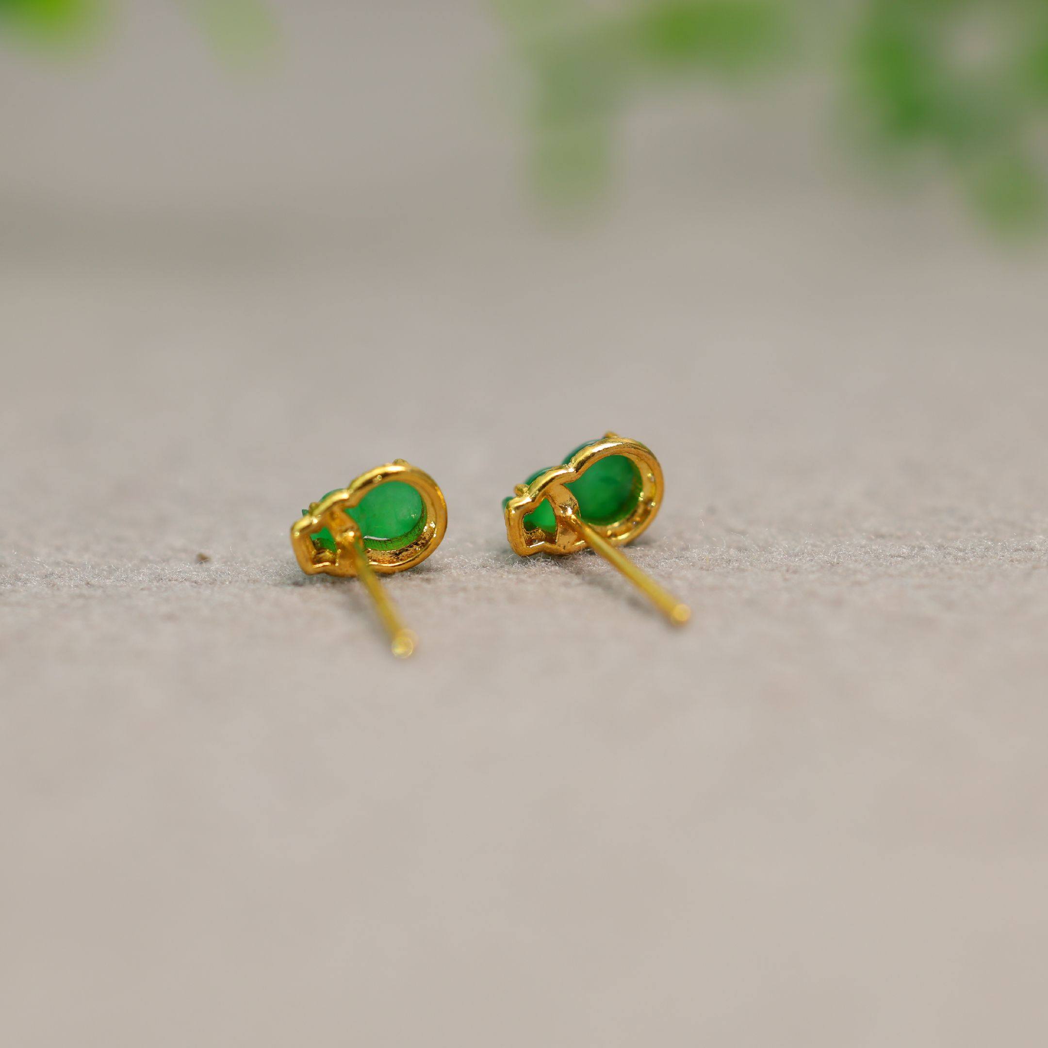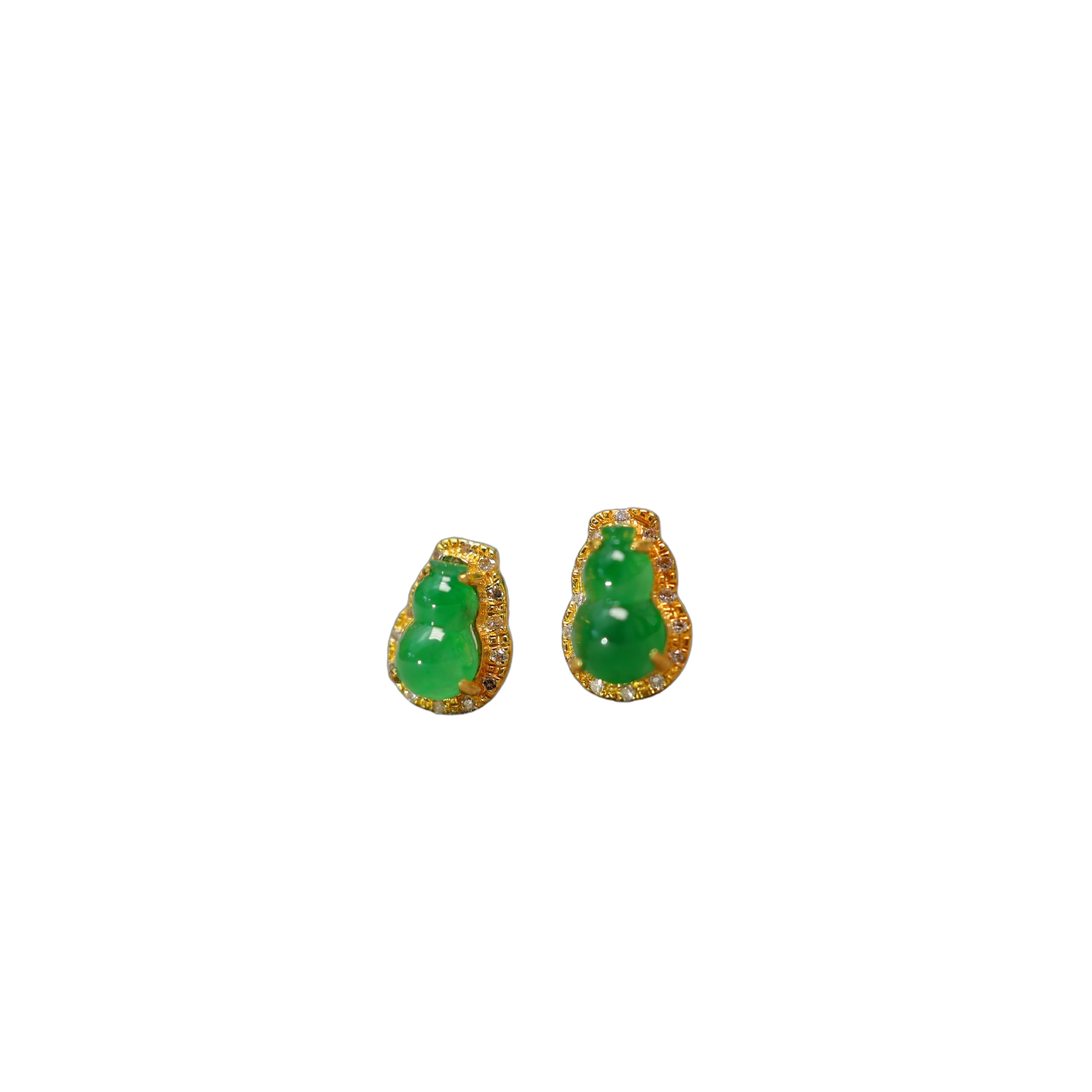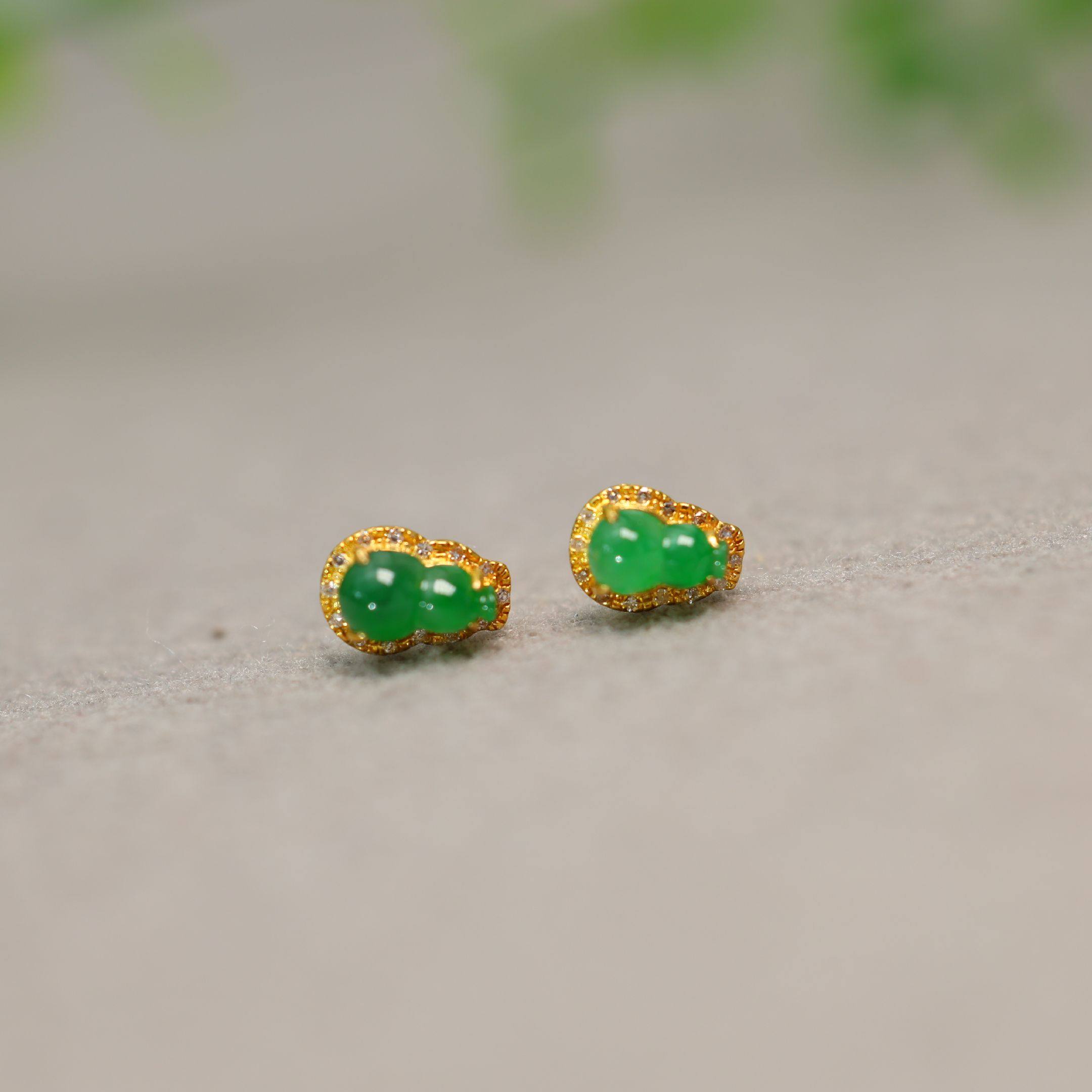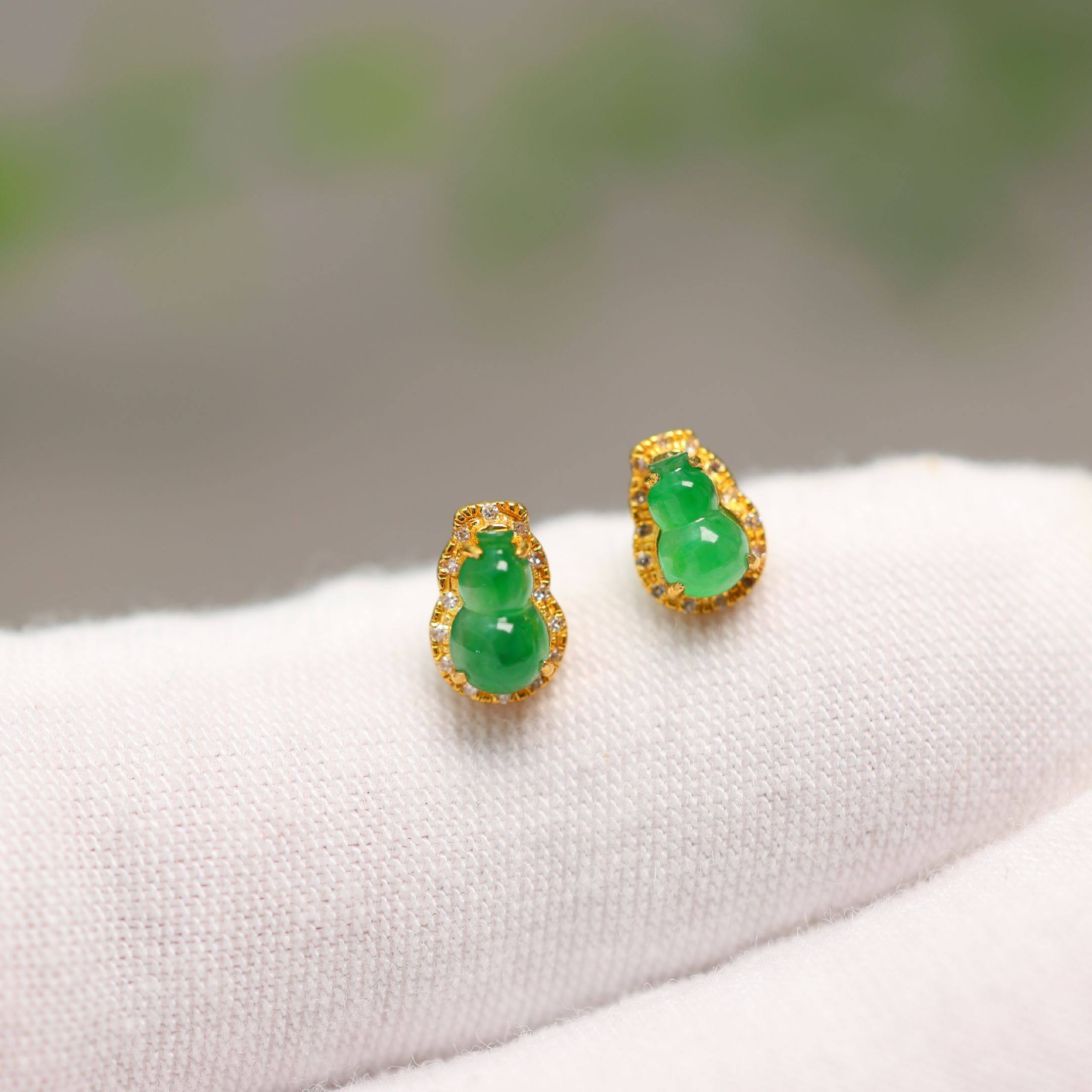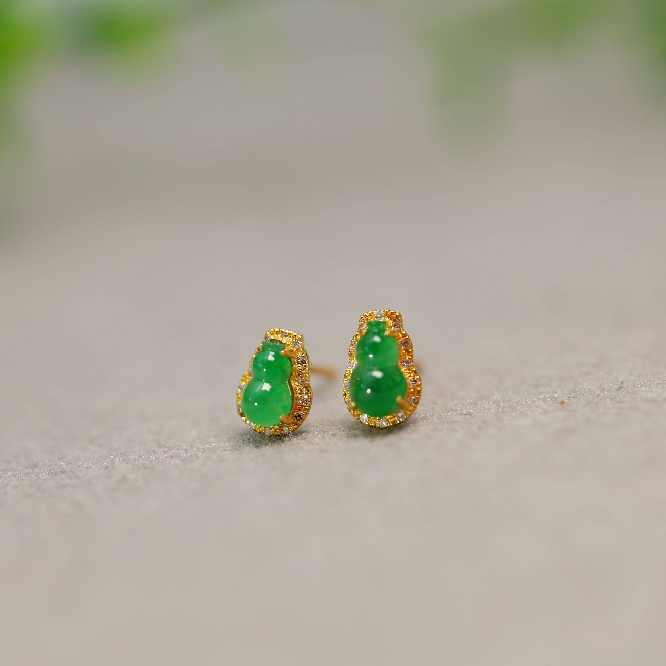#H882一对18K金加钻石镶嵌冰种阳绿天然A货翡翠葫芦耳钉耳饰
