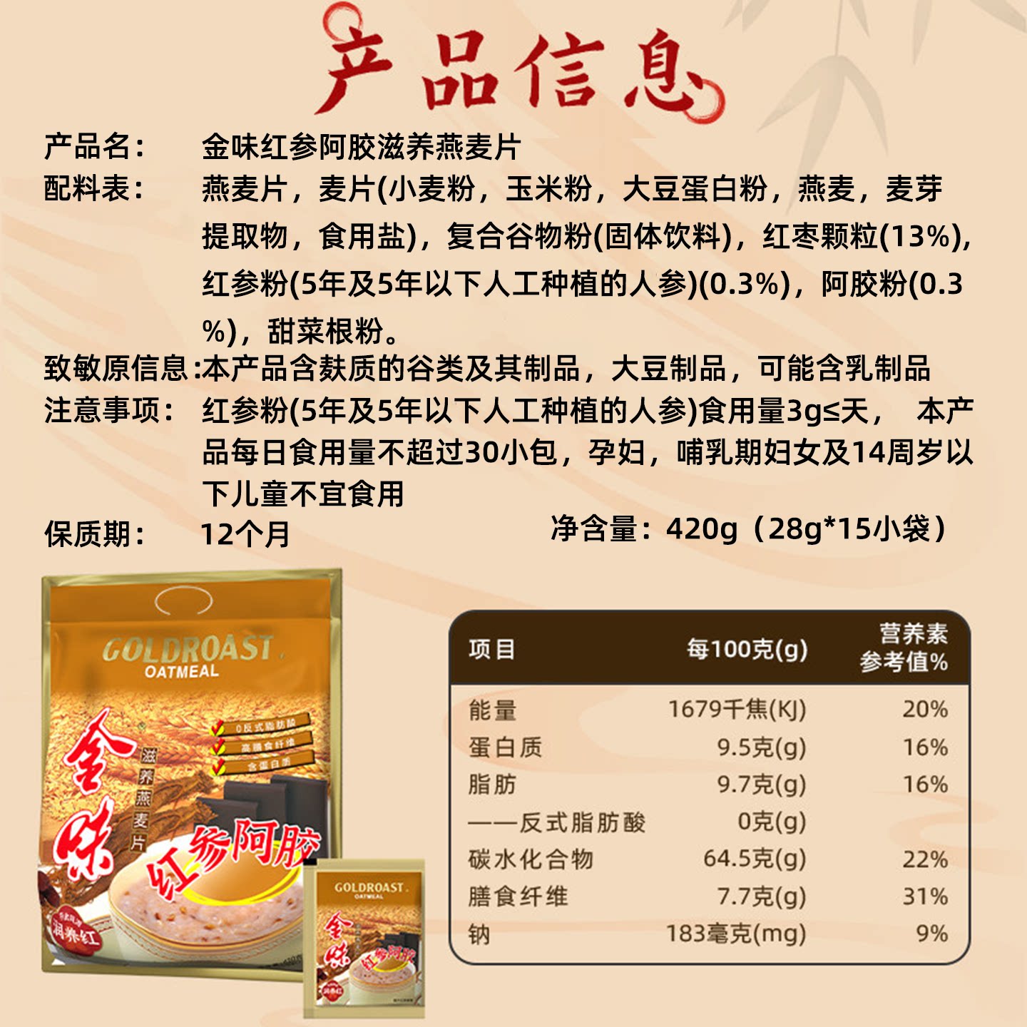【420g】金味红参阿胶滋养燕麦片营养早餐免煮即食燕麦片冲饮麦片