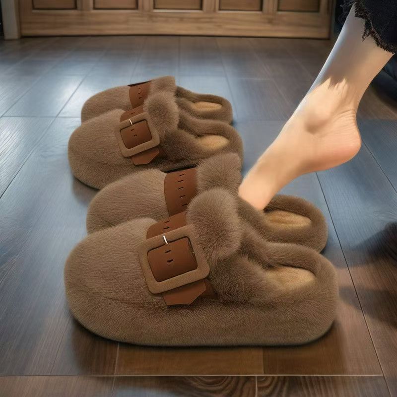 品牌真皮包头毛毛拖鞋女鞋外穿2025新款秋冬厚底软底防滑孕妇棉拖