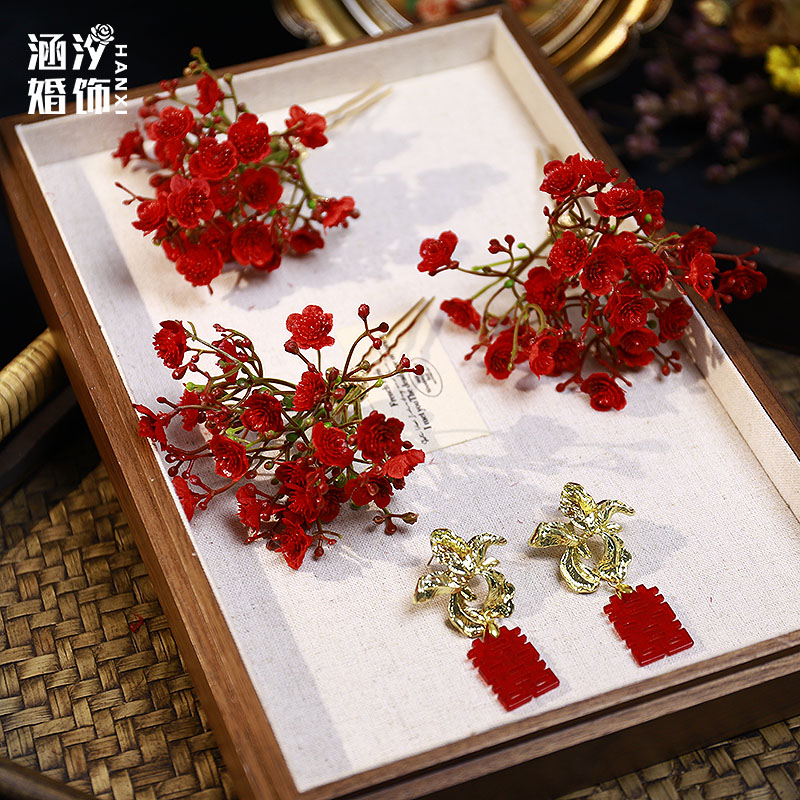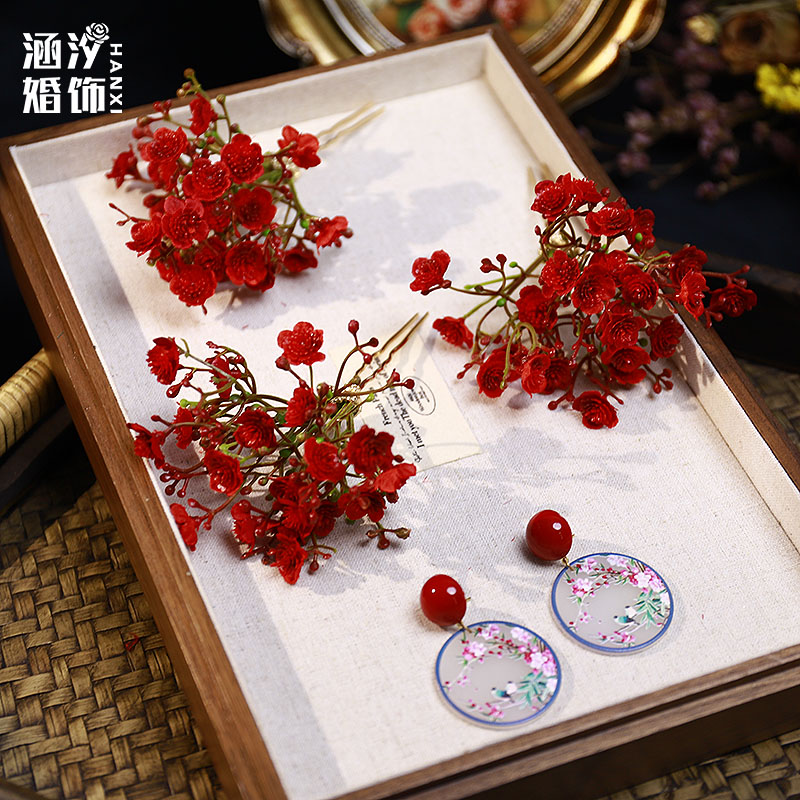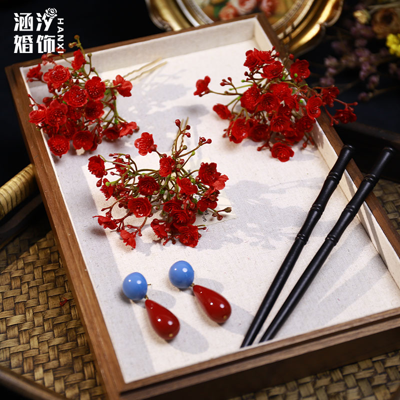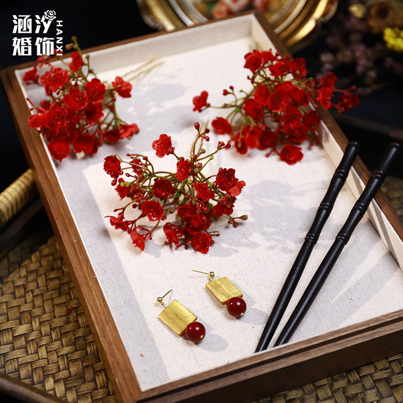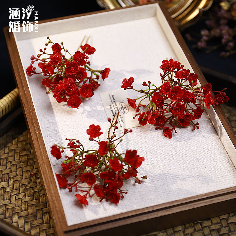 新品复古红色仿真花朵发簪森系甜美敬酒服旗袍汉服古风百搭发饰品