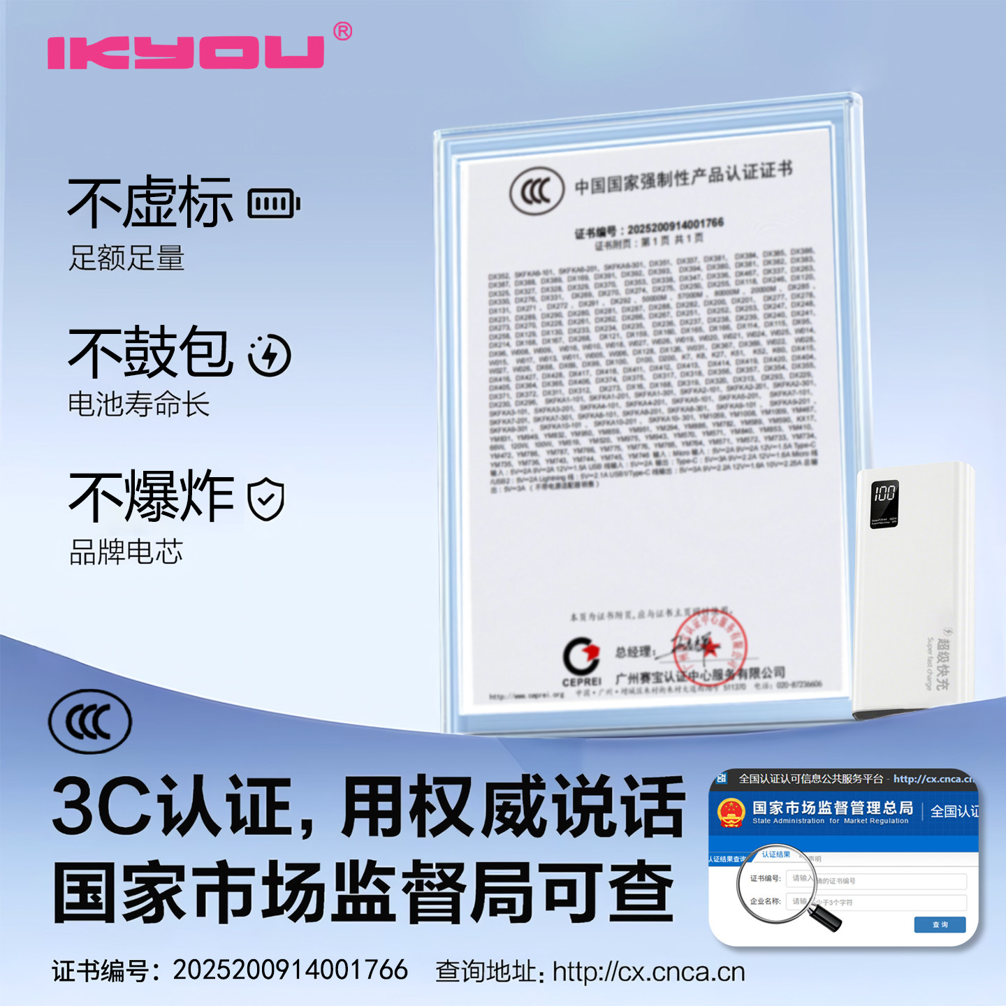 【充电宝3C认证可上飞机】IKYOU充电宝20000毫安三合一快充线适用华为超级快充苹果17大容量新款便携移动电源