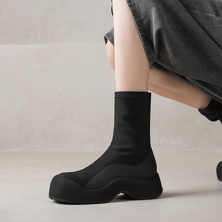 圆头松糕底tpu春秋头层猪皮弹力靴/袜靴