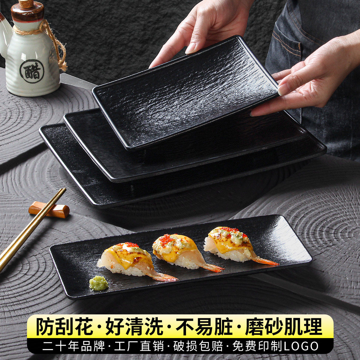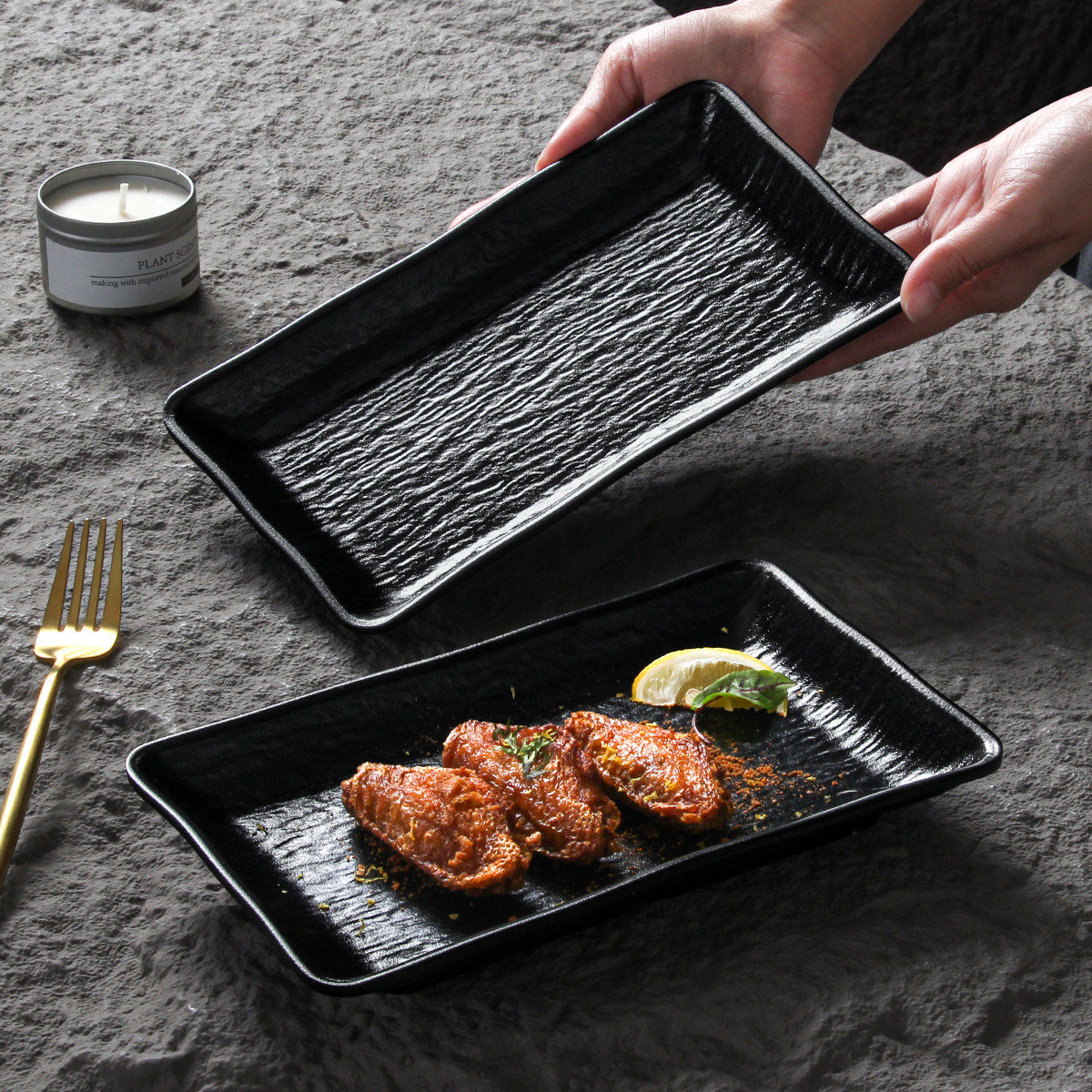 祥源美密胺餐具烧烤专用盘子长方形黑色商用火锅烤肉摆盘餐盘菜盘