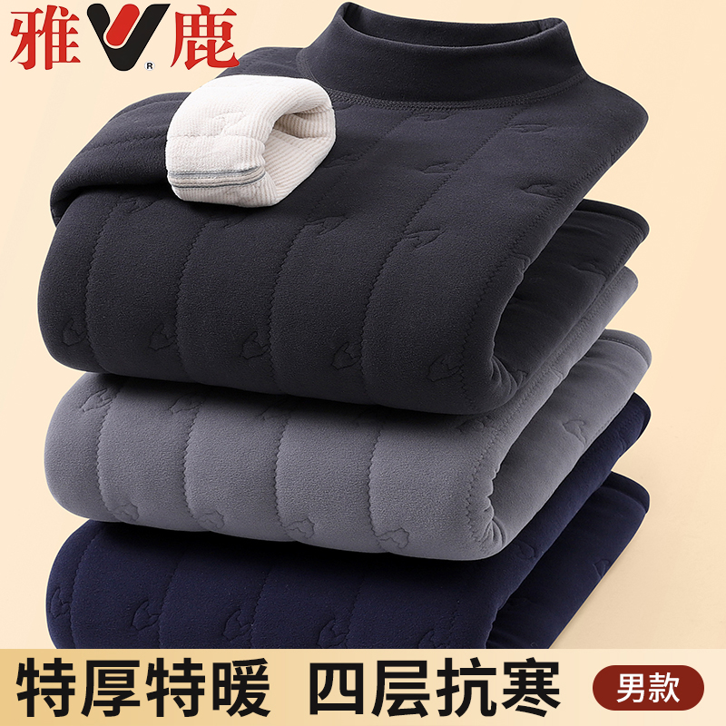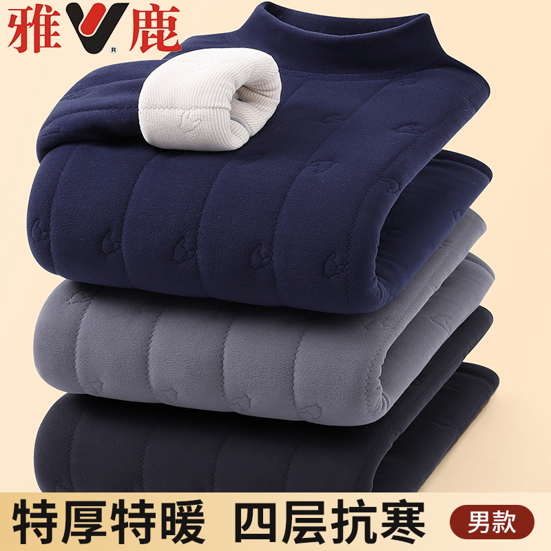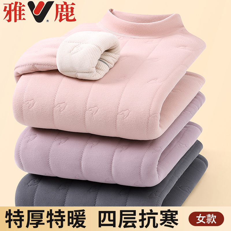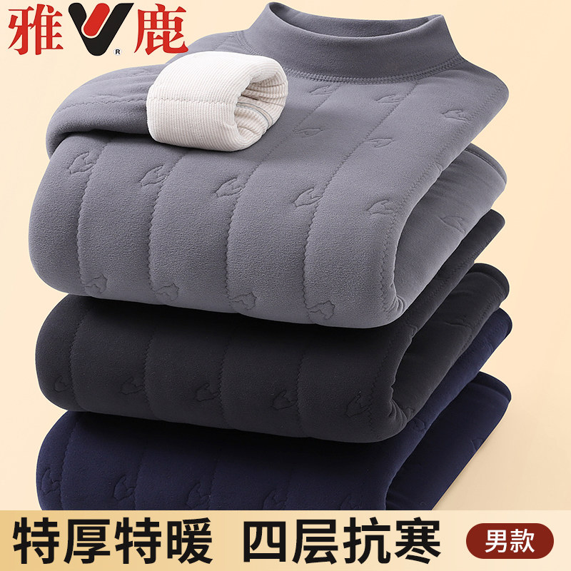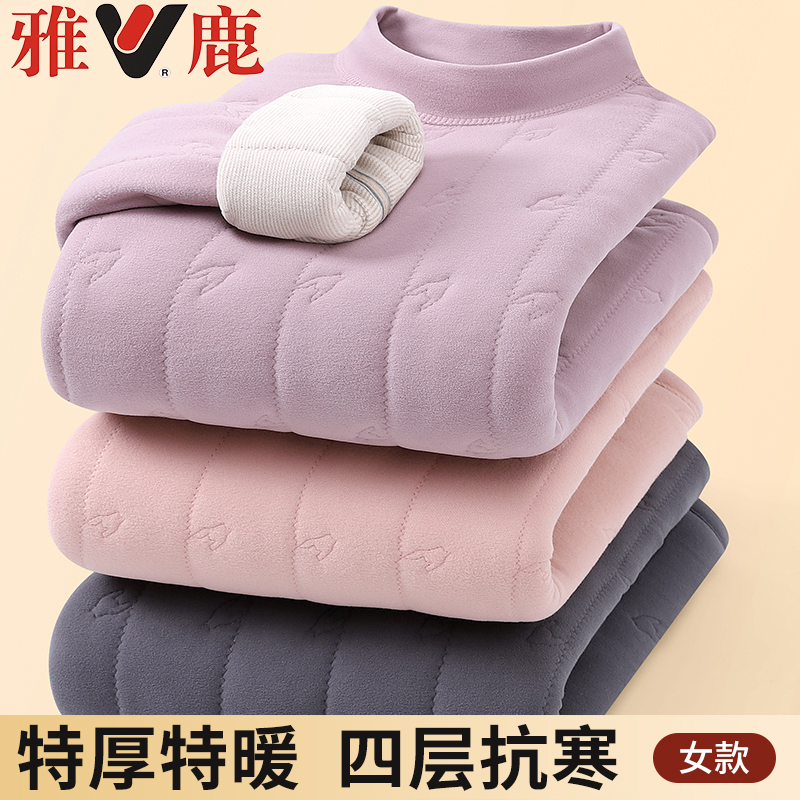 雅鹿保暖单衣100%棉羊绒填充家居服上衣冬季加绒内衣男女士打底衫