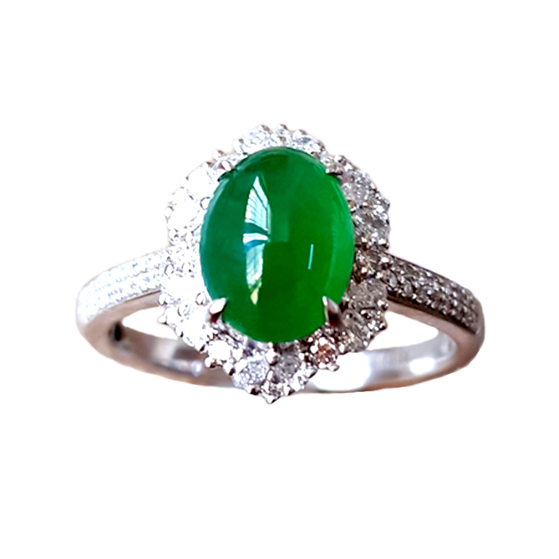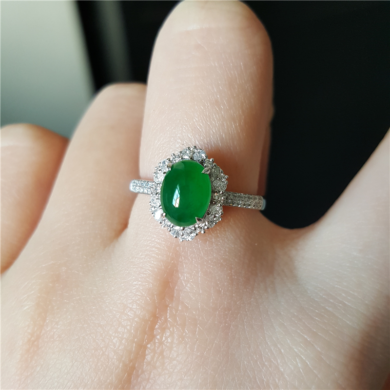 汉桑原创翡翠戒指18K金钻石镶嵌冰种阳绿蛋面指环女金镶玉戒指