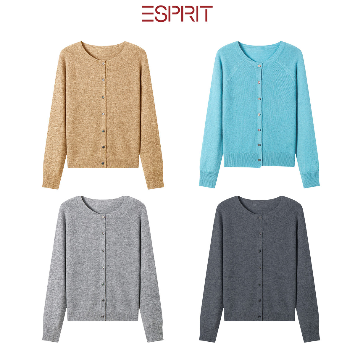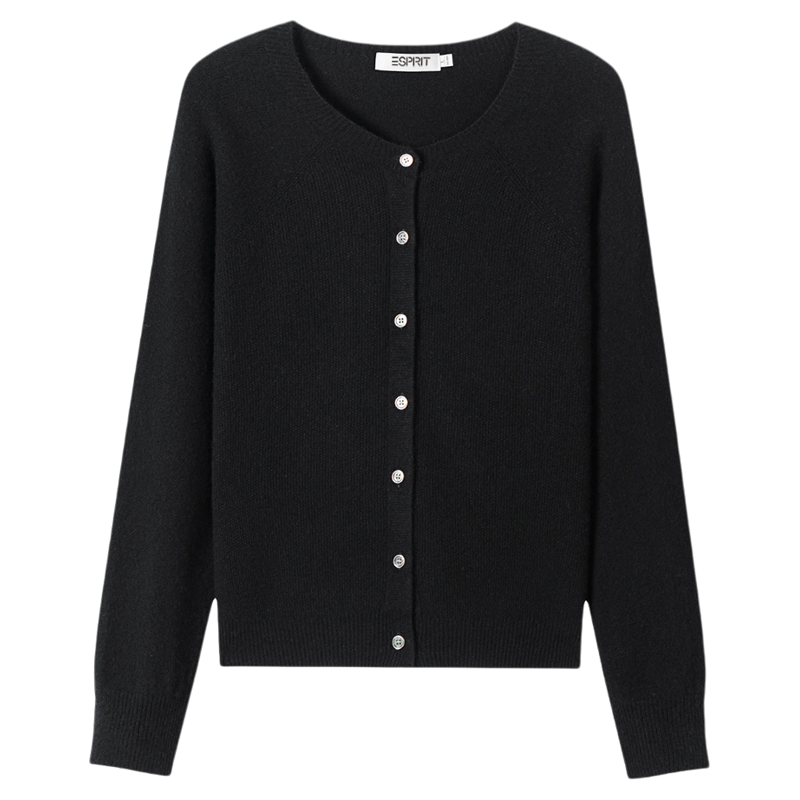 ESPRIT/埃斯普利特100%羊毛绒开衫女圆领针织衫百搭显瘦毛衣外套