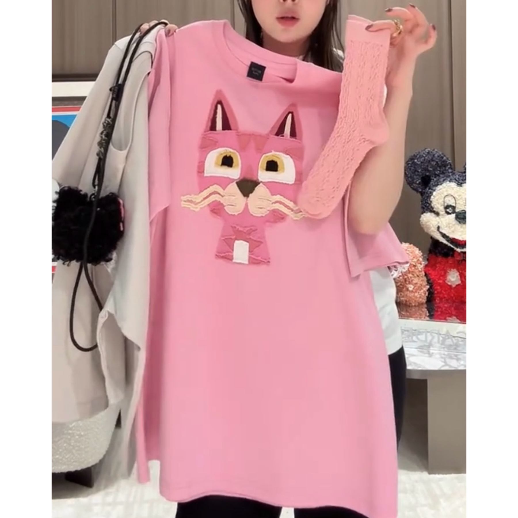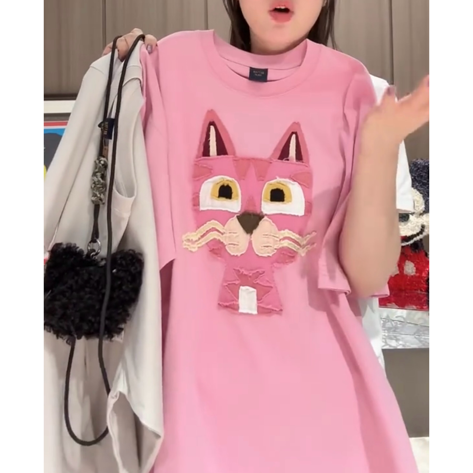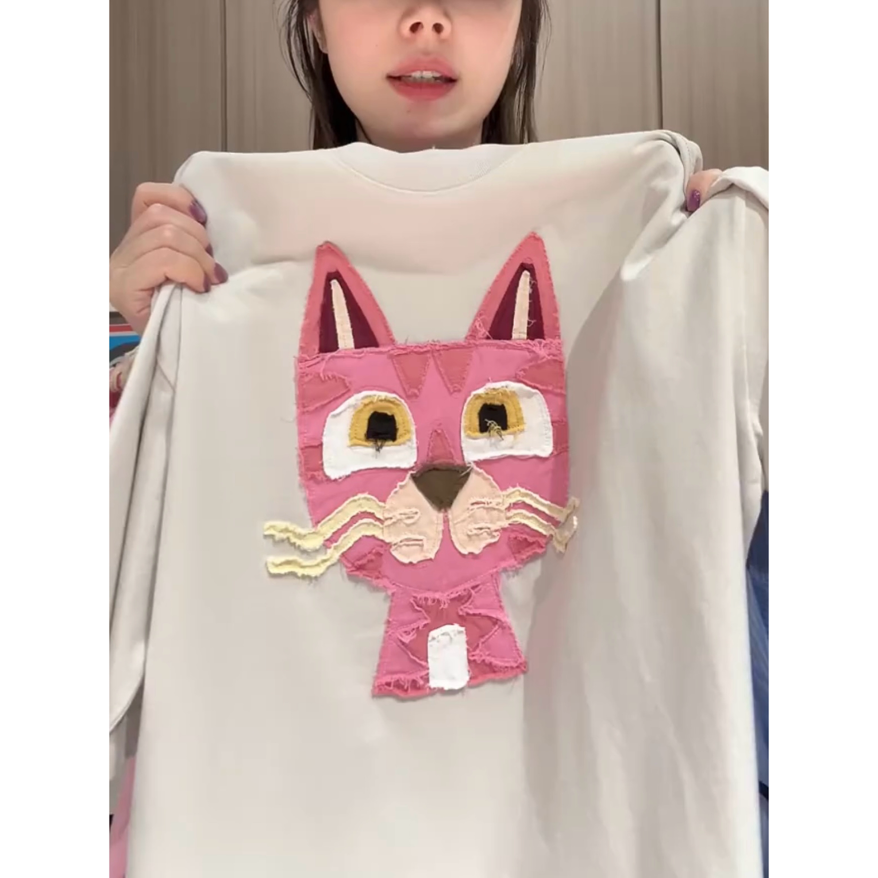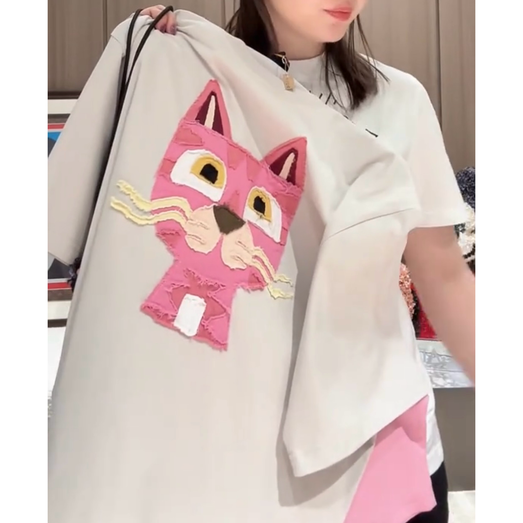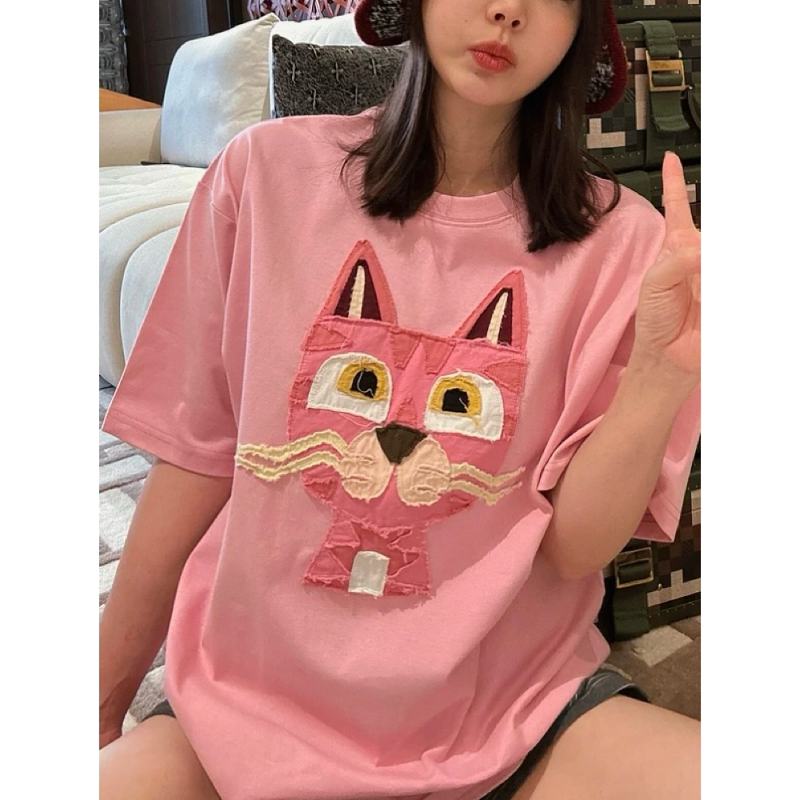 重工小花猫贴布绣短袖T恤女2026夏季新款宽松百搭显瘦中长款上衣