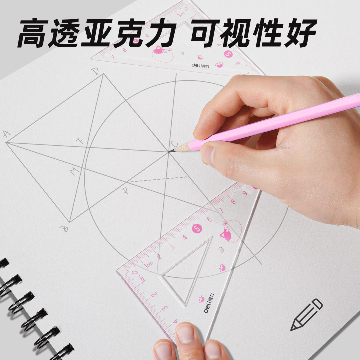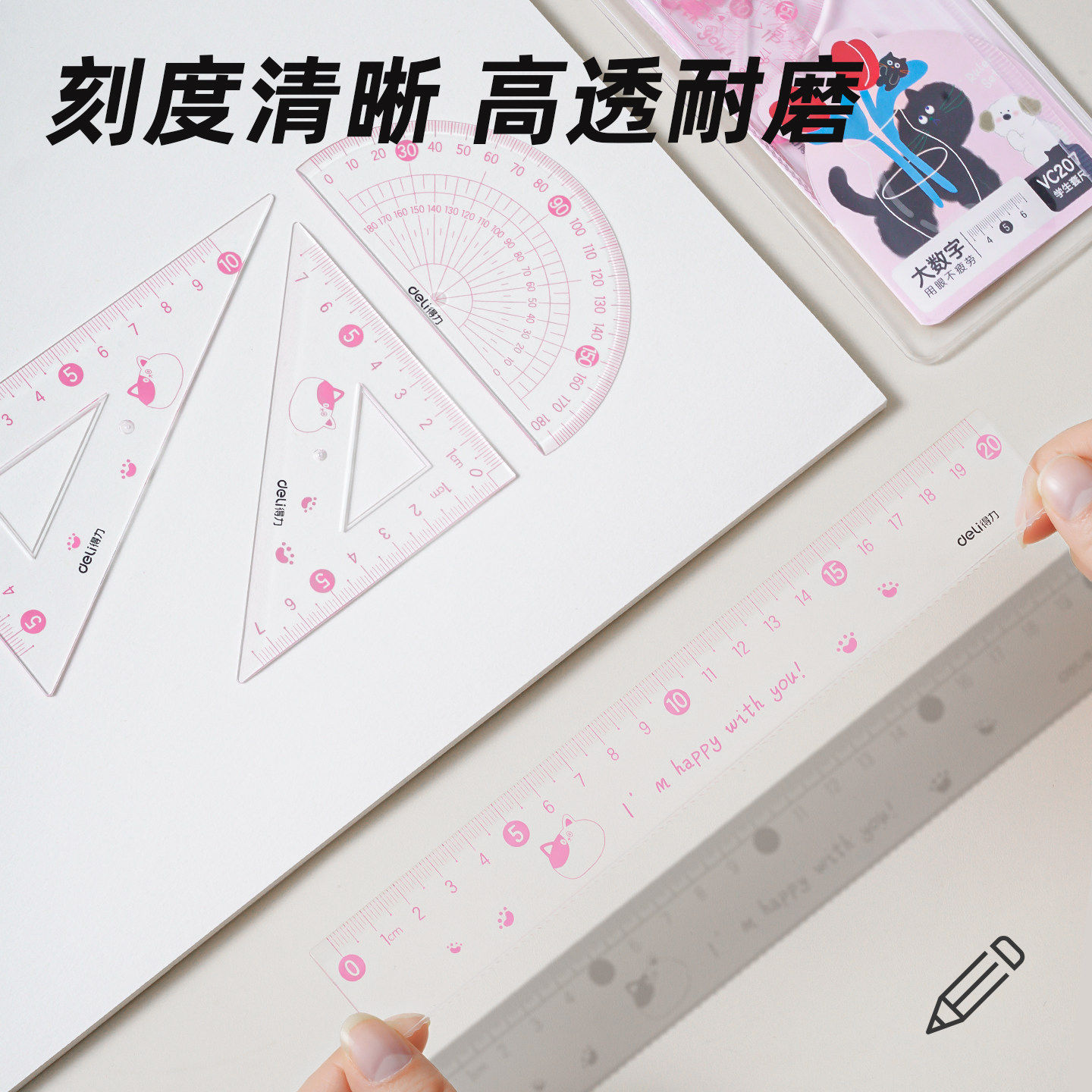 得力15/20cm套尺高透清晰学生专用大数字护眼尺高透明三角板量角器多功能套装尺子套装简约四件套各类尺子