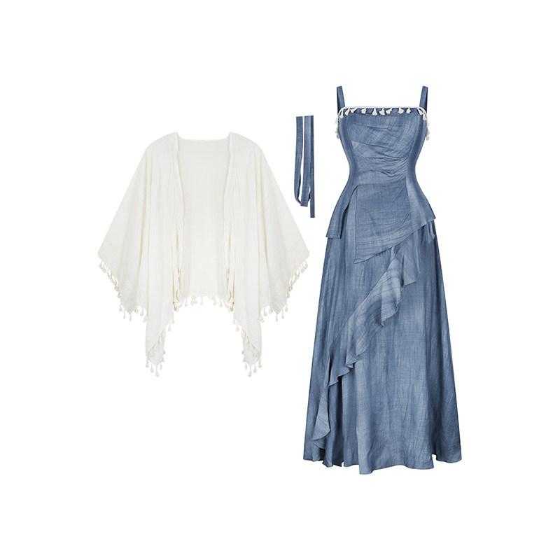 安妮不火 民族风流苏穗仿荷叶边吊带连衣裙微胖大码度假风两件套