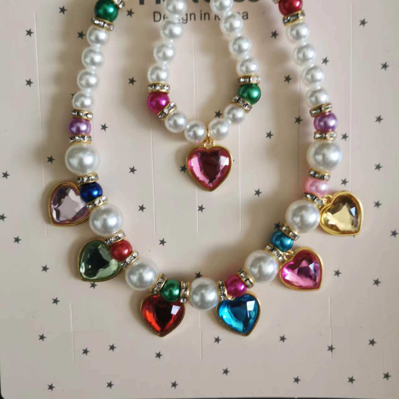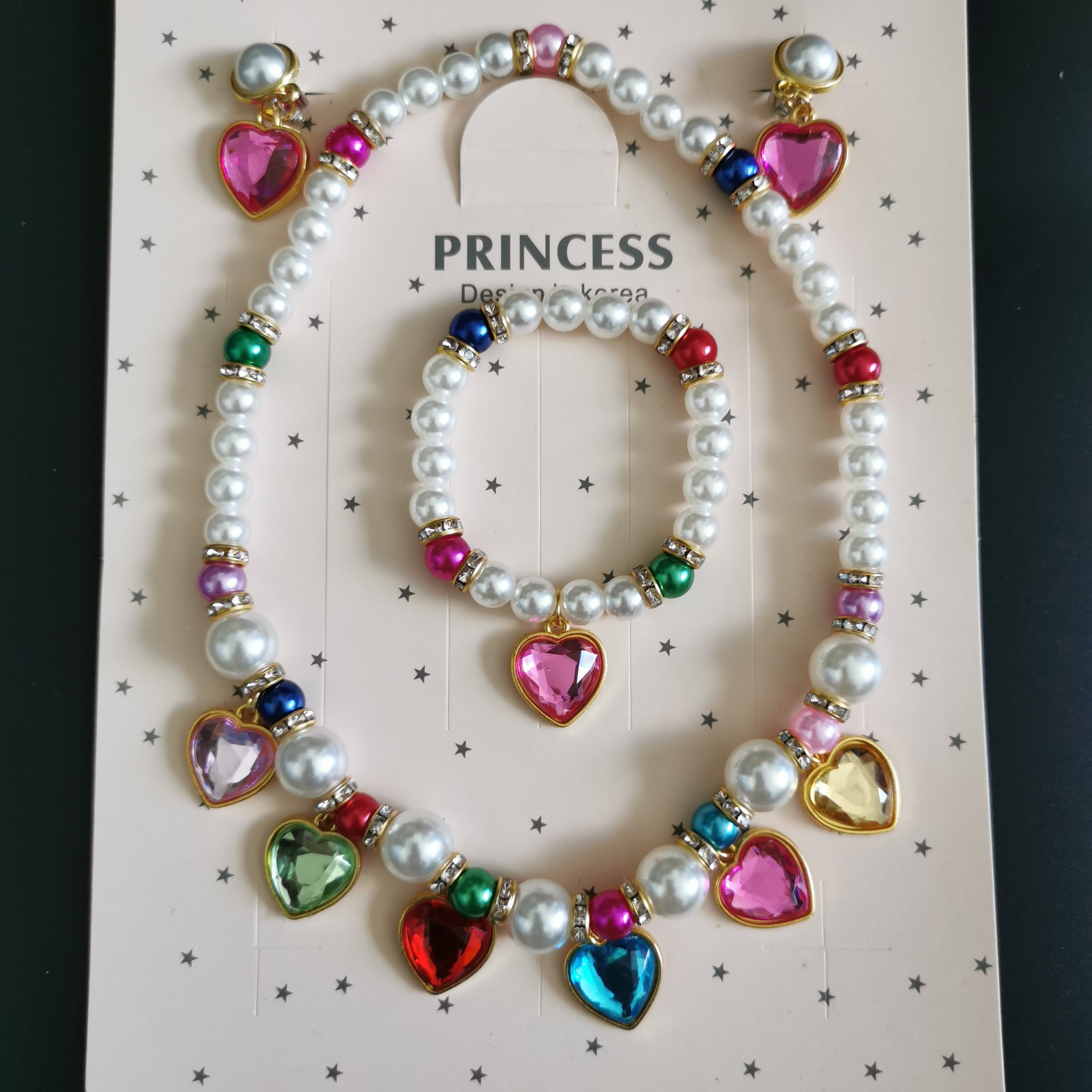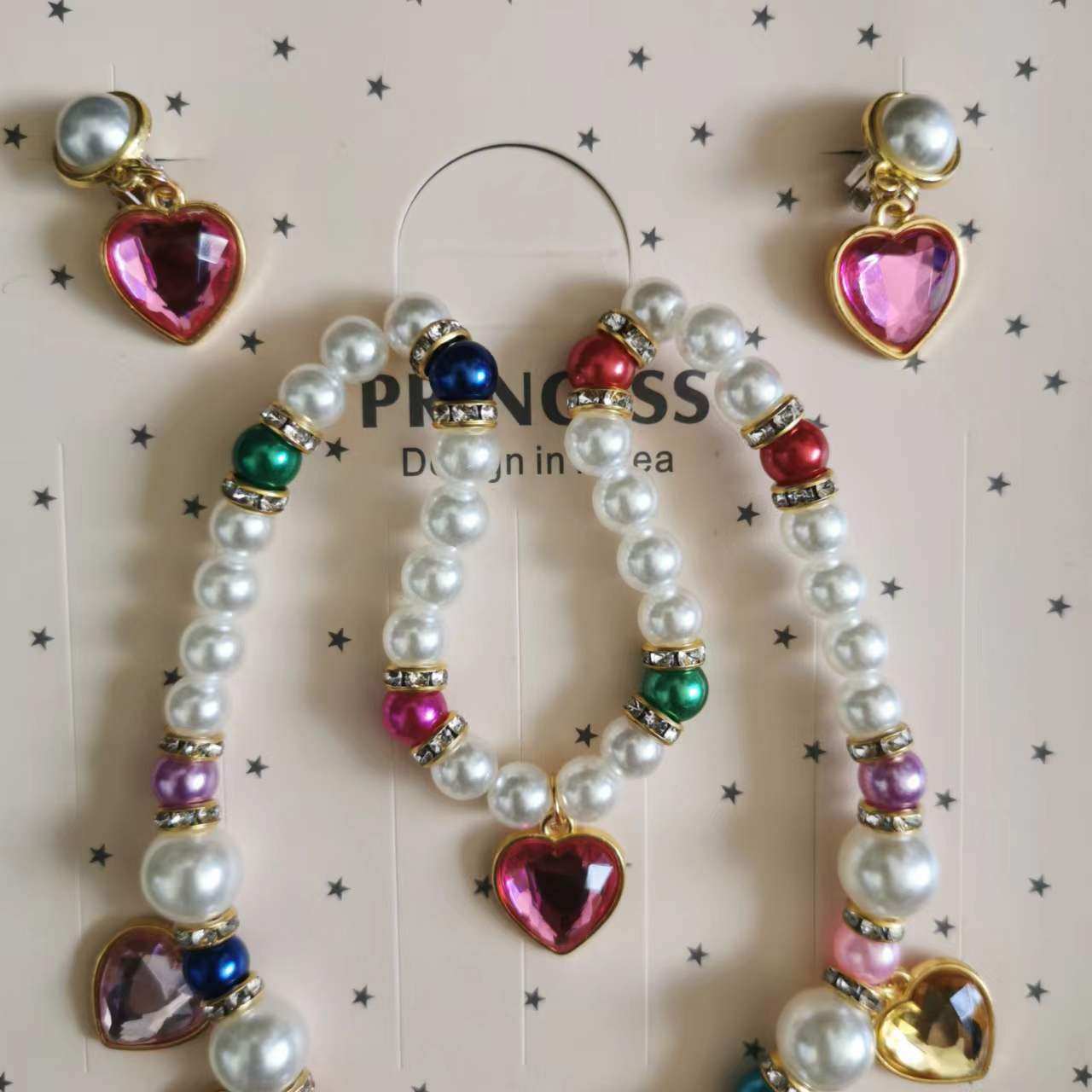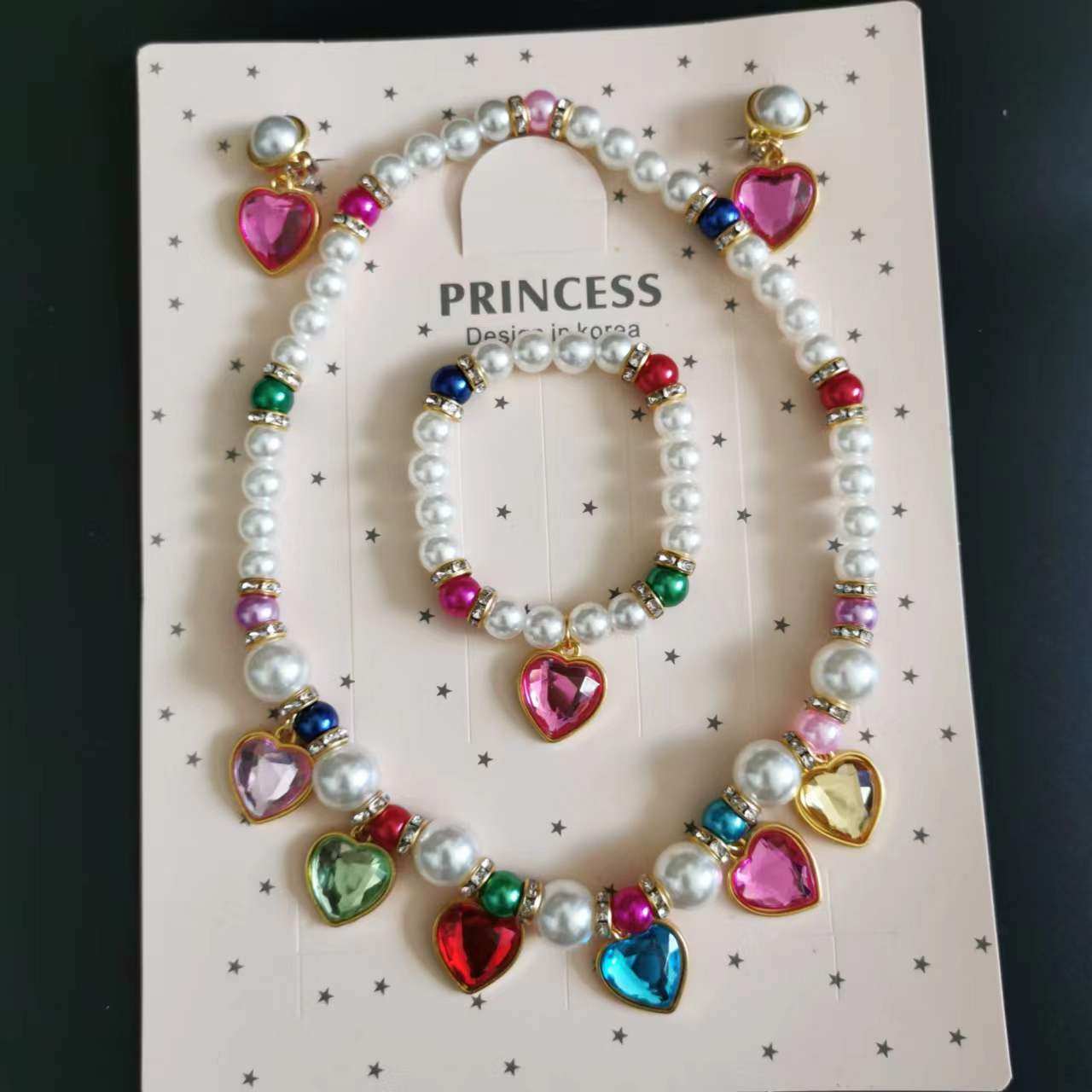 儿童小公主仿珍珠色彩项链手链耳夹三件套装宝宝节日节目饰品礼物