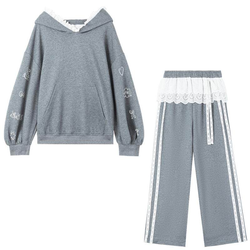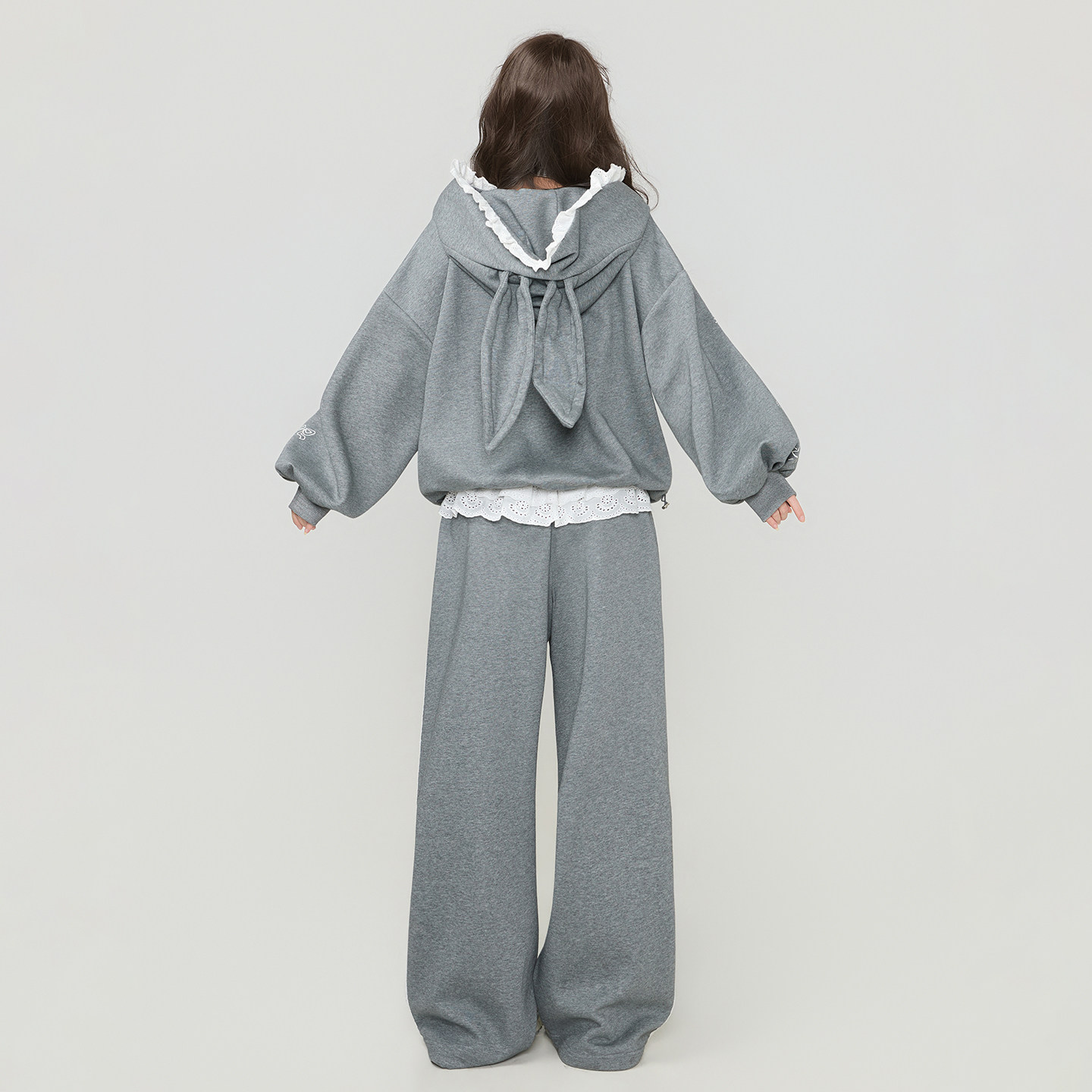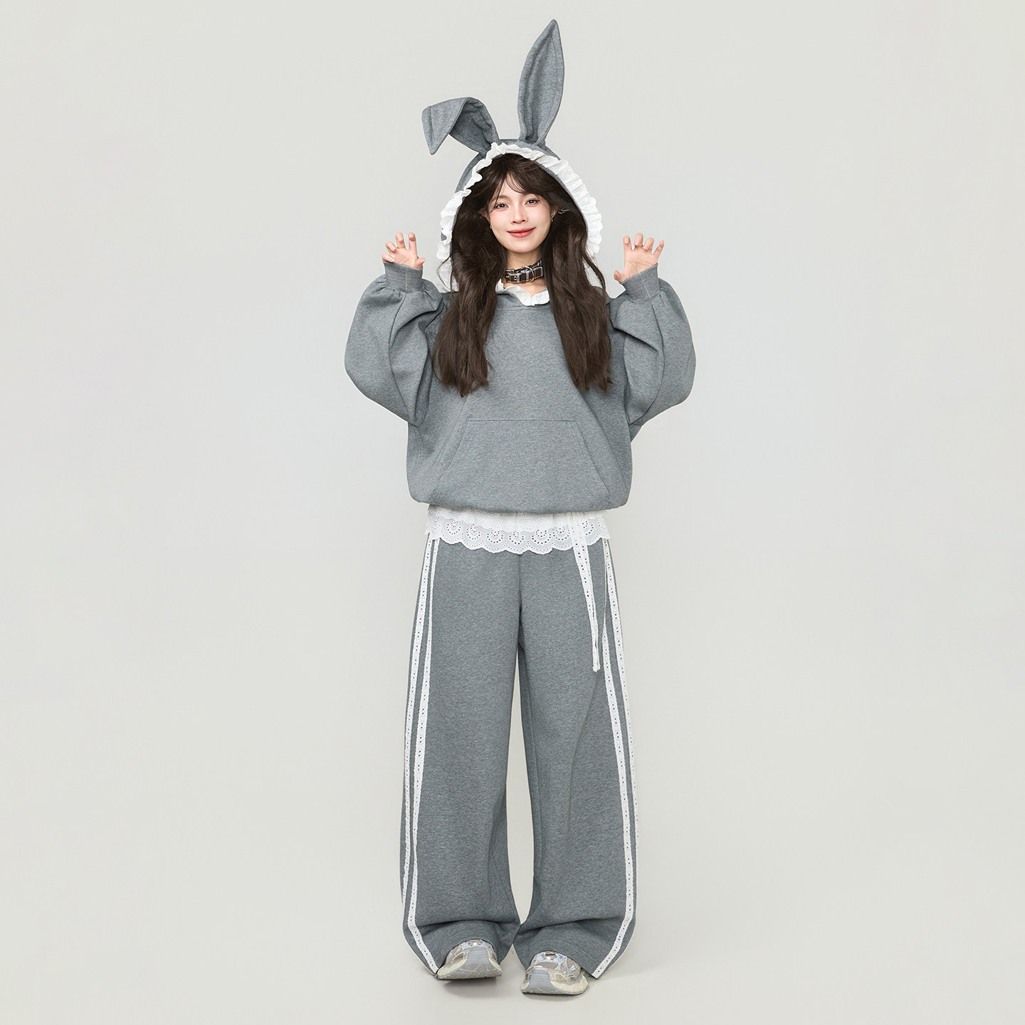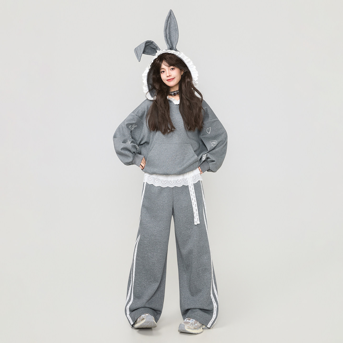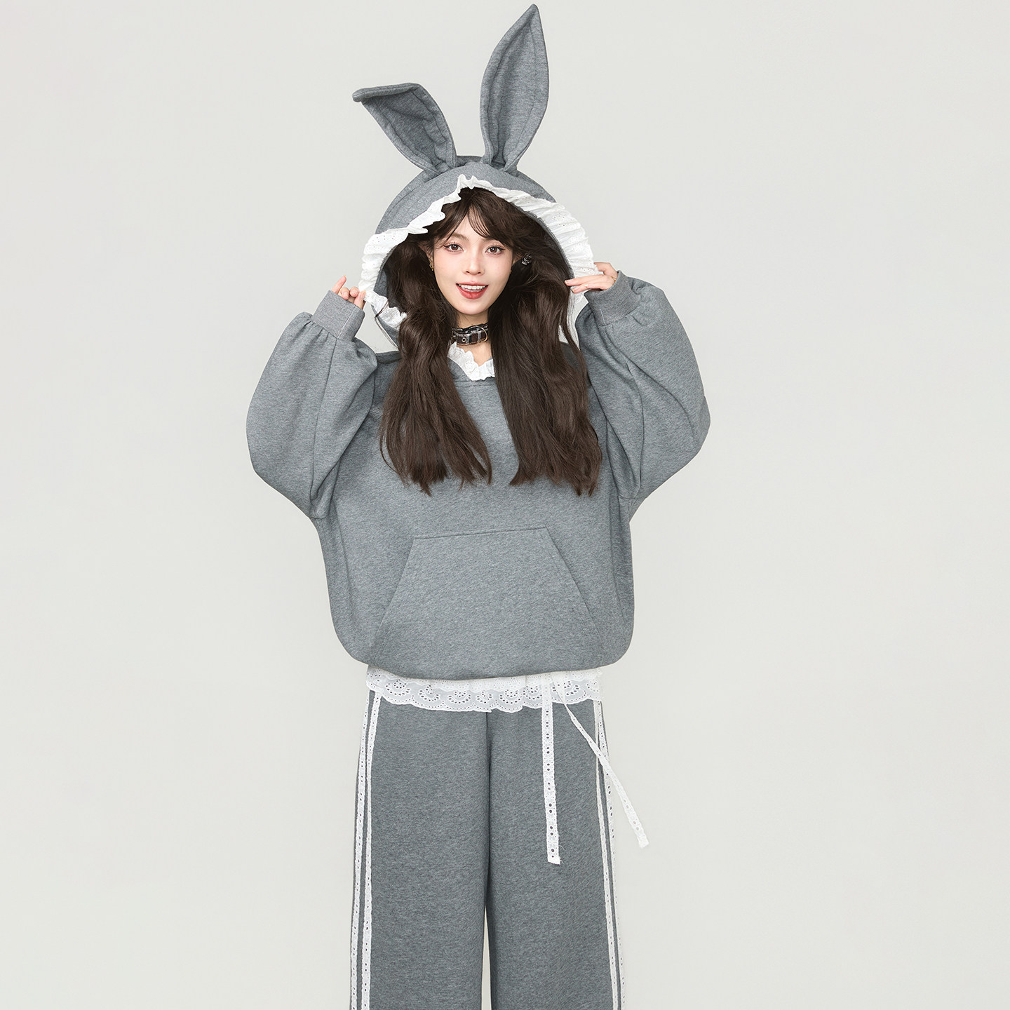 KEIKO 少女风蕾丝花边运动卫衣套装26春季兔耳朵连帽外套+休闲裤