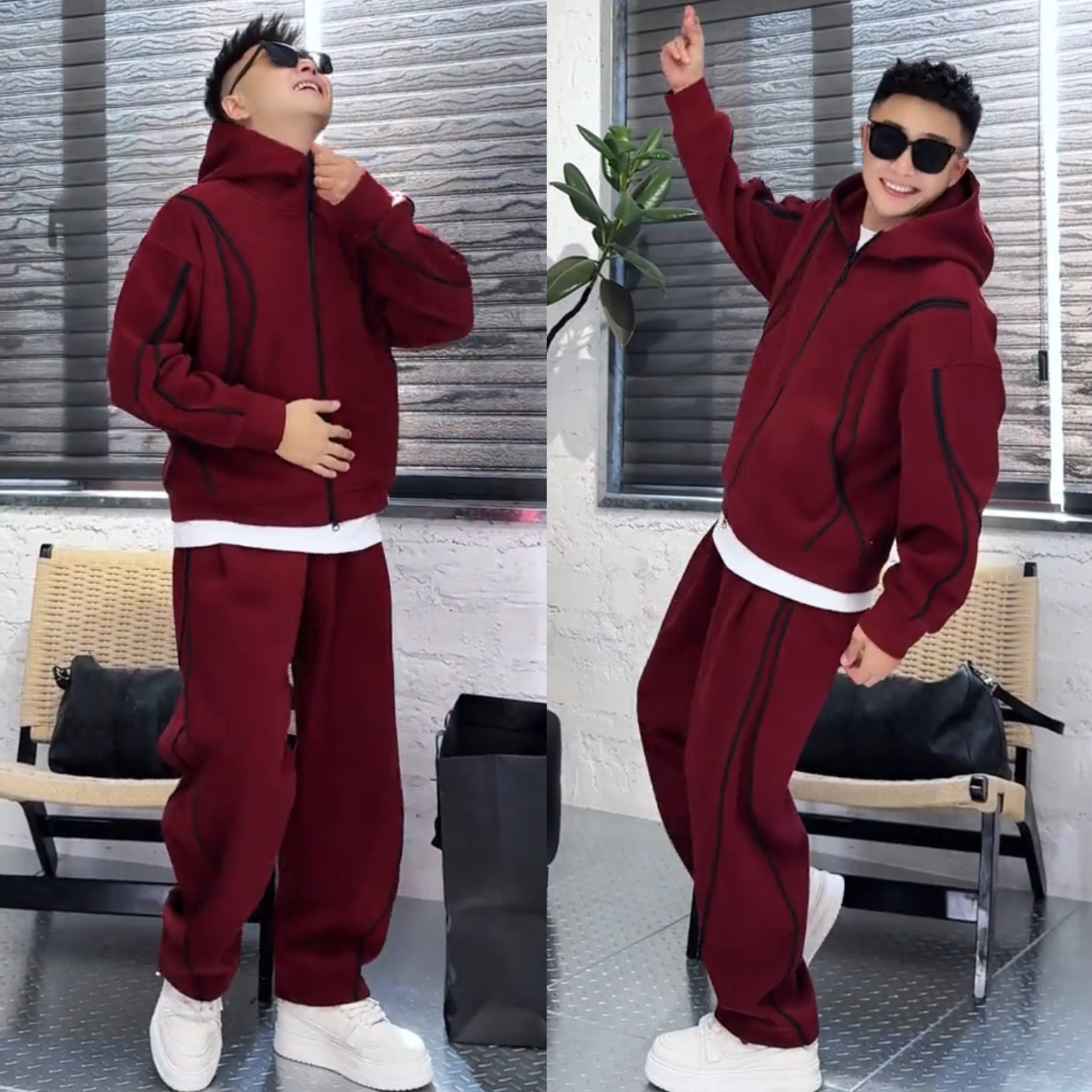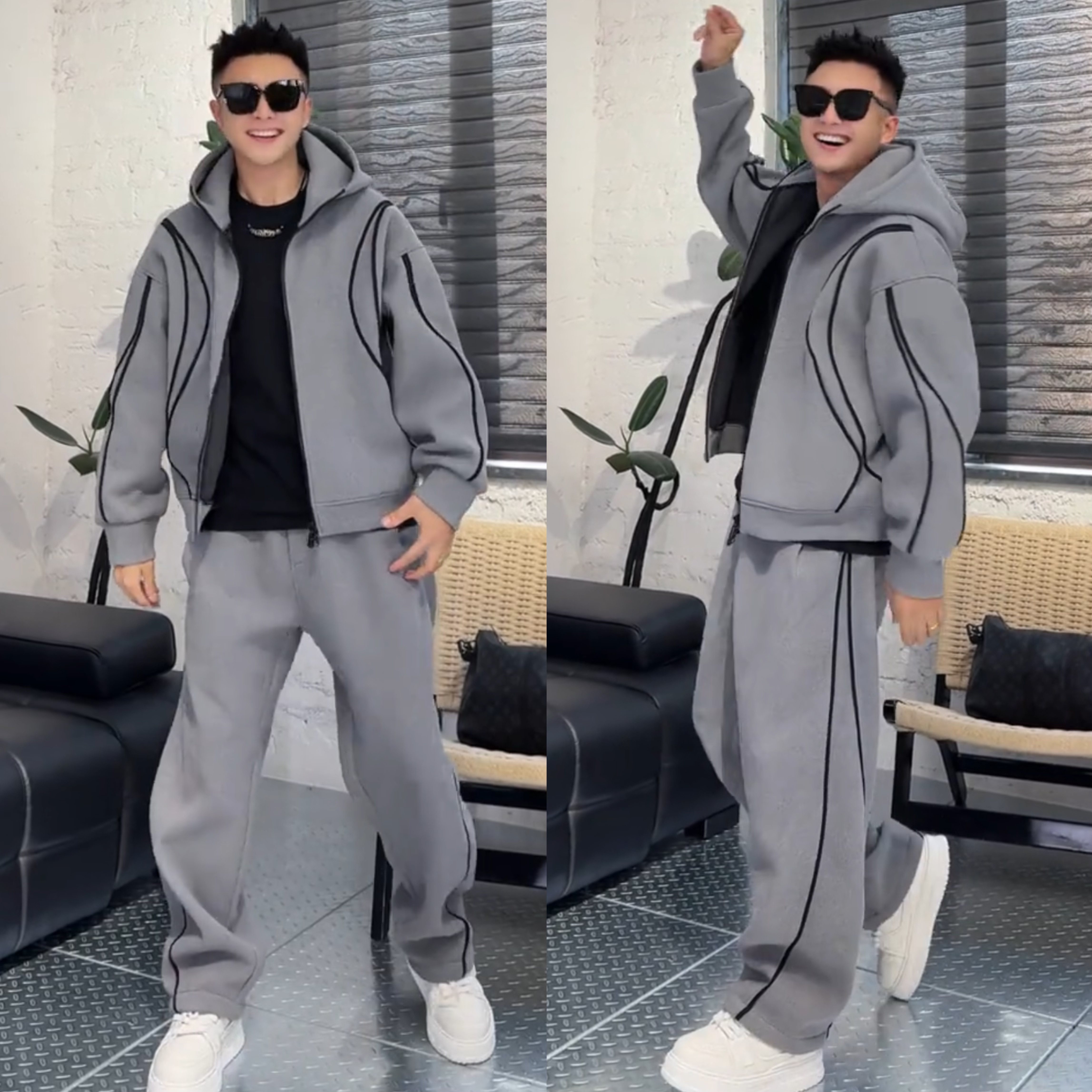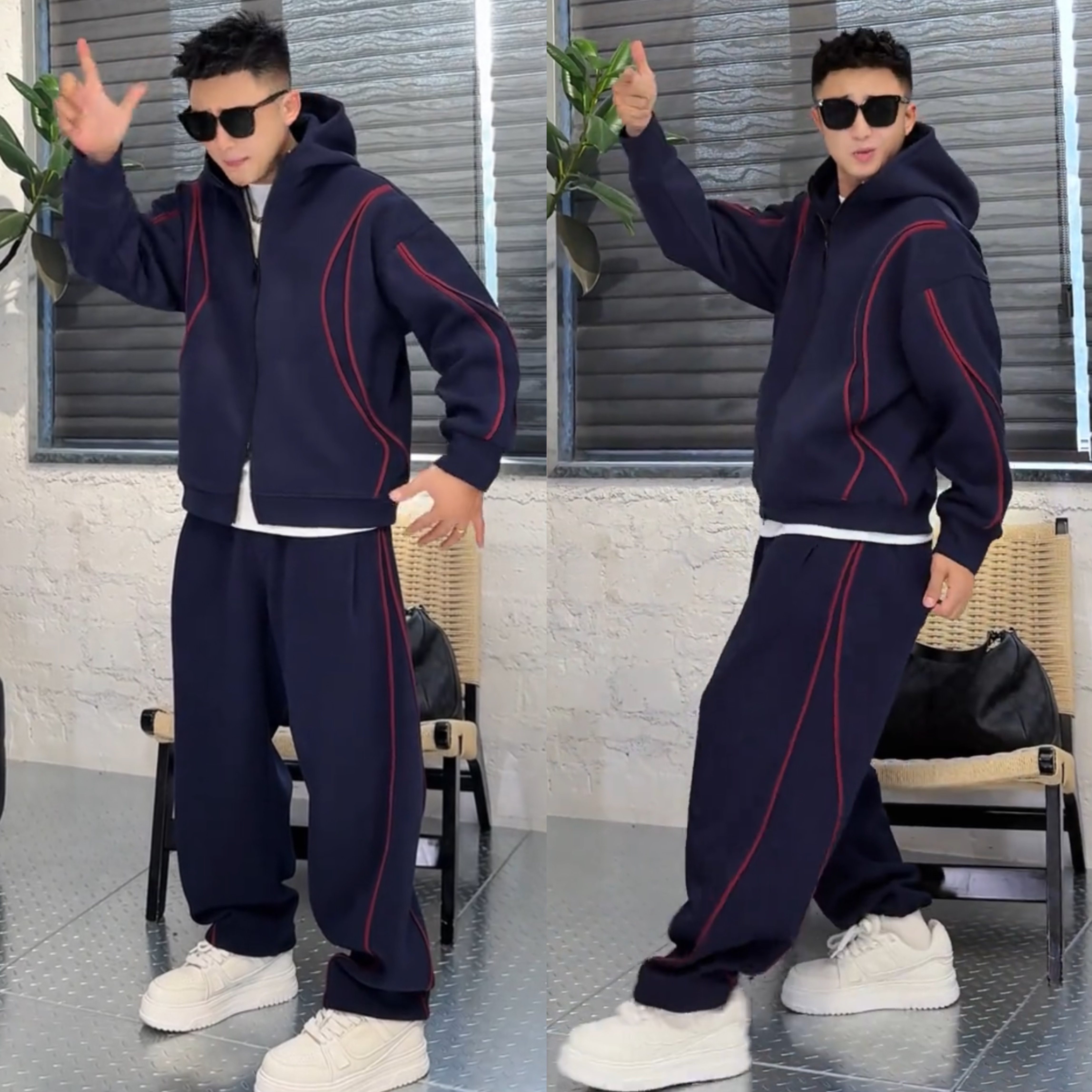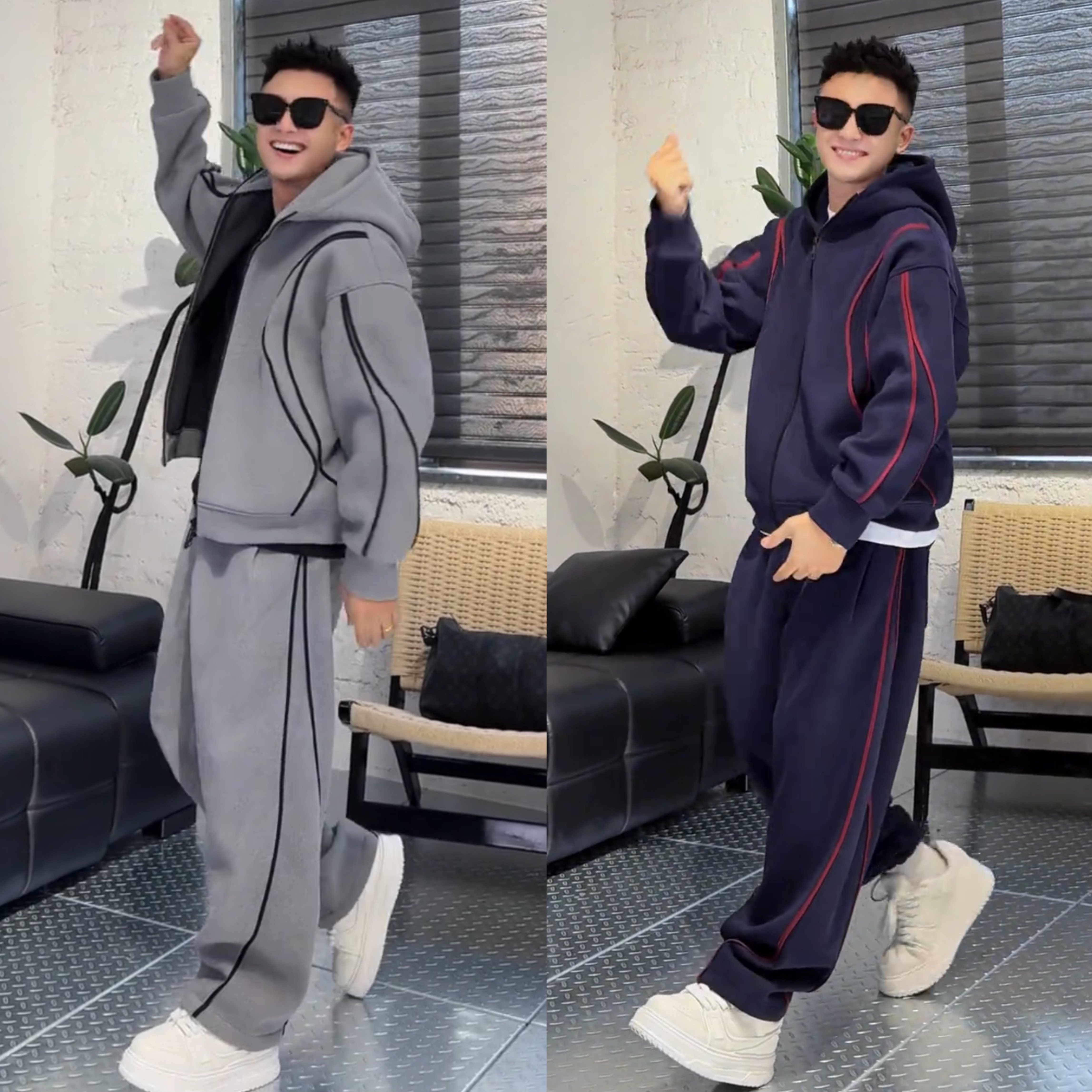 秋冬新款重磅加绒加厚套装男士时尚百搭保暖连帽外套休闲裤两件套
