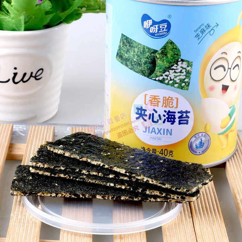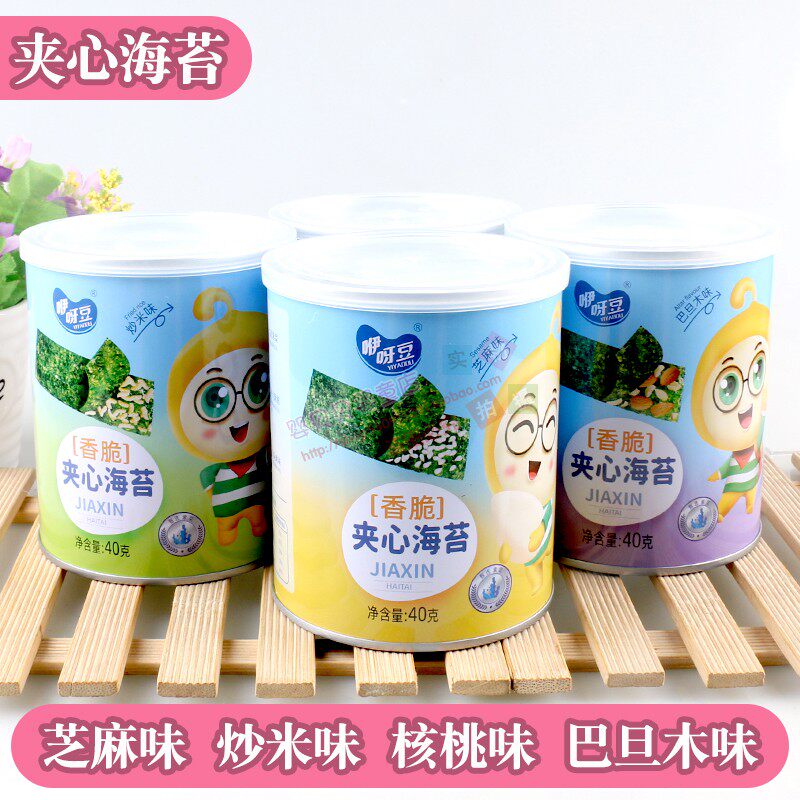 咿呀豆夹心海苔脆40克罐装芝麻炒米巴旦木核桃味儿童休闲食品零食