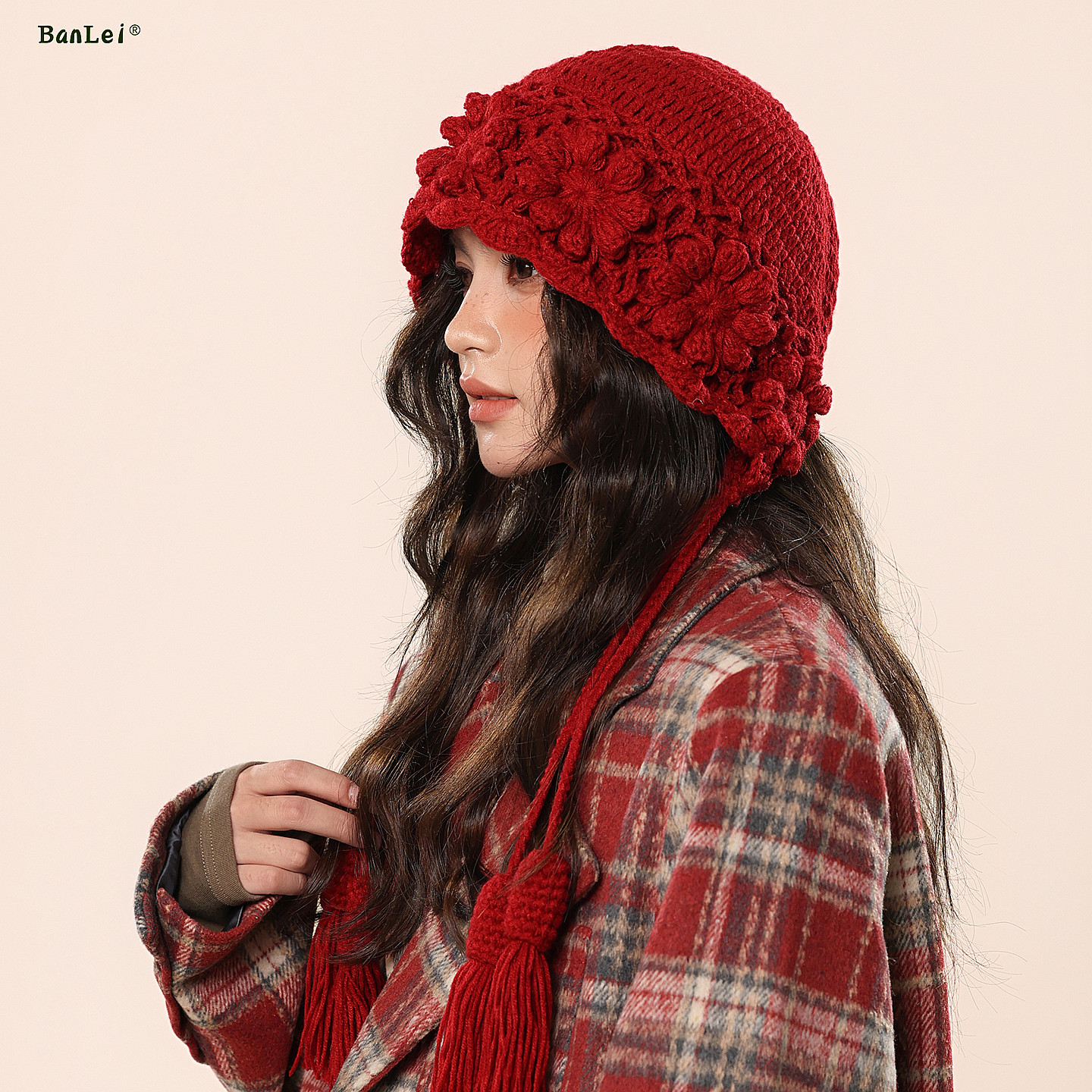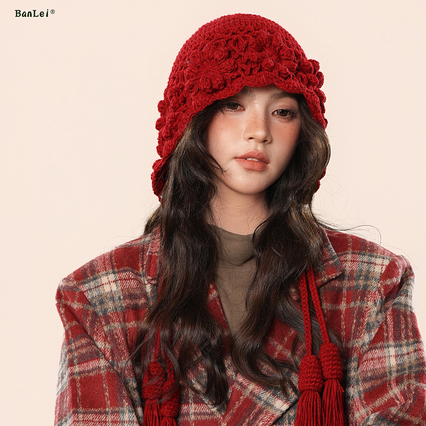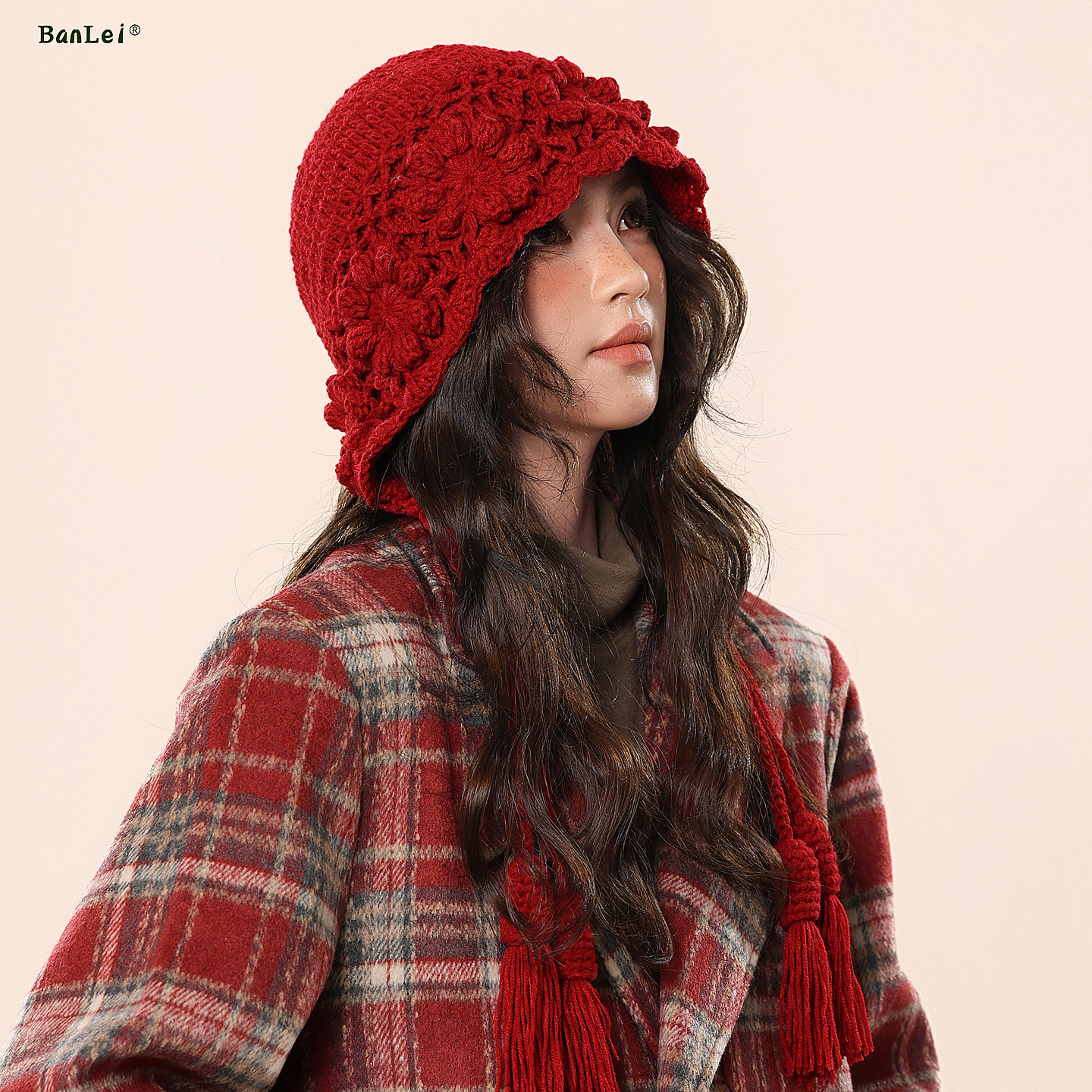 新款红色镂空针织帽子女秋冬显脸小包头冷帽民族风流苏手工毛线帽