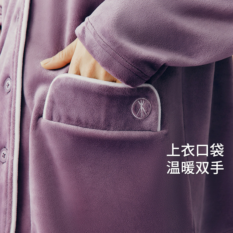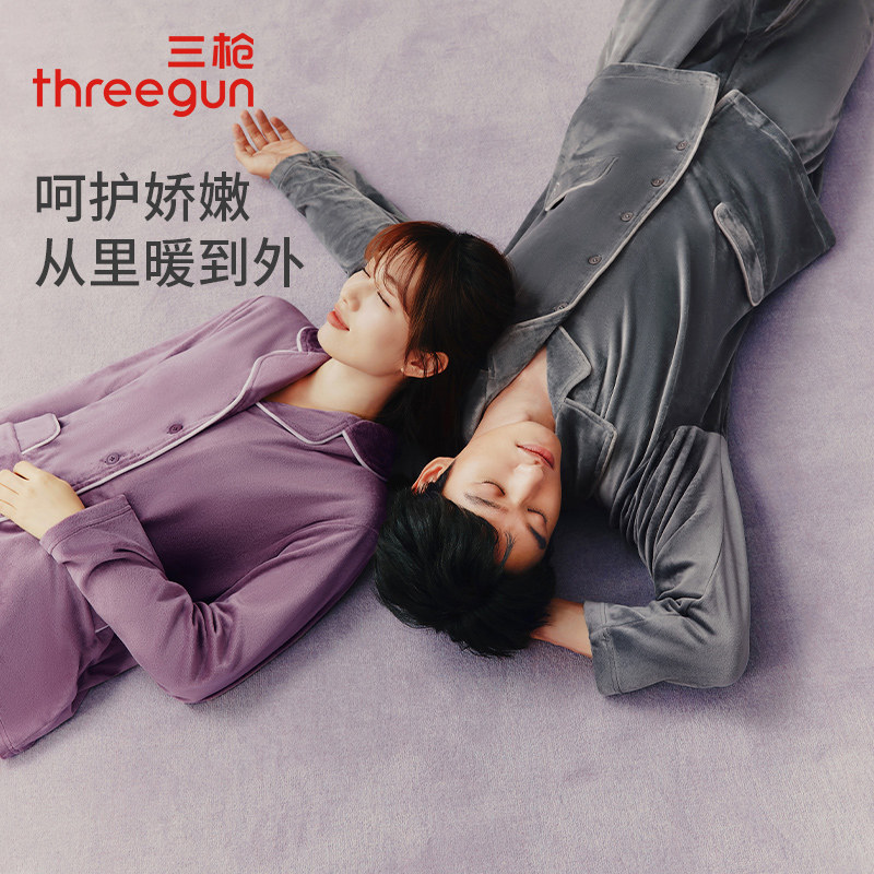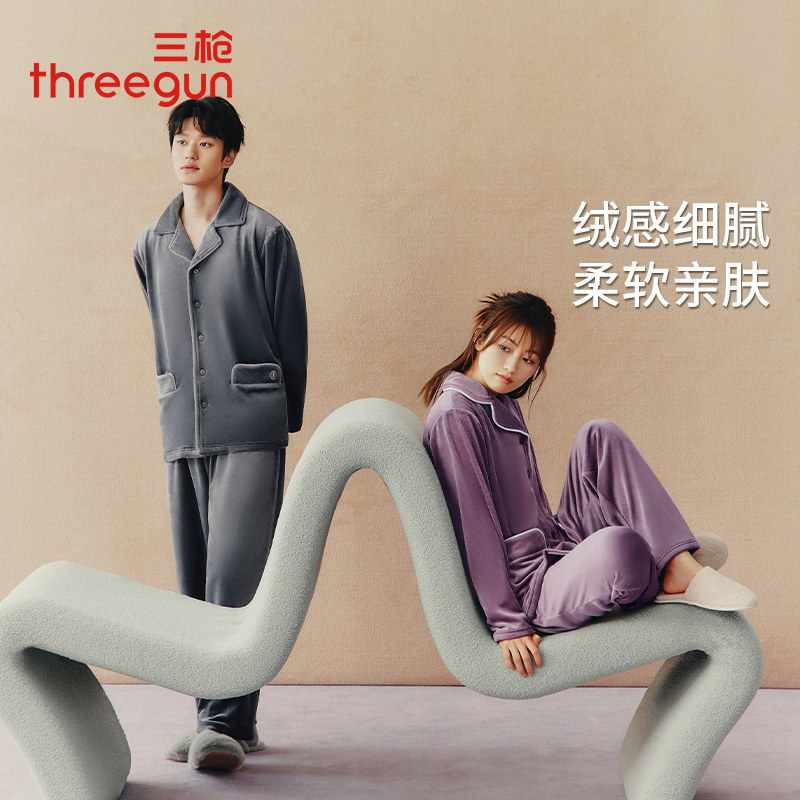 三枪秋冬家居服男士婴儿绒翻领开襟长袖睡衣睡裤女士情侣款82223D