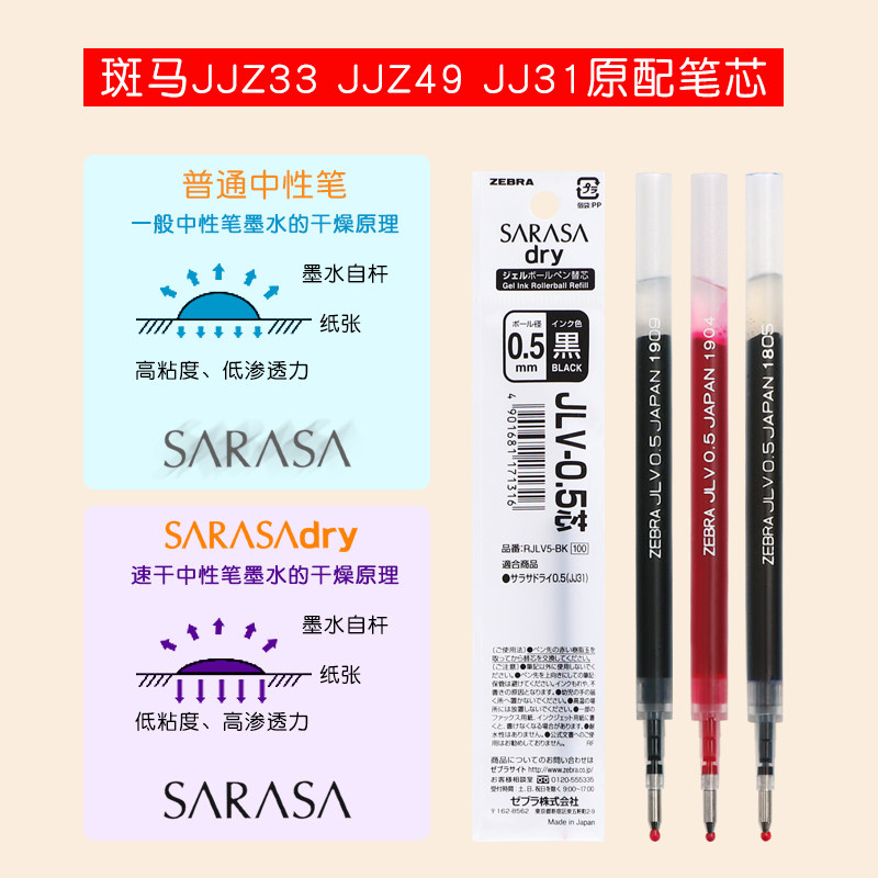 日本ZEBRA斑马速干笔芯黑0.5按动中性笔笔芯JJ15/JJZ33/JJ31/JJZ49气垫速干替芯学生考试红蓝黑色JLV-0.5
