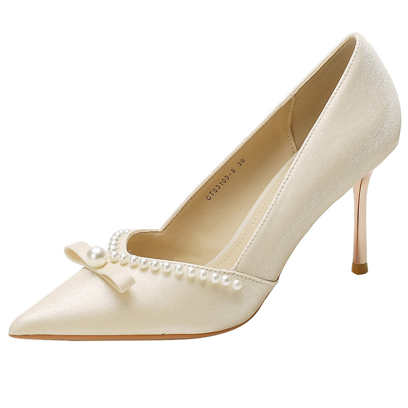 高跟鞋女细跟法式8公分小跟尖头浅口珍珠单鞋6厘米红色婚宴新娘鞋