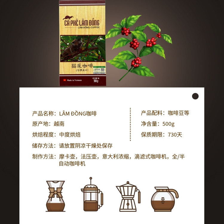 越南正品咖啡LAM DONG豆研磨猫屎咖啡粉500g(250gX2)礼盒装咖啡粉