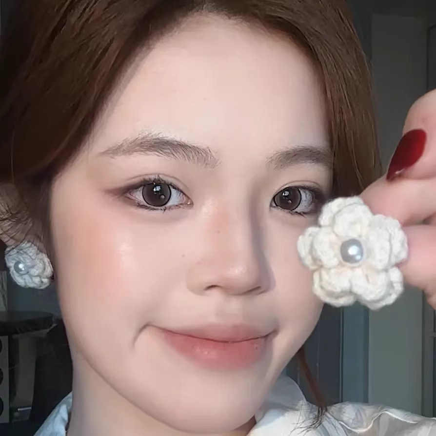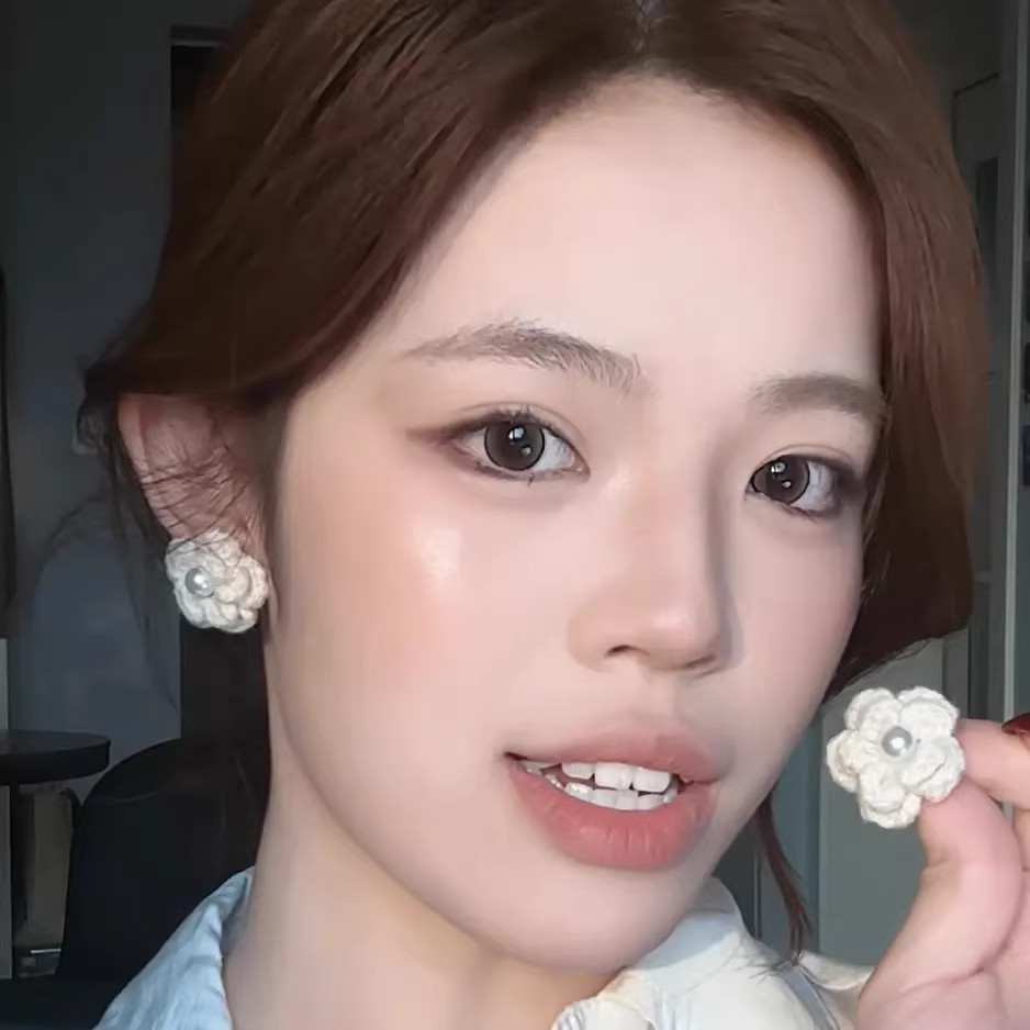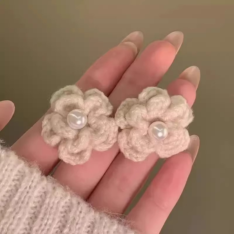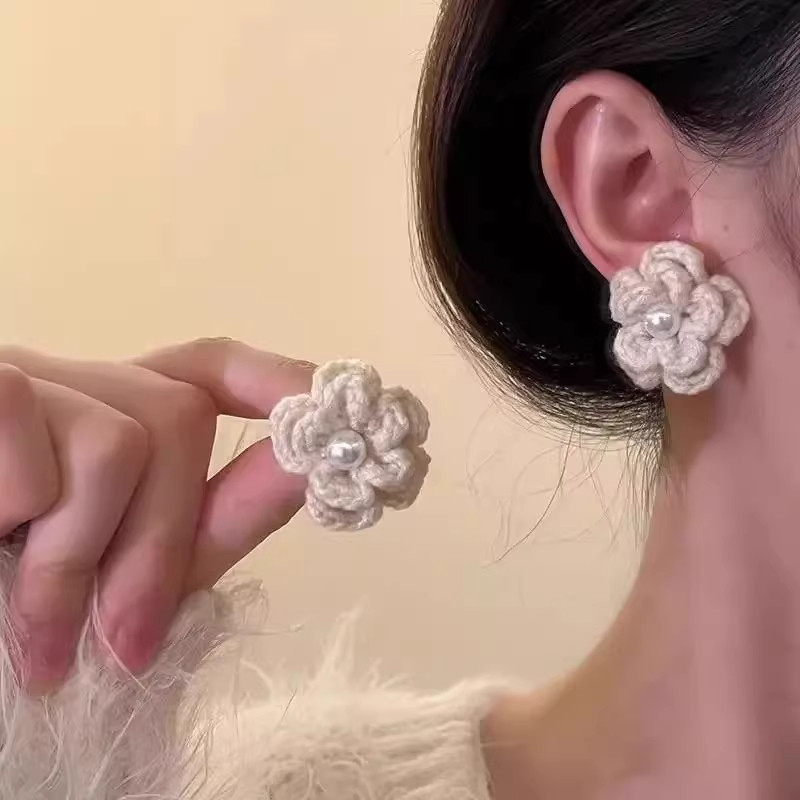 合金布艺耳饰 法式复古毛线花朵珍珠耳环秋冬新款氛围高级感小众j