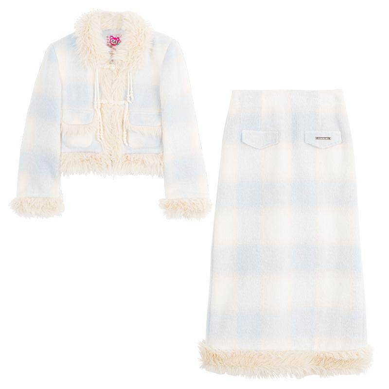 KEIKO [夹棉] 柔美蓝格子毛呢套装25秋冬短款长绒毛呢外套+半身裙