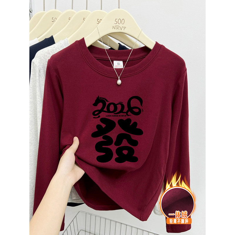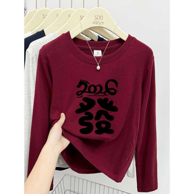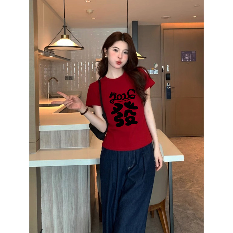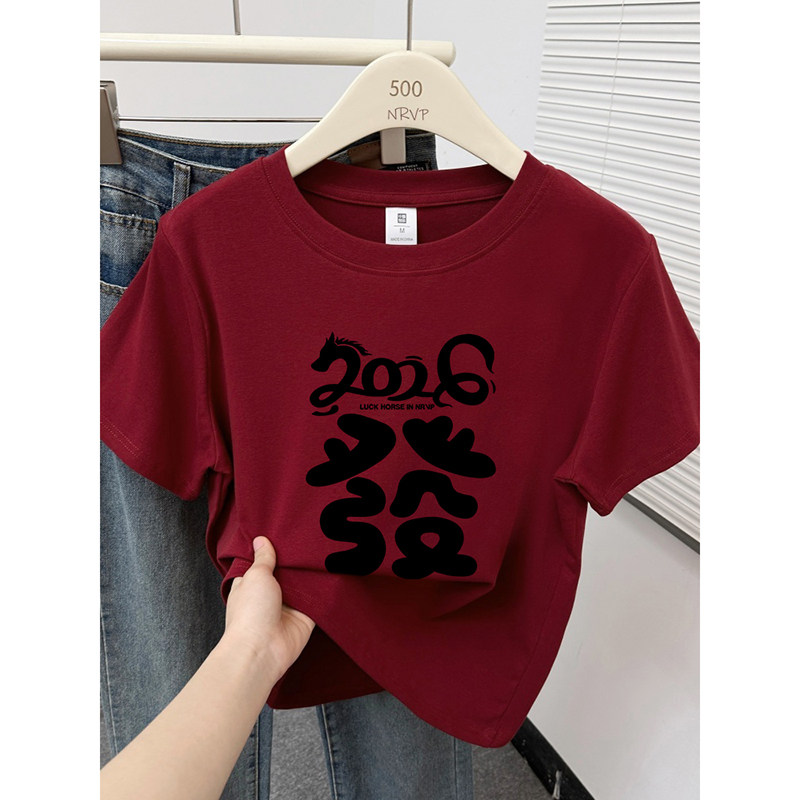 2026新年“发”字印花正肩短袖t恤女修身高弹力棉显白大码女装上�