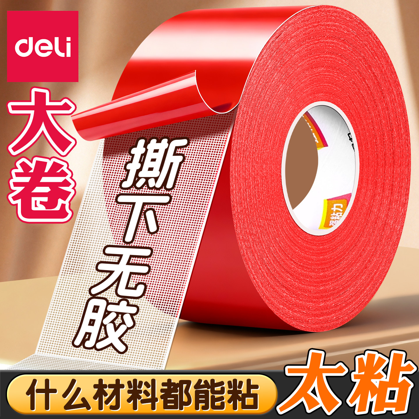 得力网格布基双面胶带不留痕高粘度强力固定粘贴胶地毯防水透明胶条婚房布置耐高温春联对联专用地垫革免打孔