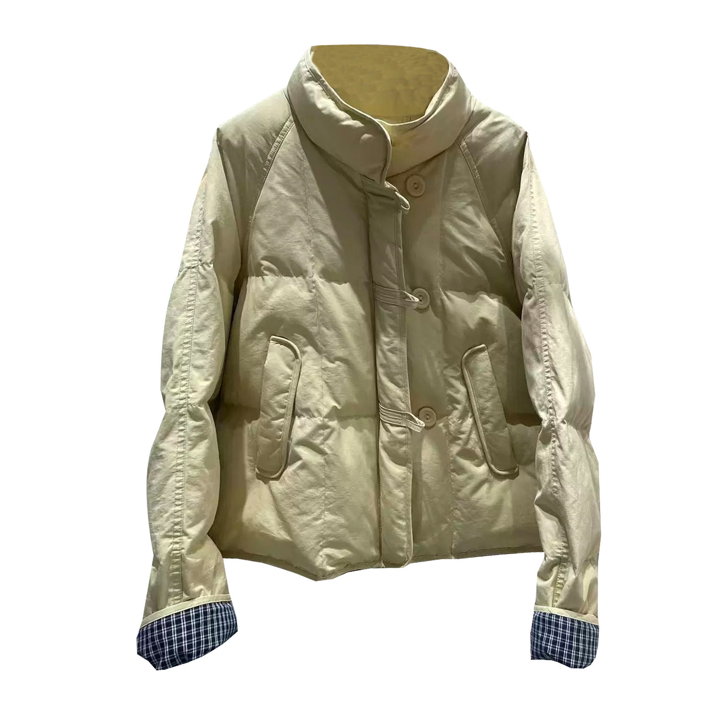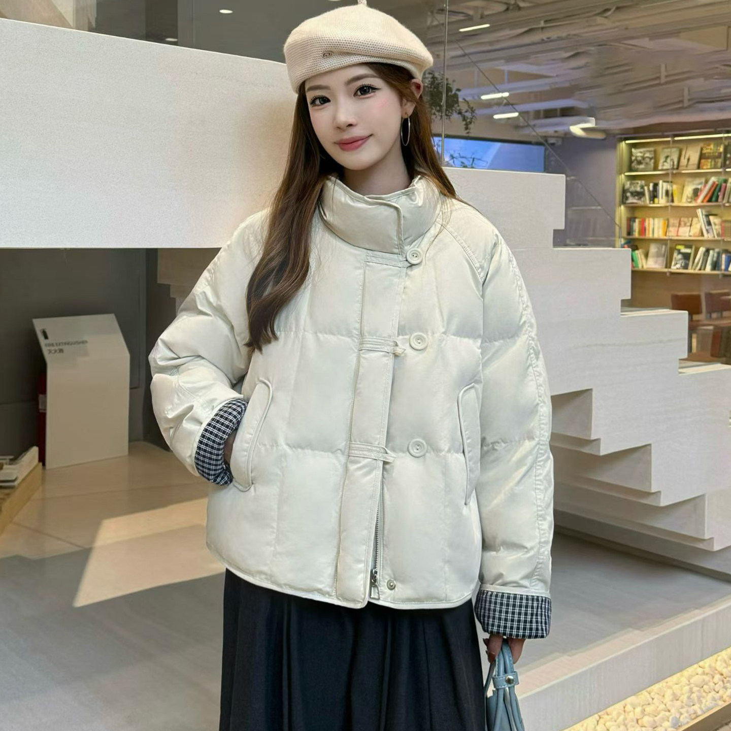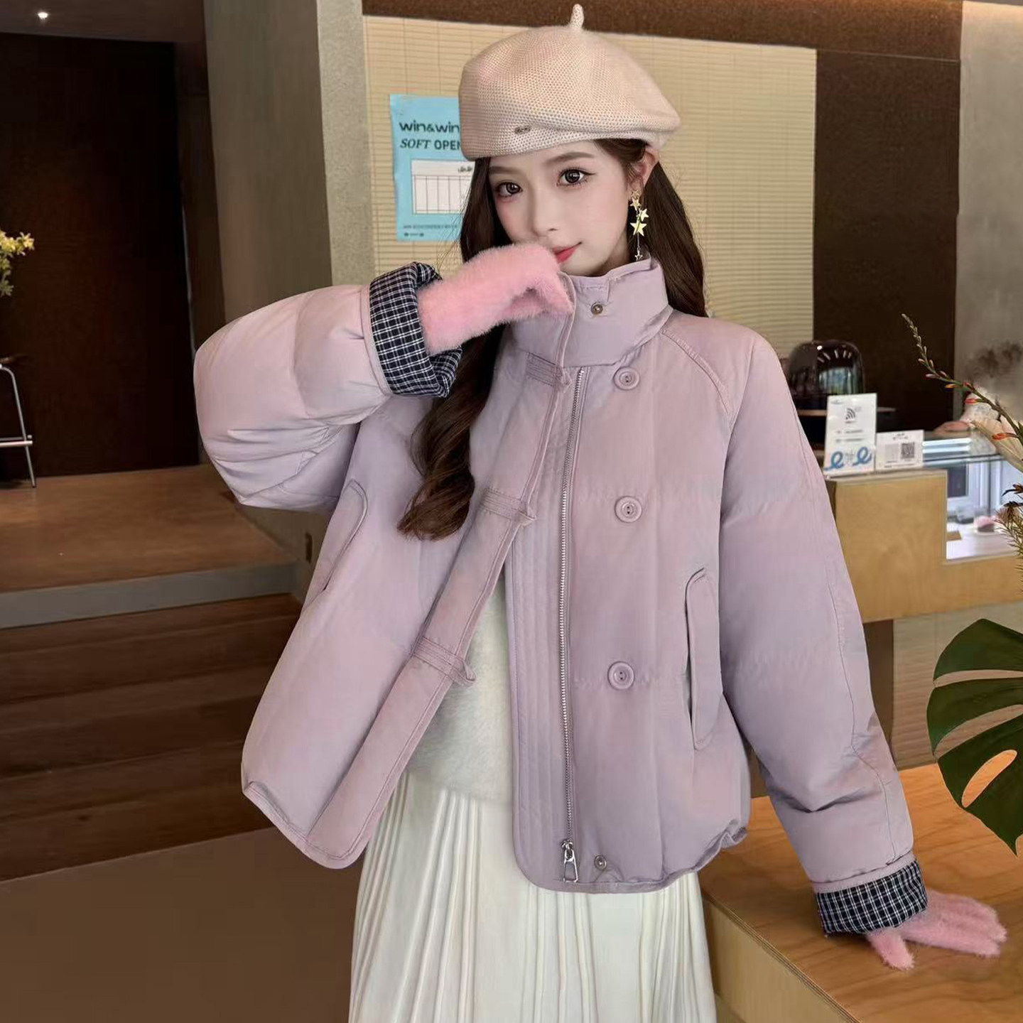 文艺范羽绒棉短款保暖外套美少女冬季流行新款格子拼接立领丝棉服