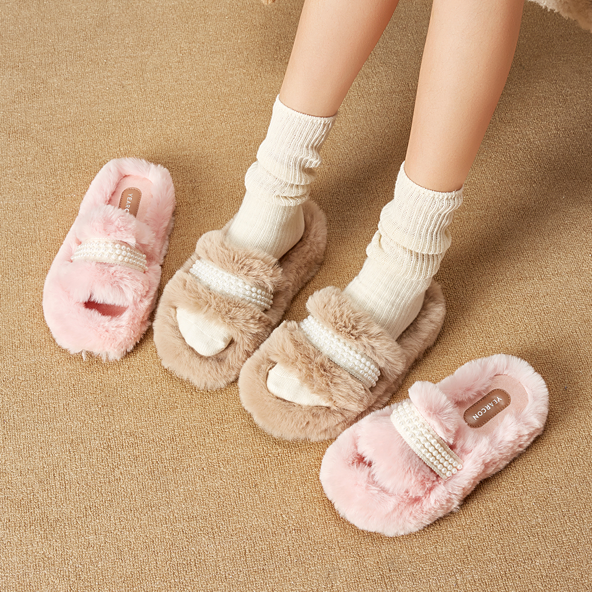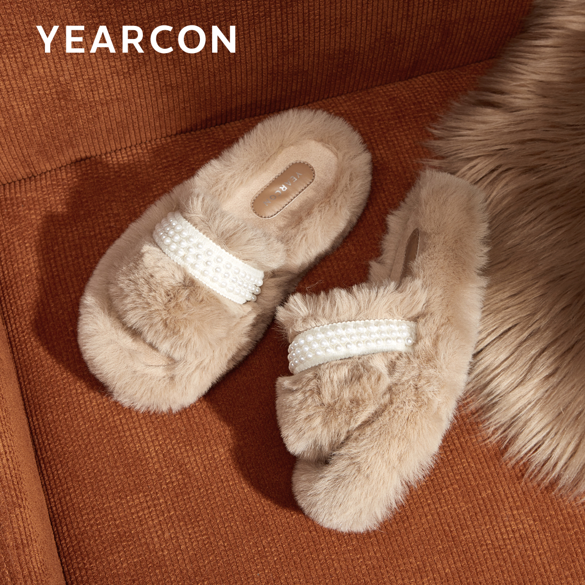 意尔康珍珠一字拖毛毛拖鞋女2025秋冬时尚平底居家毛绒棉拖鞋甜美