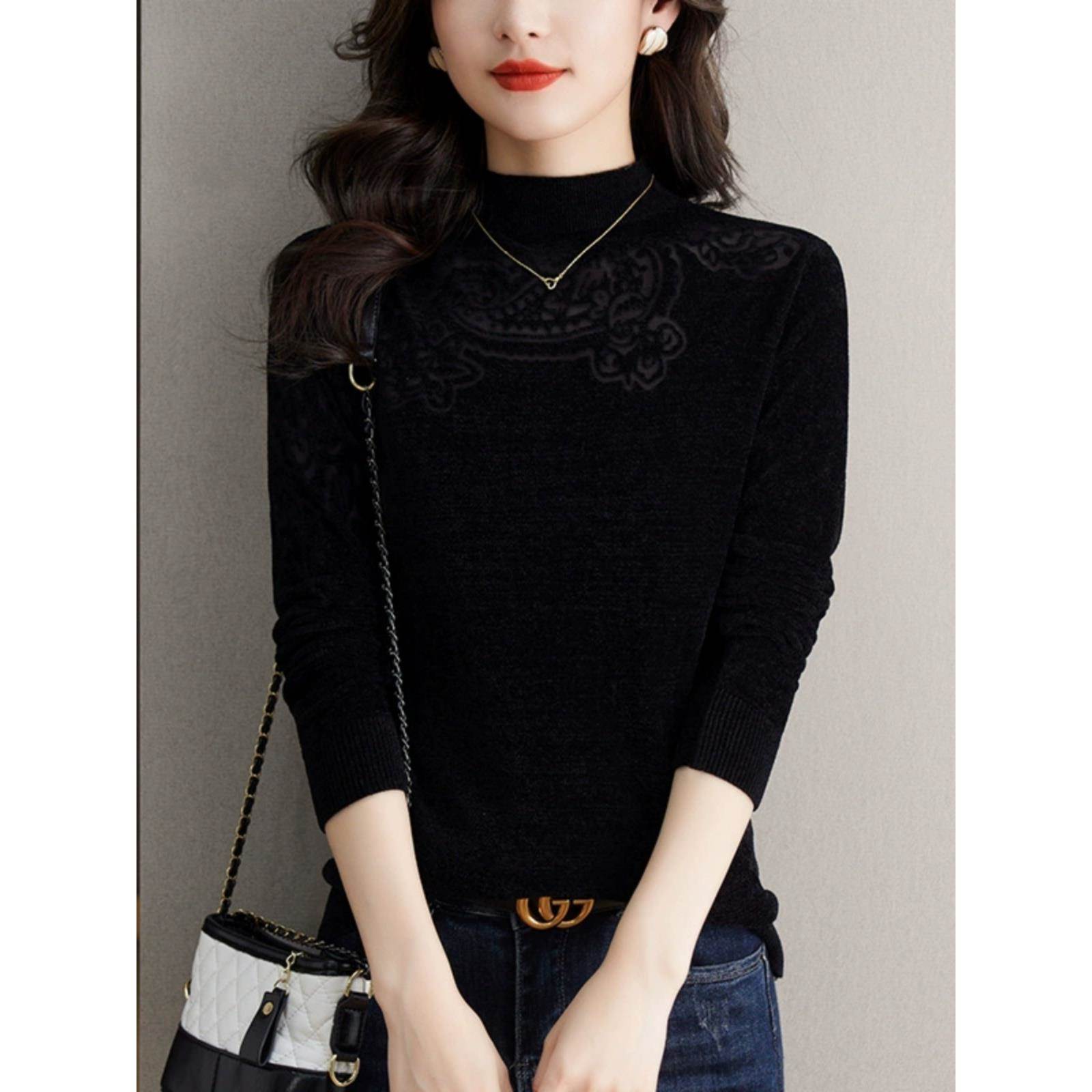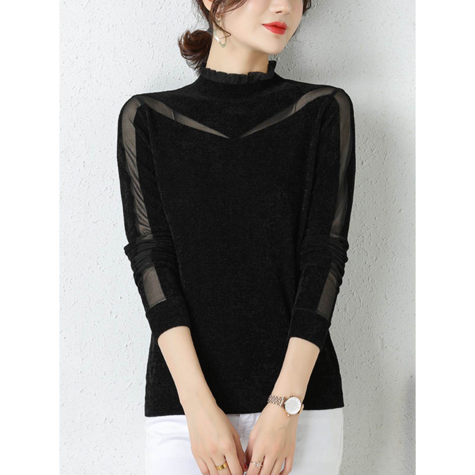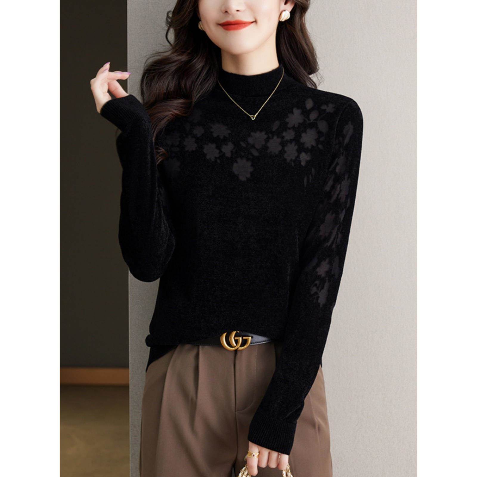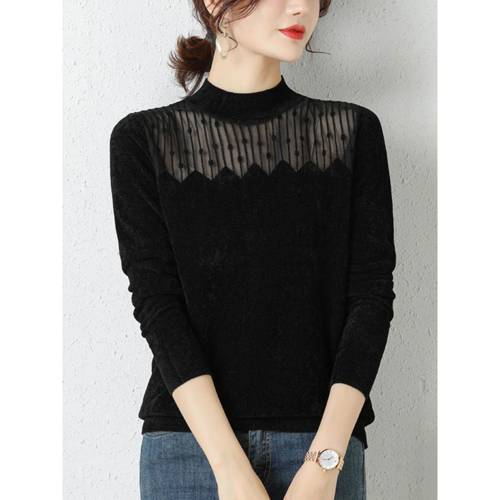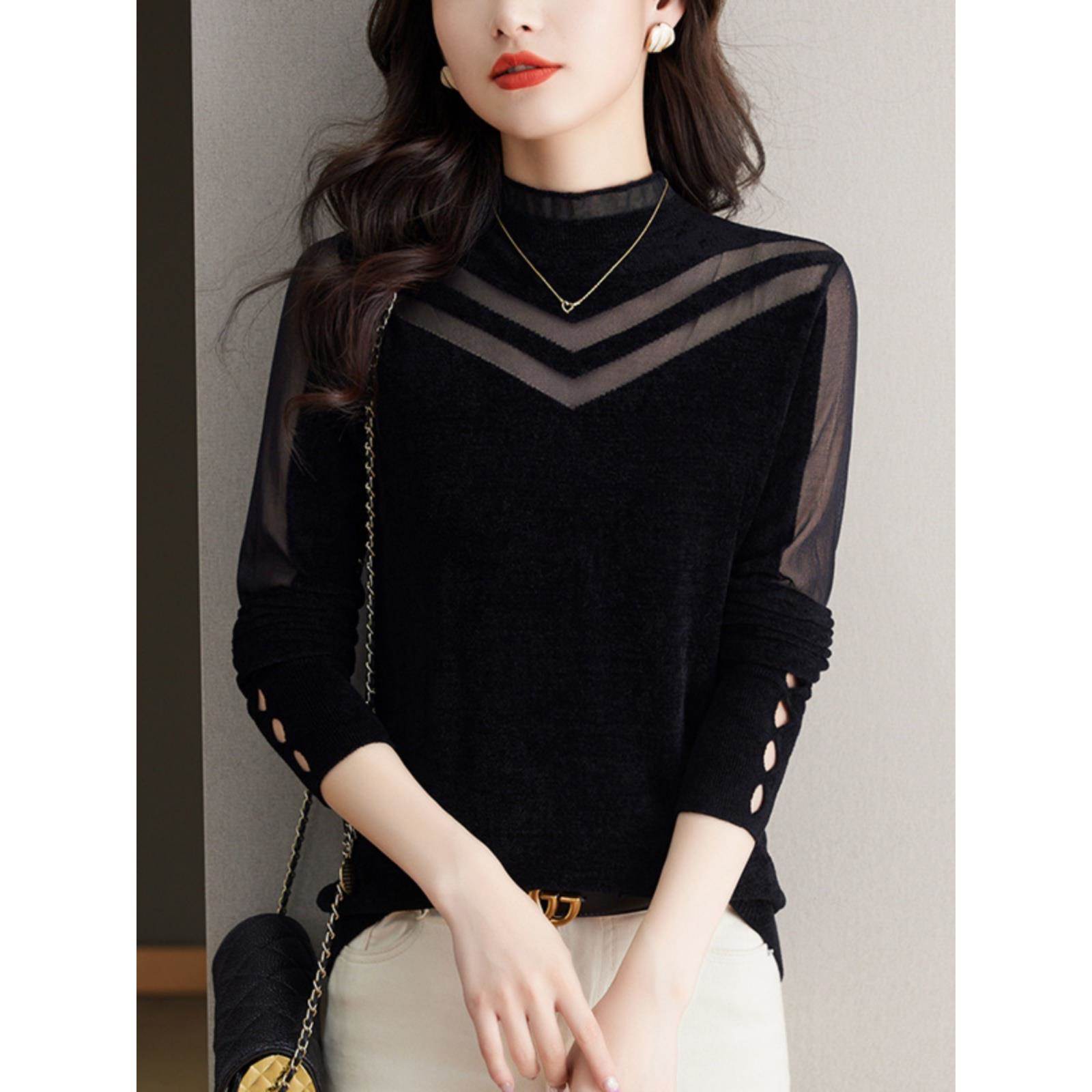 天鹅绒网纱打底衫女士内搭秋冬2025新款爆款洋气针织上衣黑色毛衣