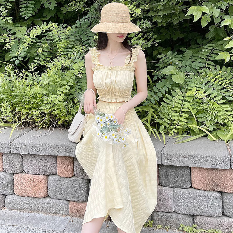 温柔套装女荷叶边褶皱吊带背心夏季新款松紧高腰大摆半身裙两件套