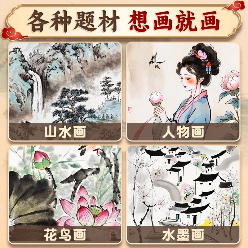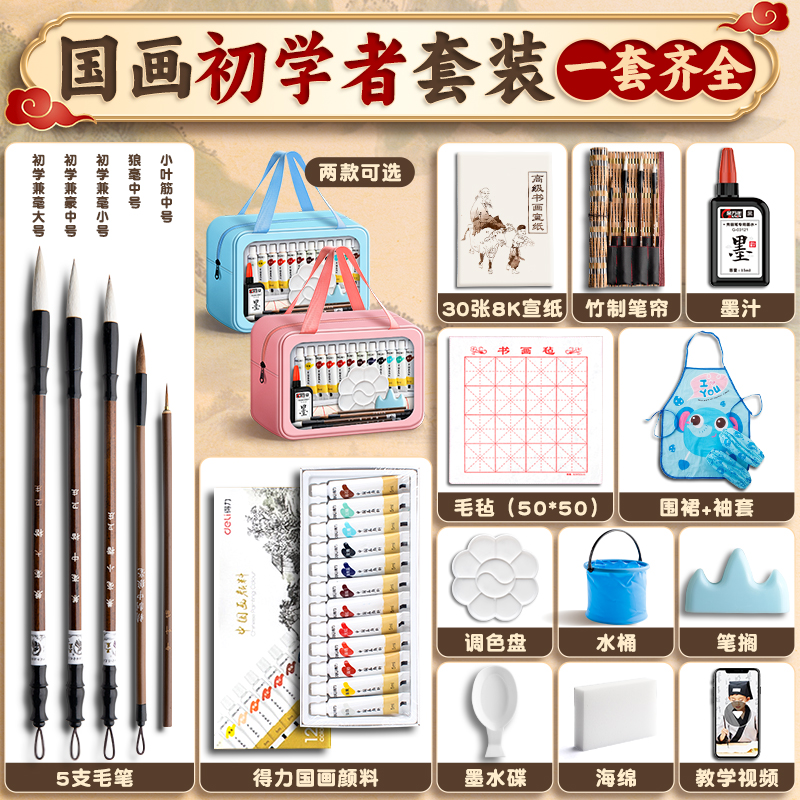 得力国画颜料初学者套装中国画国画用品工具全套小学生三年级12色水墨画初中生美术绘画24色配套材料包可水洗