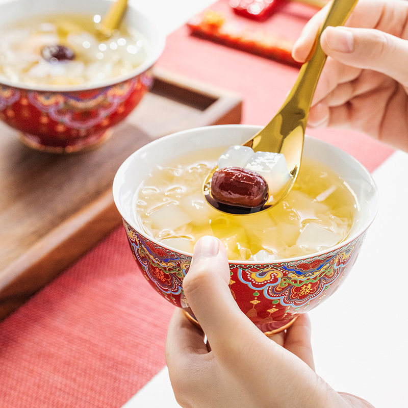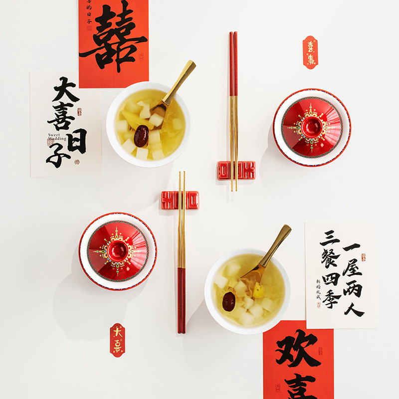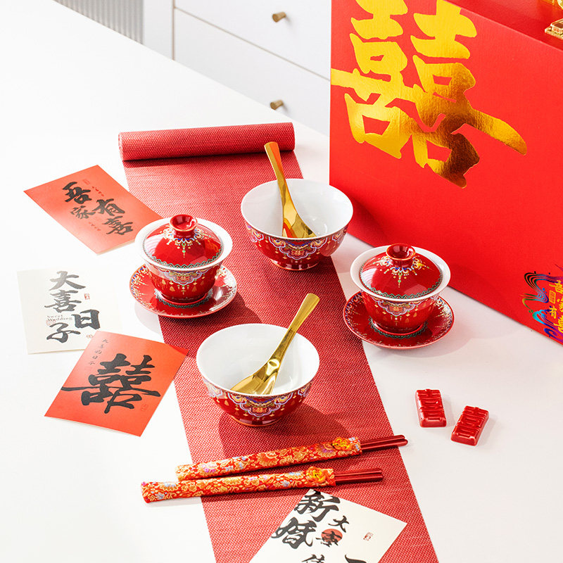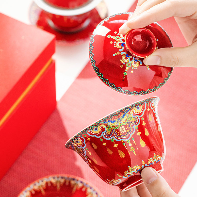 结婚礼物敬茶杯套装璎珞纹婚庆红色杯子陶瓷喜碗新婚碗筷陪嫁用品