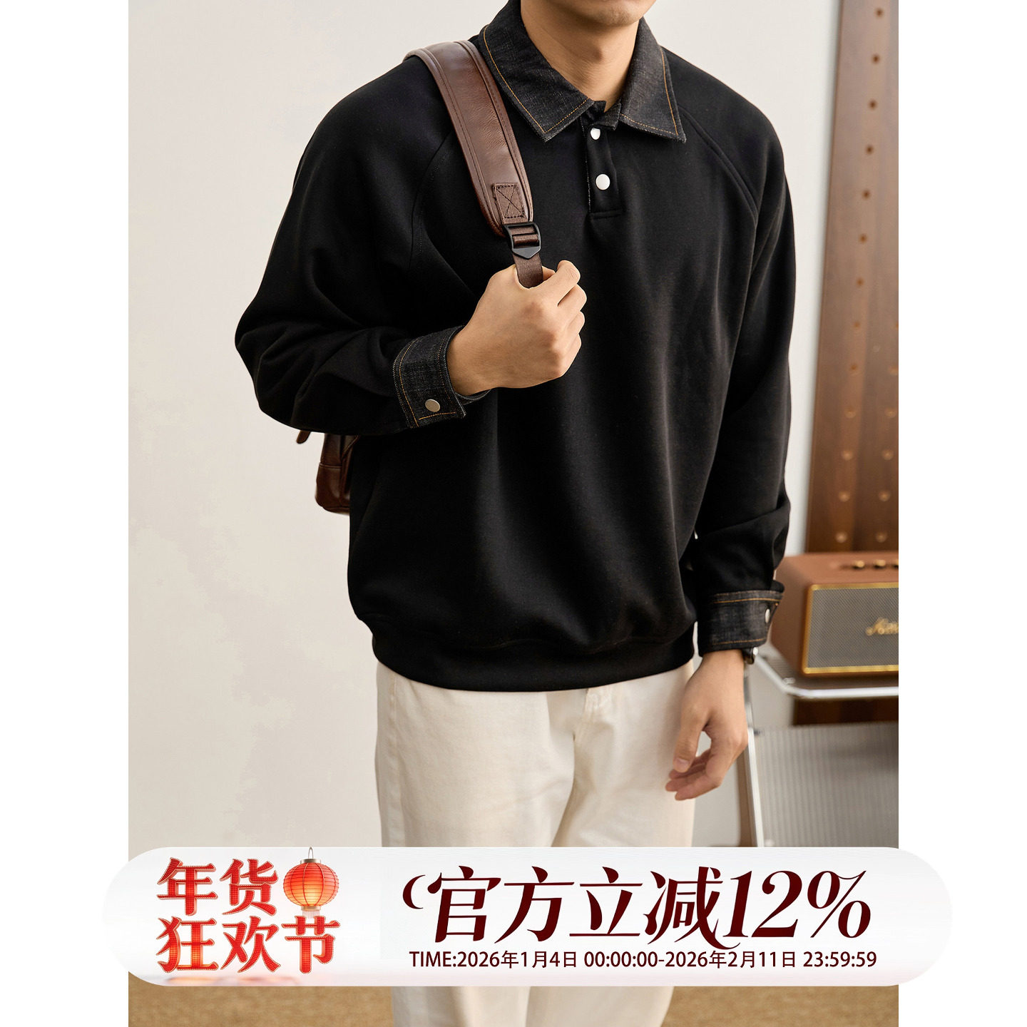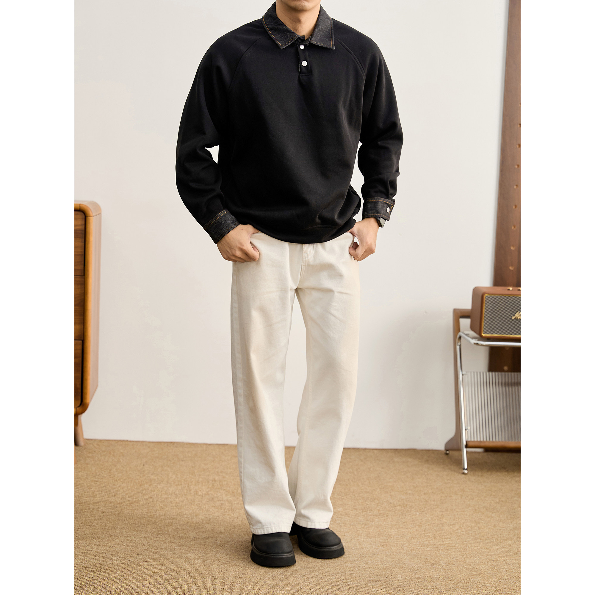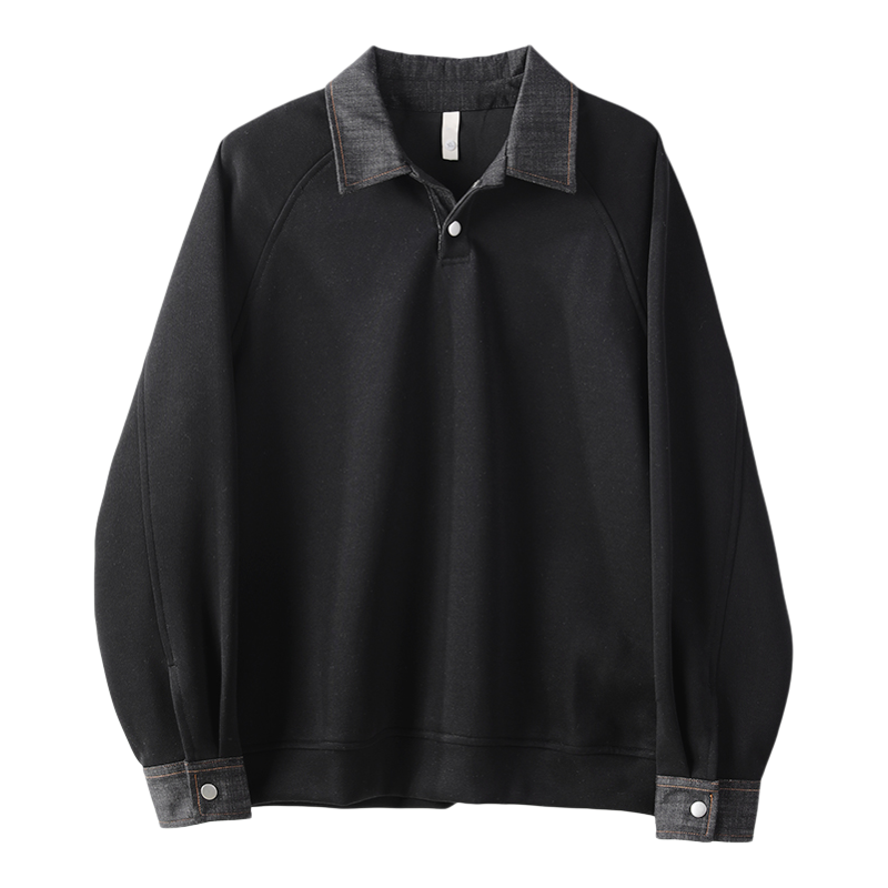 特价 牛仔布拼料翻领卫衣男秋冬潮奢撞色落肩350g重磅长袖POLO衫