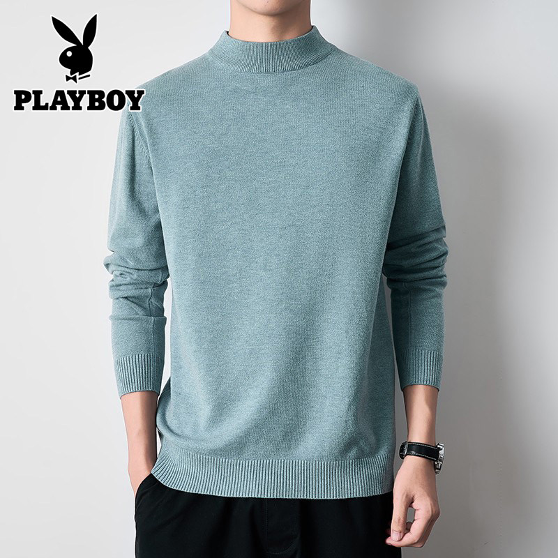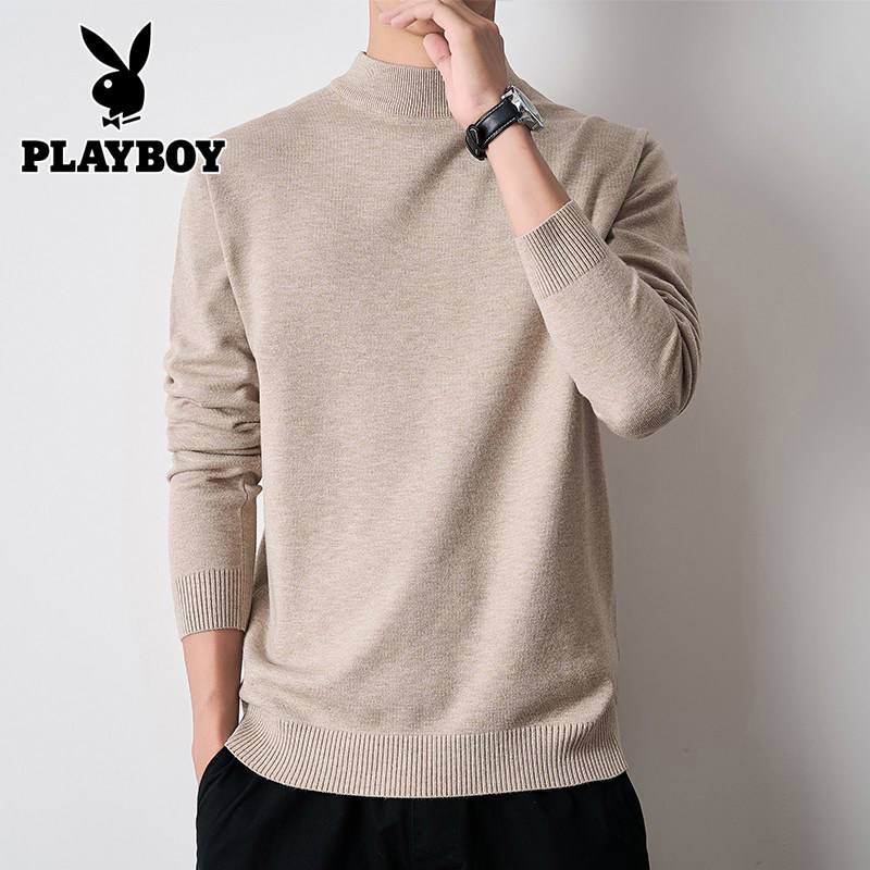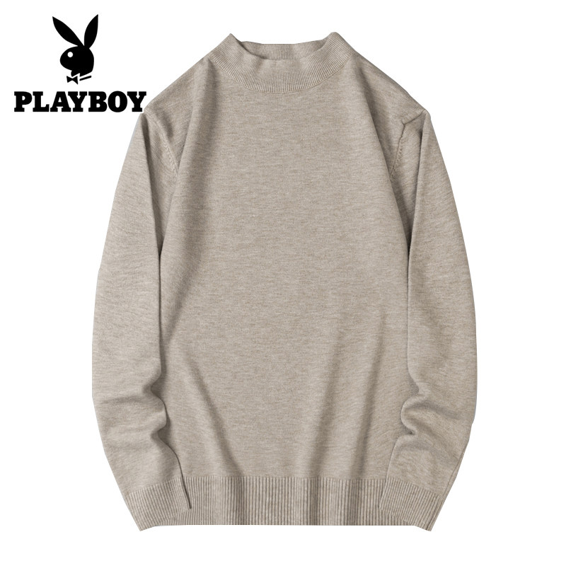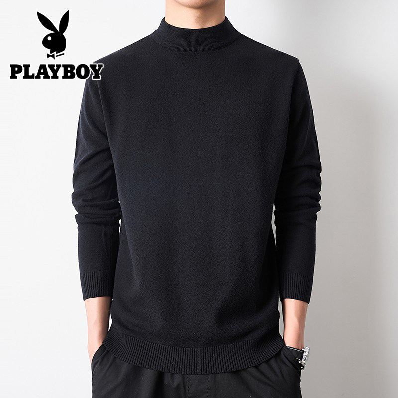 花花公子半高领毛衣男秋冬季加绒黑色内搭中领针织保暖打底衫上衣