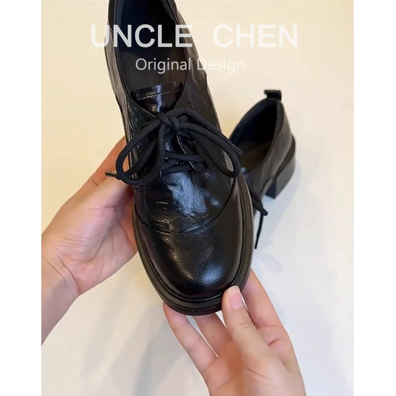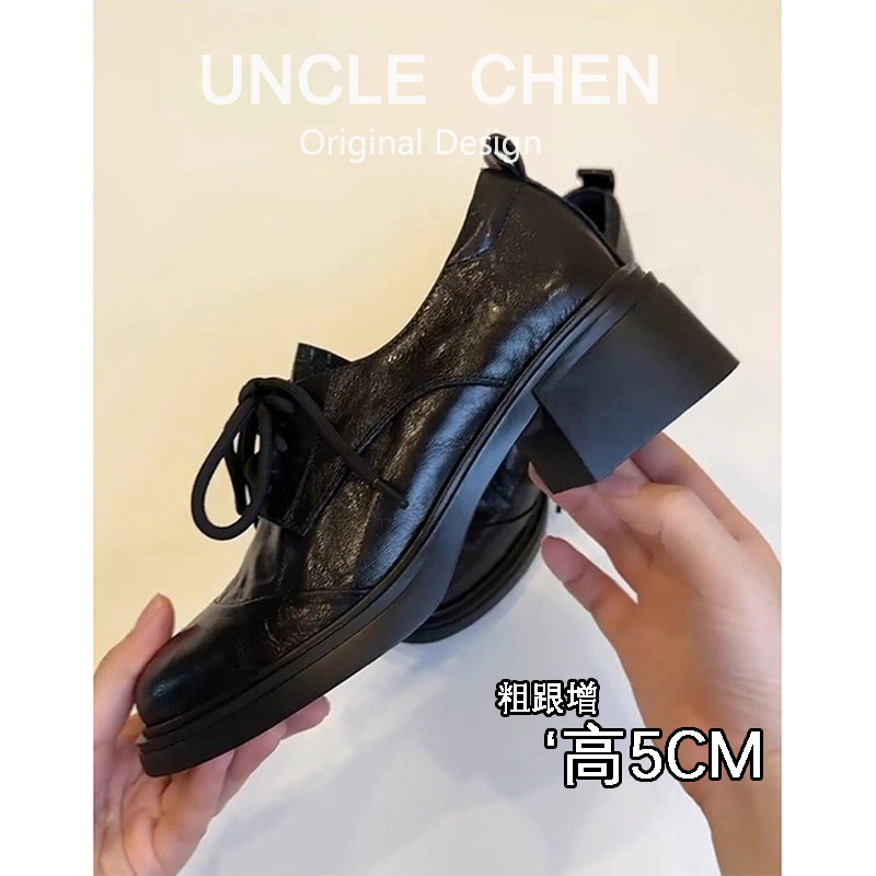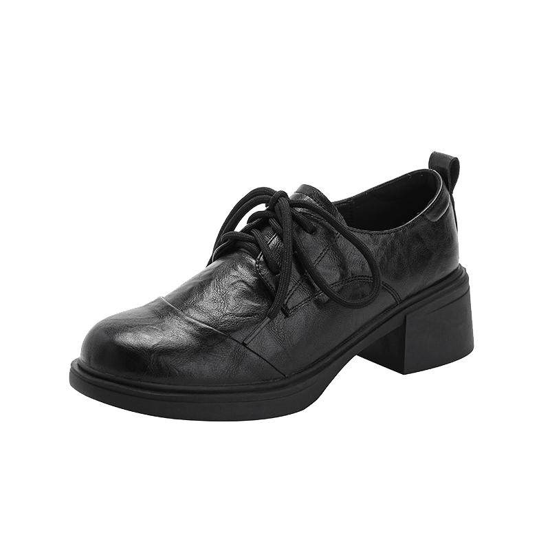 羊皮版~小皮鞋女5CM英伦风深口乐福鞋加绒系带小个子圆头粗跟单鞋