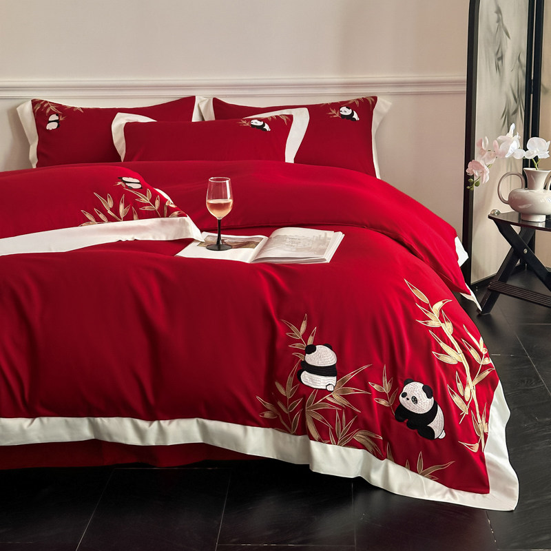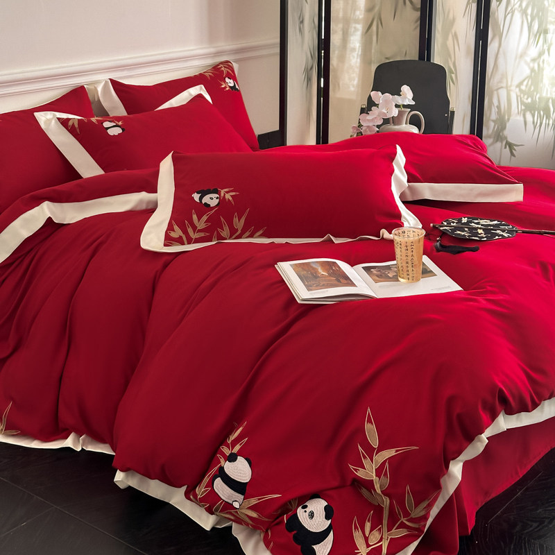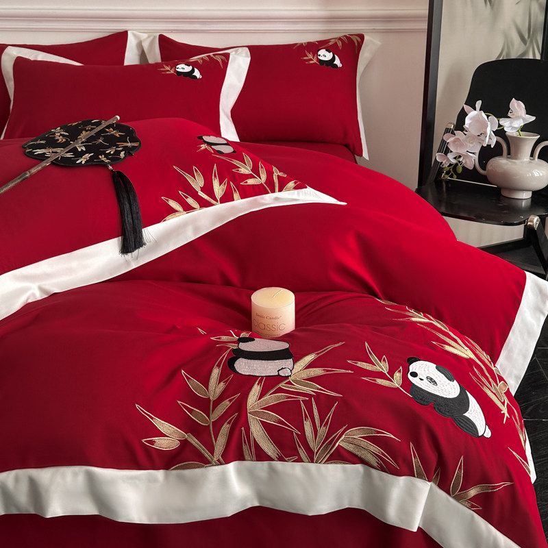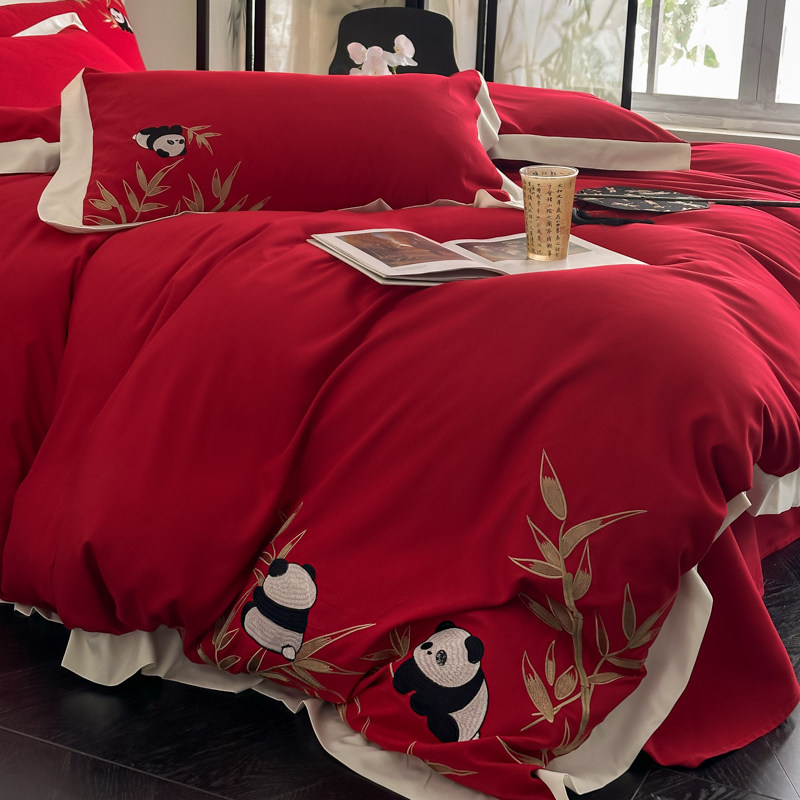 新中式婚庆红色熊猫刺绣四件套新年喜庆床品套件亲肤棉床上用品