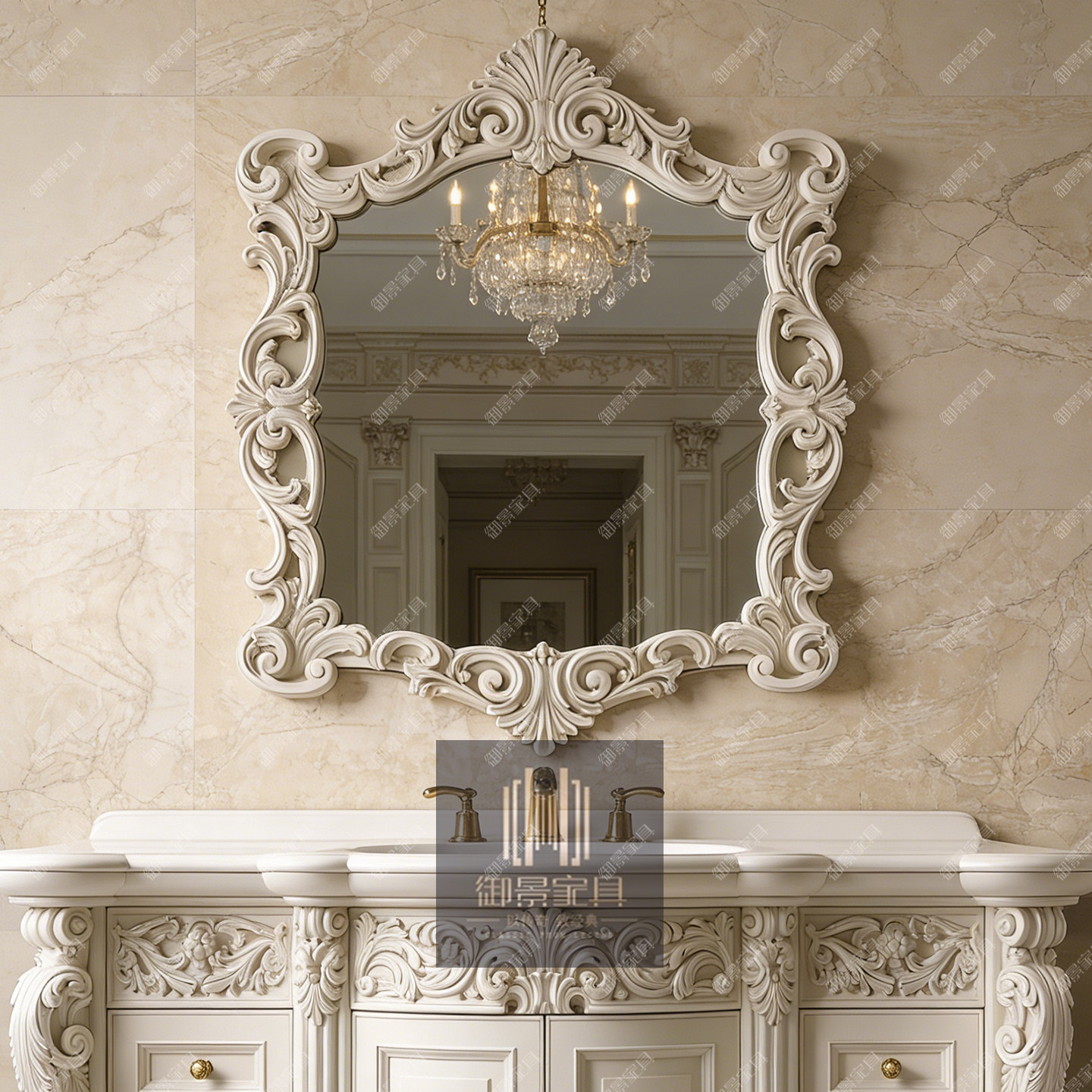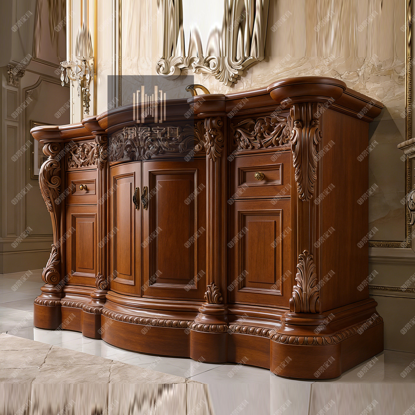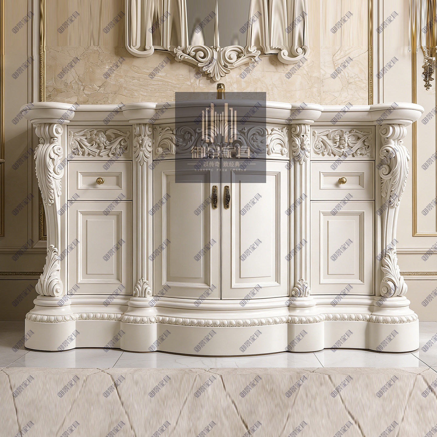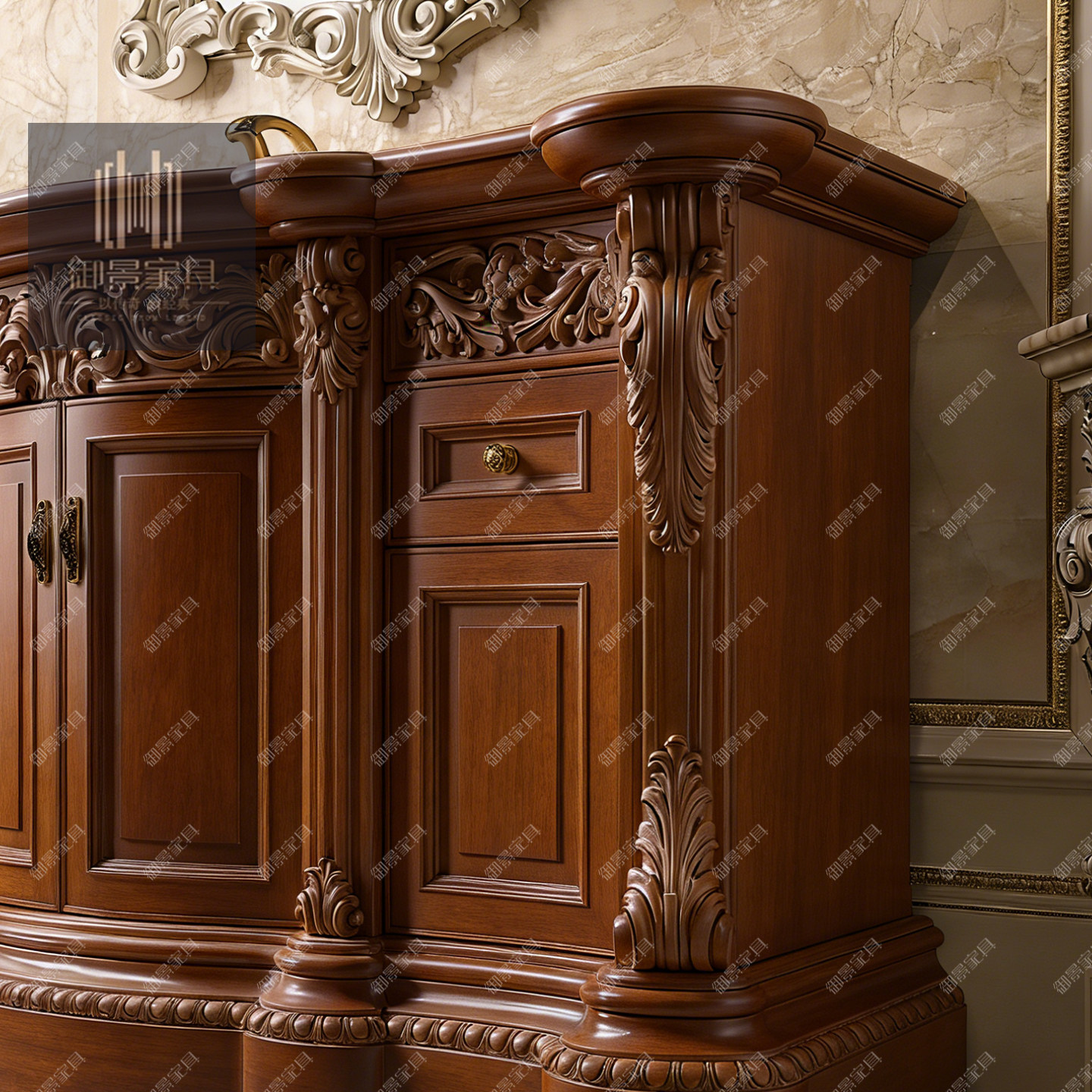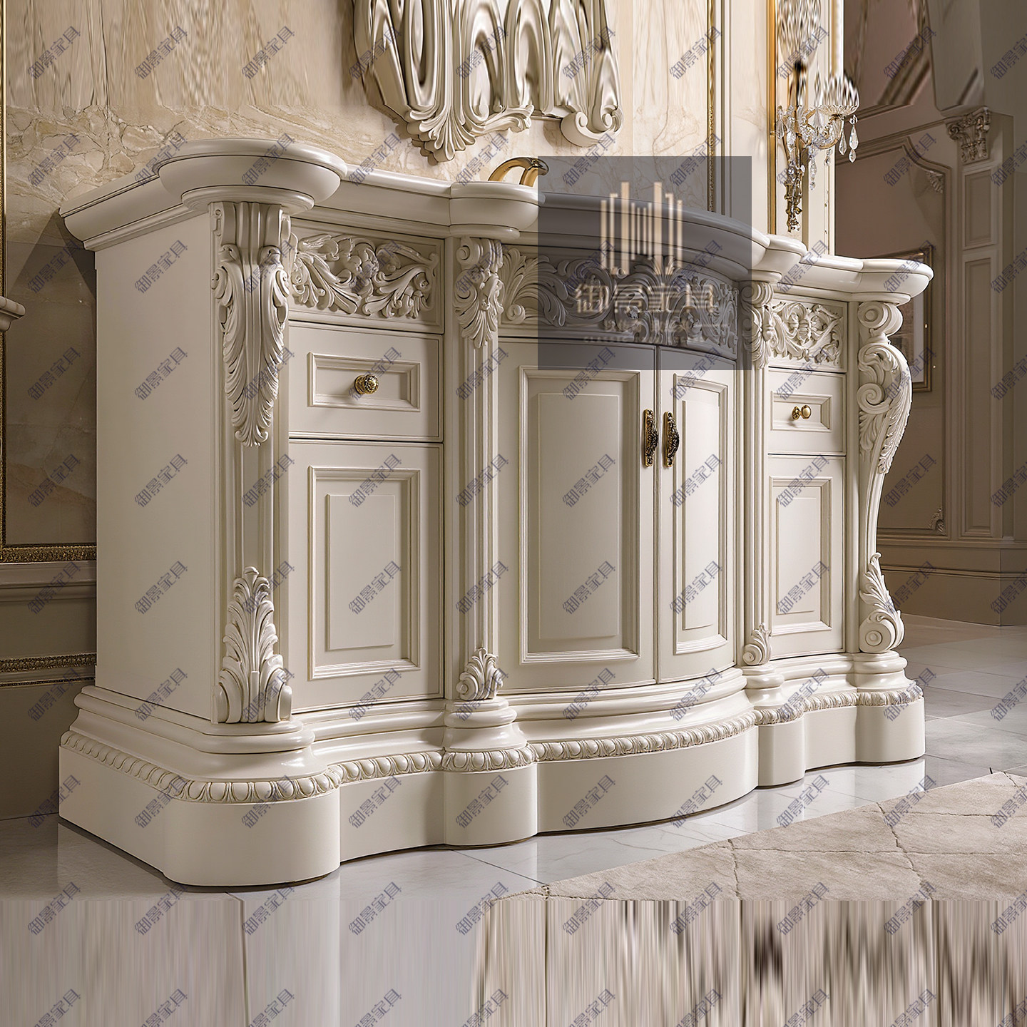 法式浪漫风实木浴室柜手工雕刻大理石面奢华洗手柜欧式卫浴柜定制
