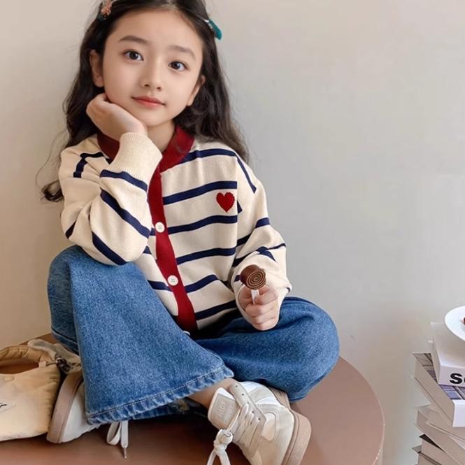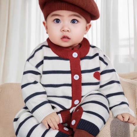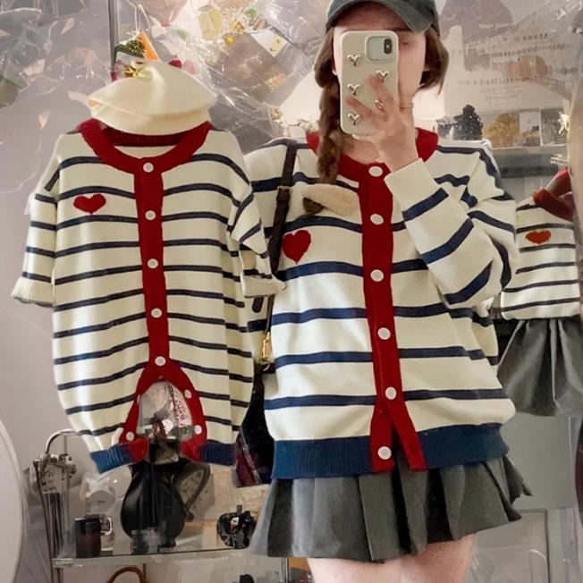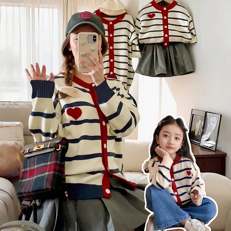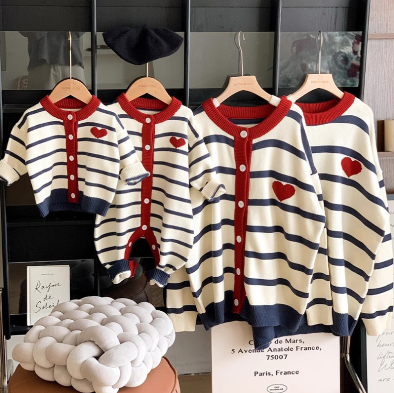条纹亲子装一家三口爱心毛衣外套母子装婴儿爬服连体衣针织衫上衣