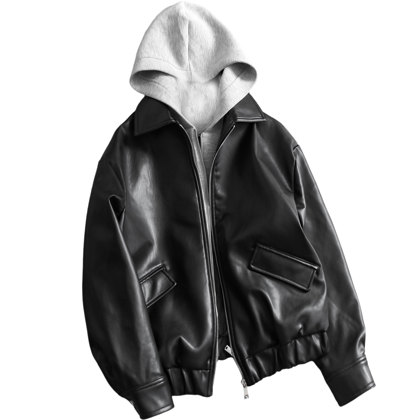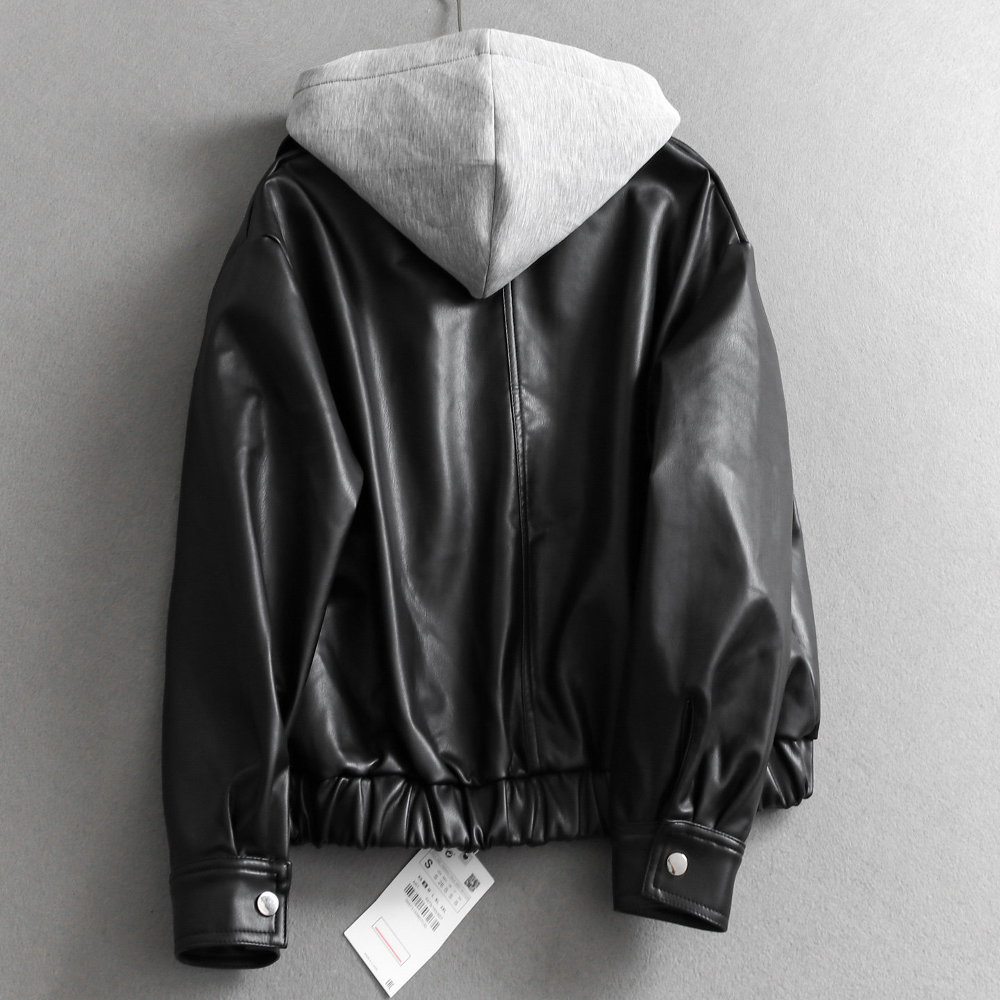 撞色潮酷拼接假两件连帽防风保暖夹克外套长袖机车服女装皮衣M575