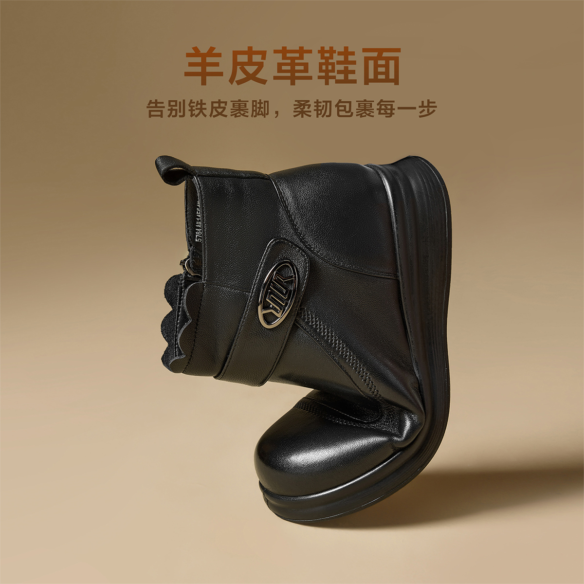 意尔康女鞋2025冬季真皮法式中老年妈妈棉鞋羊皮加绒短靴女士皮鞋