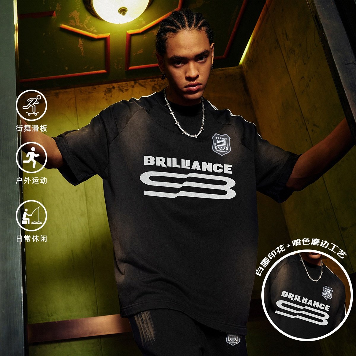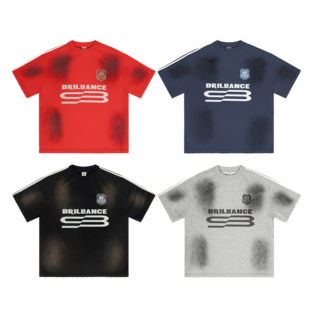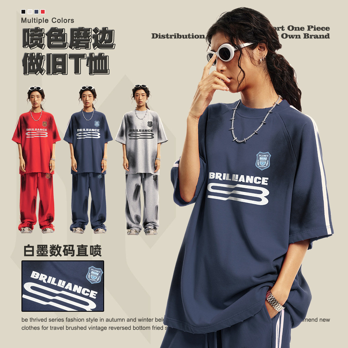 美式潮牌复古三杠水洗做旧短袖男春夏新品宽松百搭喷色体恤上衣男