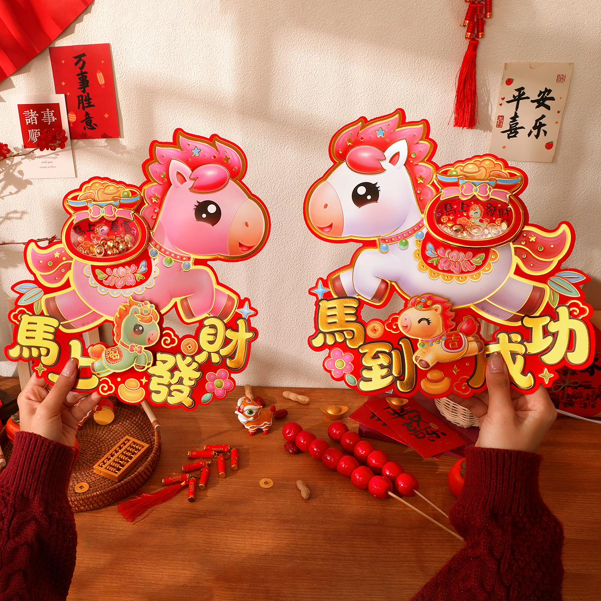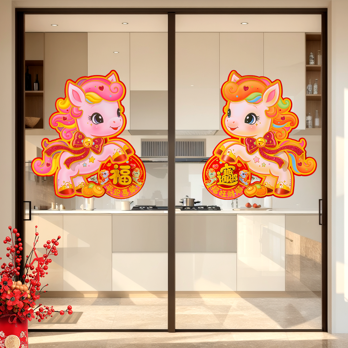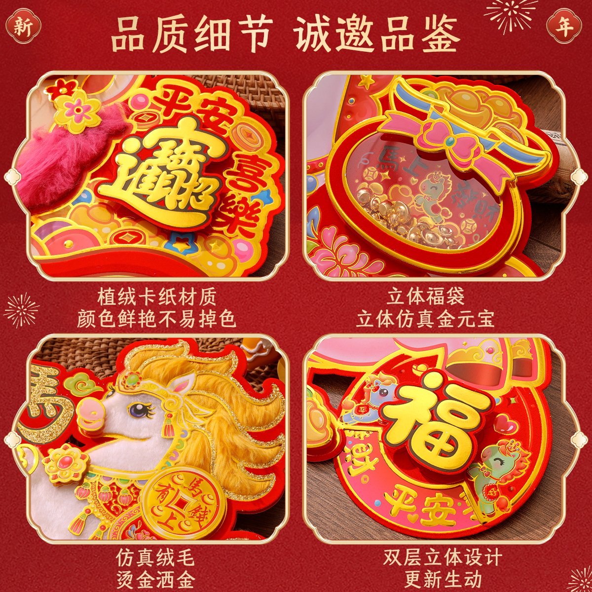 2026马年新年装饰福字门贴窗花植绒卡通生肖大门对拜春节过年布置