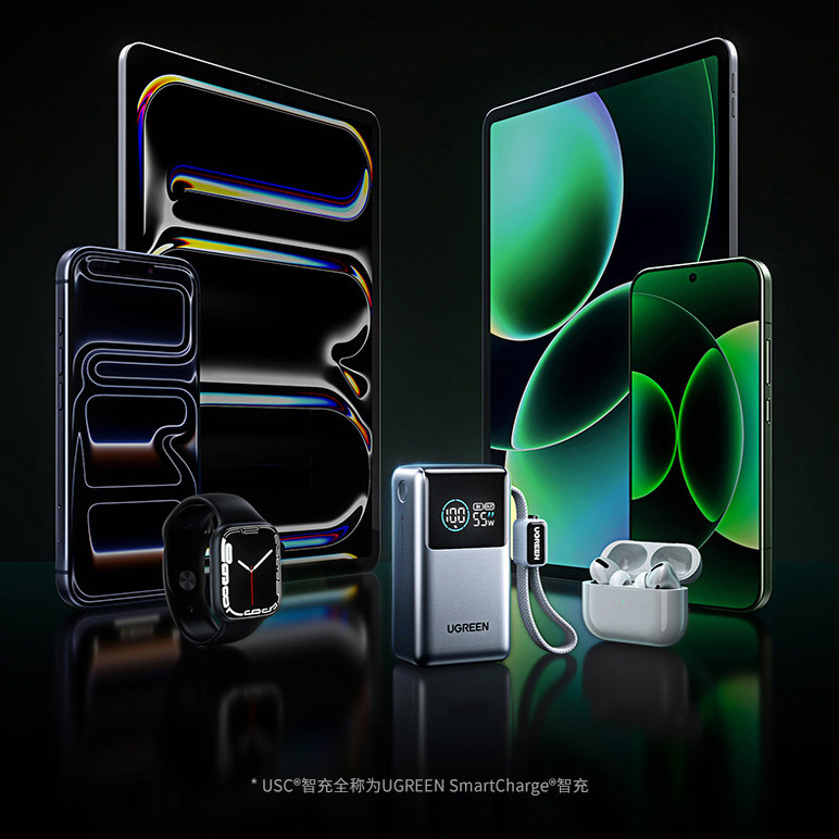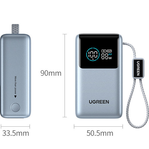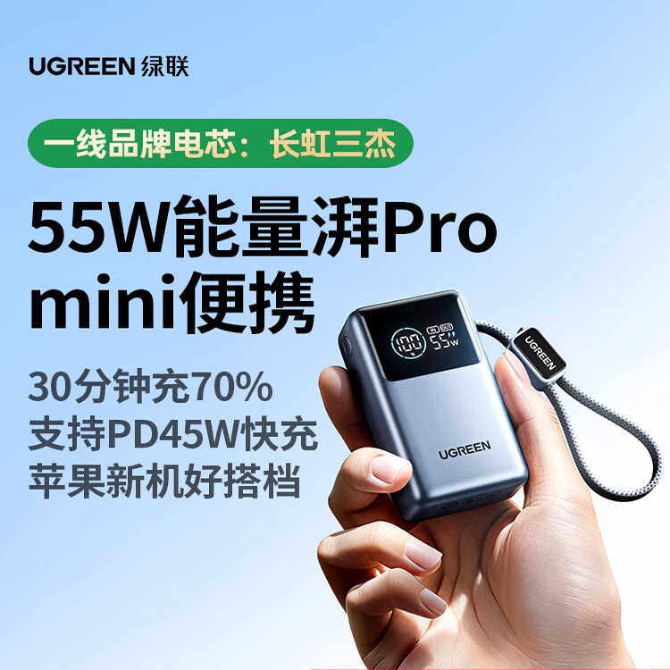 绿联3C认证可上飞机能量湃Pro55W充电宝自带线10000毫安快充PB727