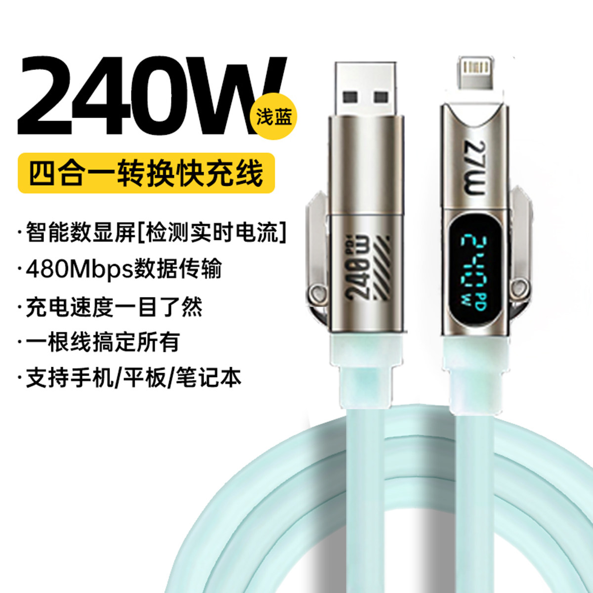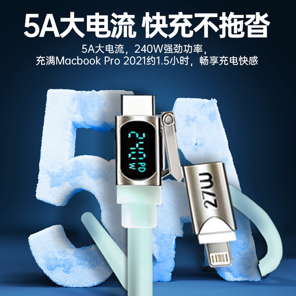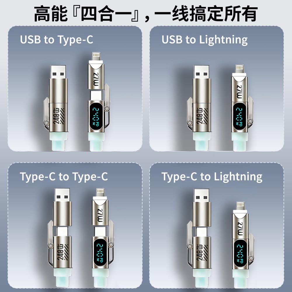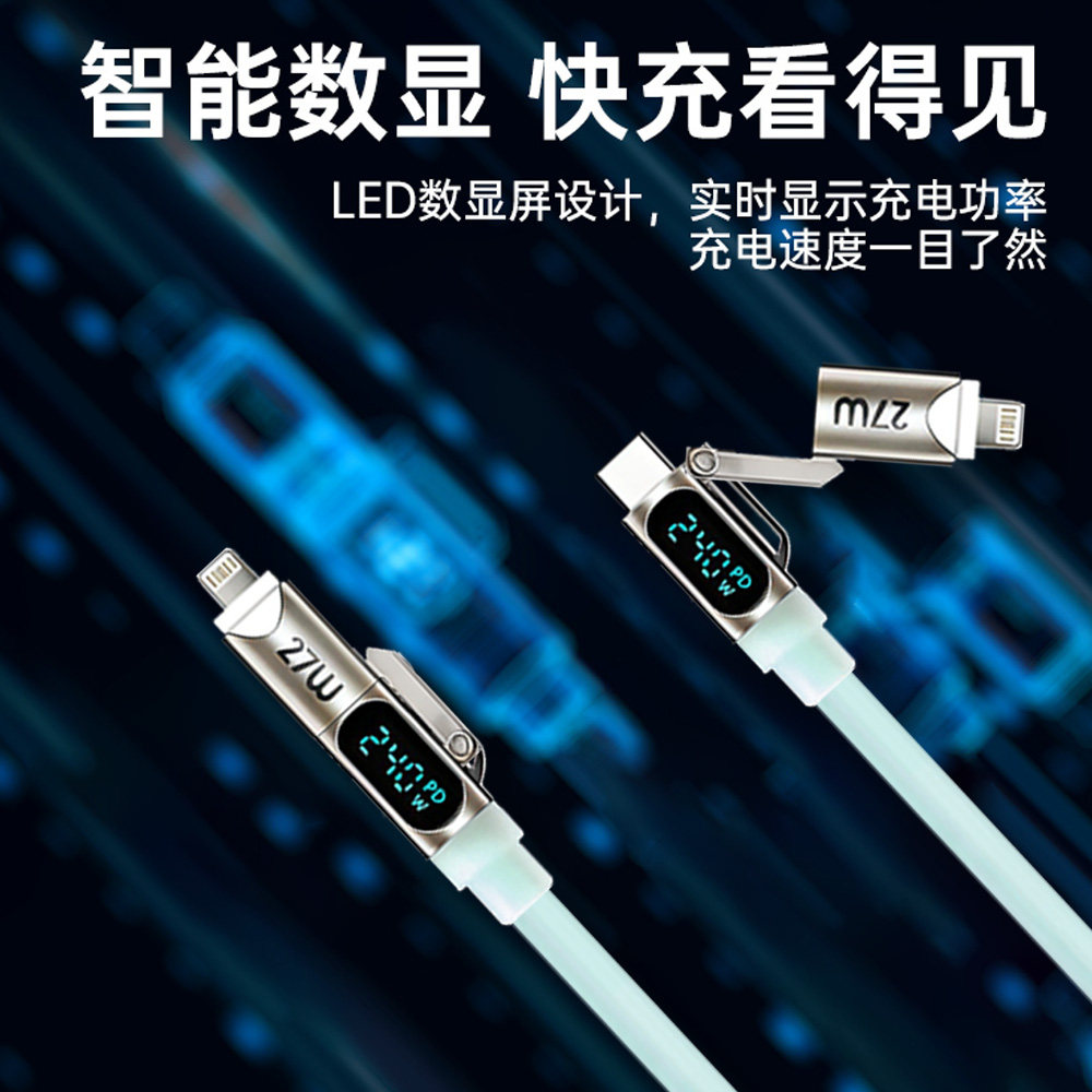 秋穆240W四合一液态硅胶呼吸灯智能数显快充数据线适用于苹果安卓iPhone通用