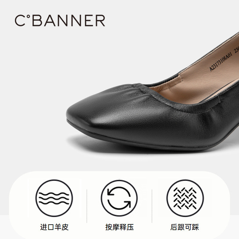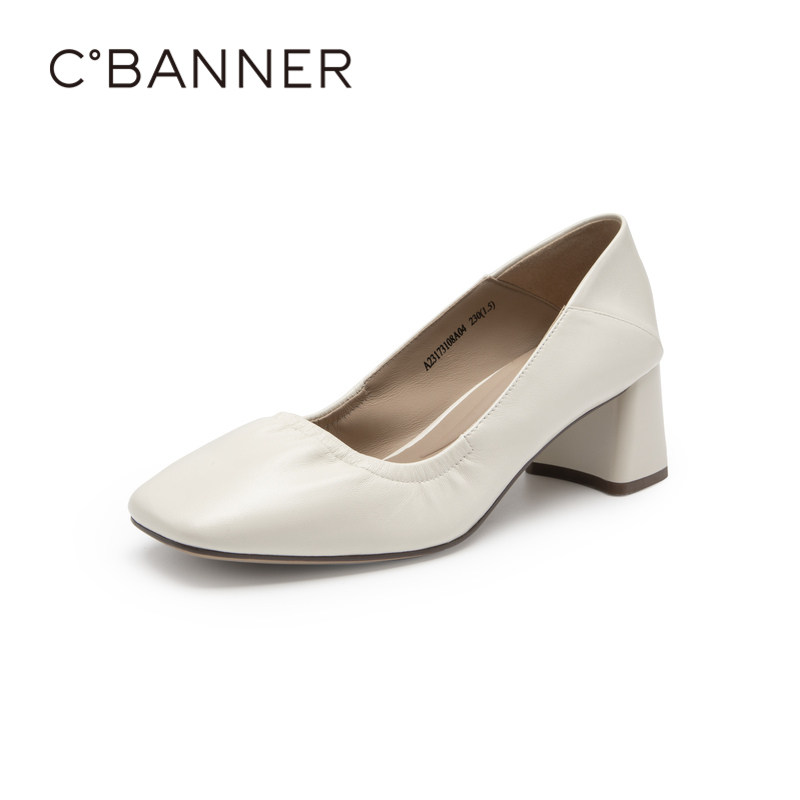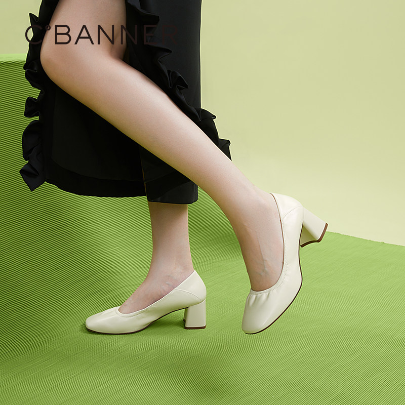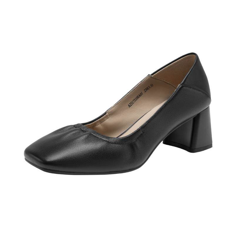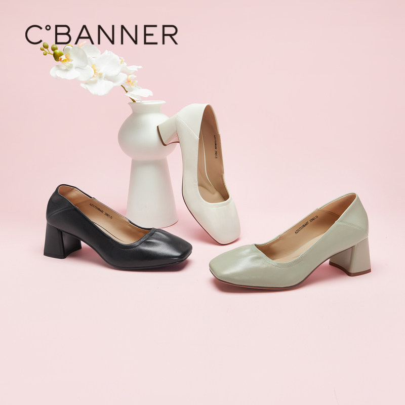 千百度女鞋秋季新款纯色高跟鞋粗跟方头单鞋通勤正装浅口气质