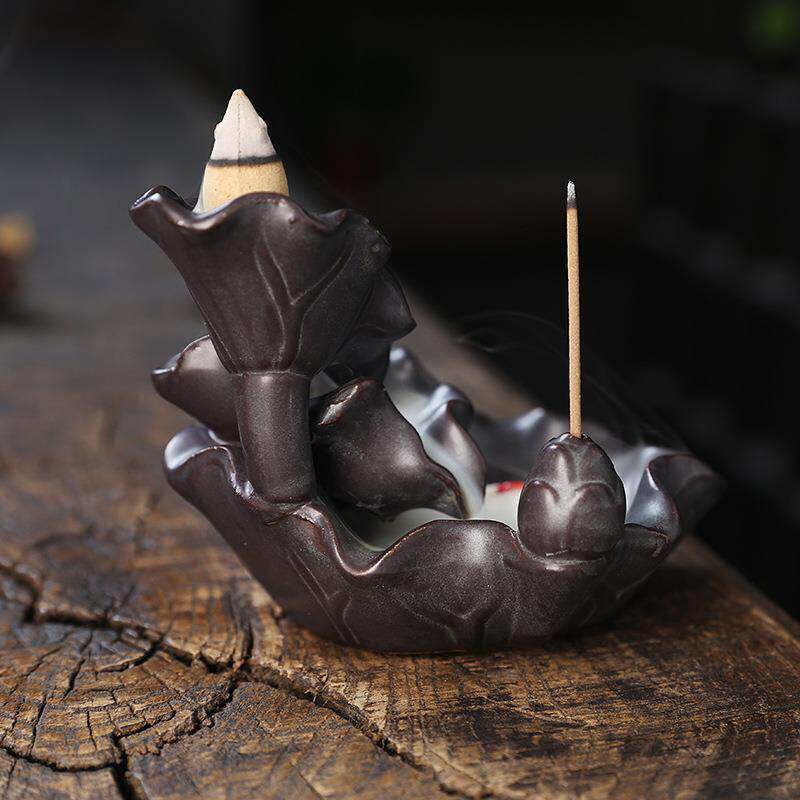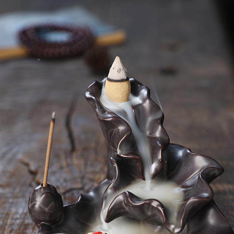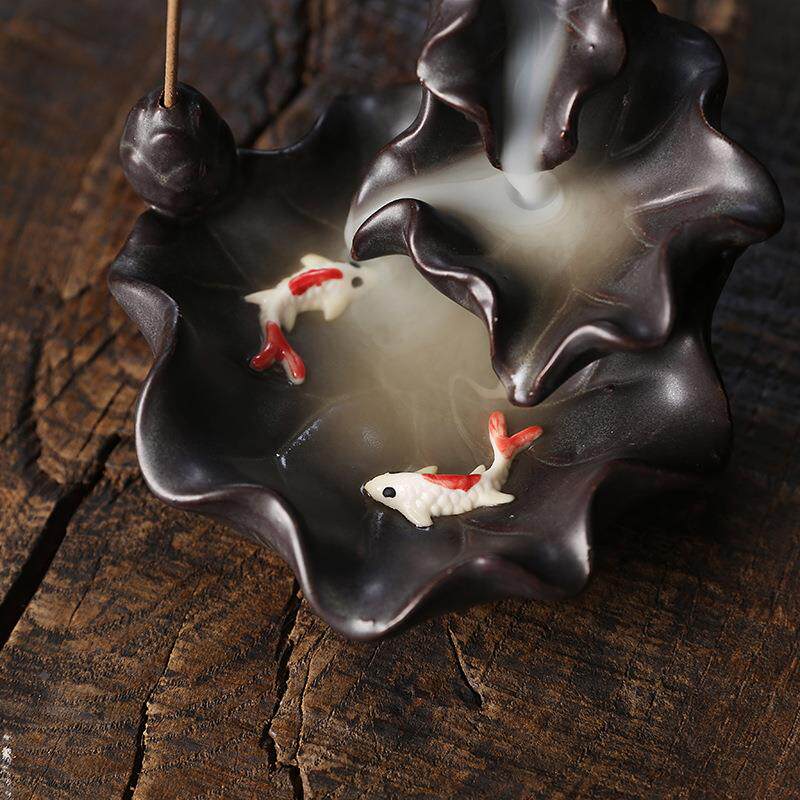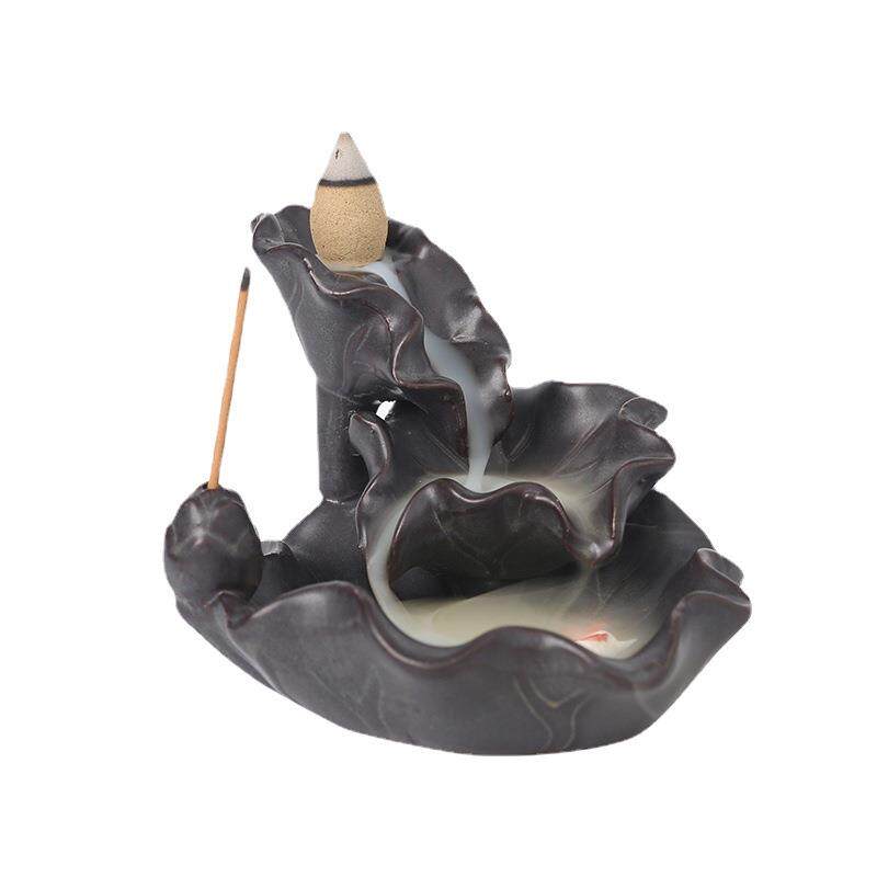 跨境陶瓷香薰炉家居饰品摆件简约创意荷花鱼瀑布烟倒流香炉工艺品