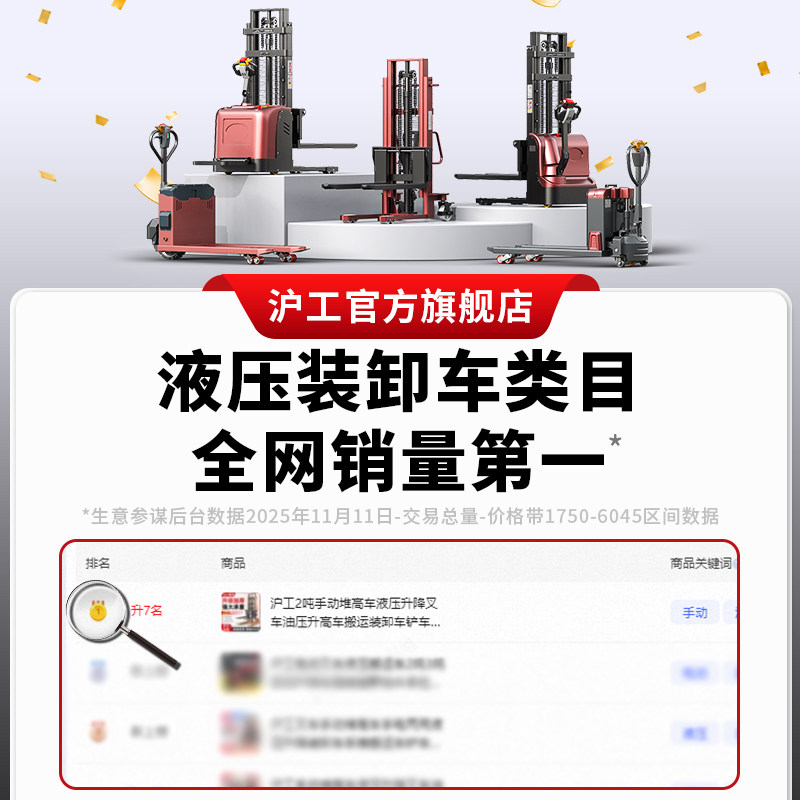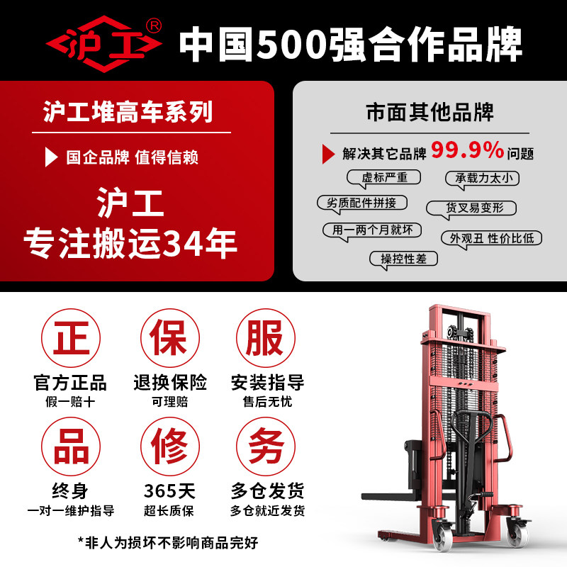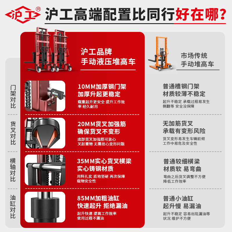 沪工2吨手动堆高车液压升降叉车油压升高车搬运装卸车铲车推高车