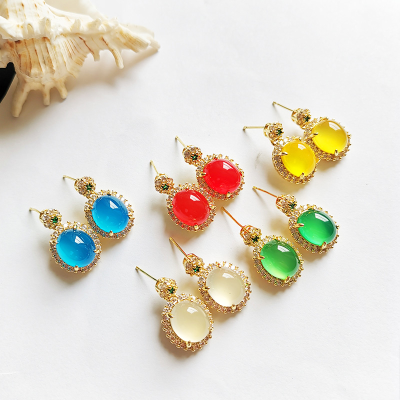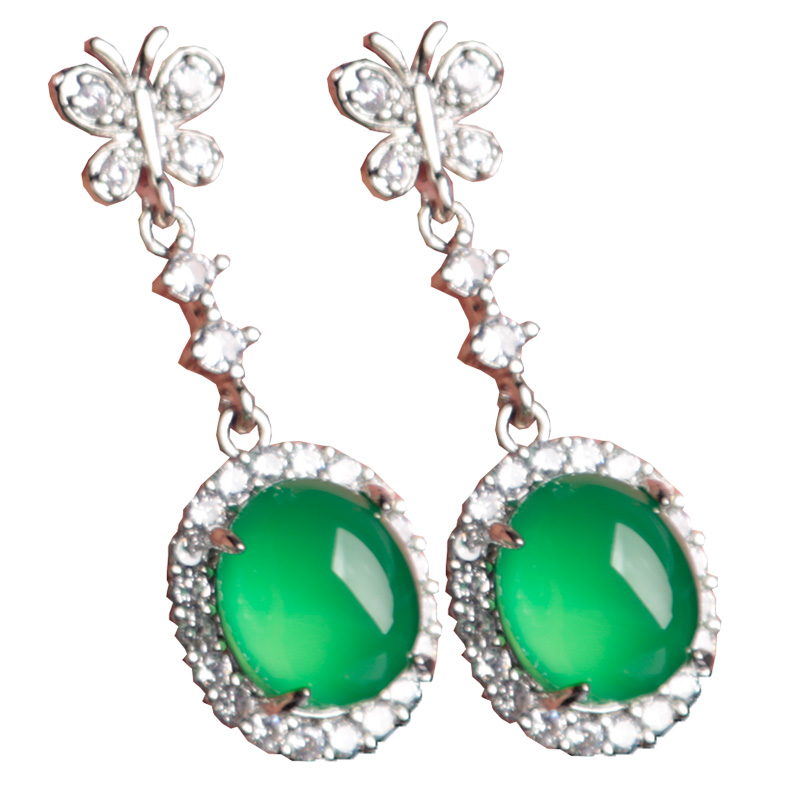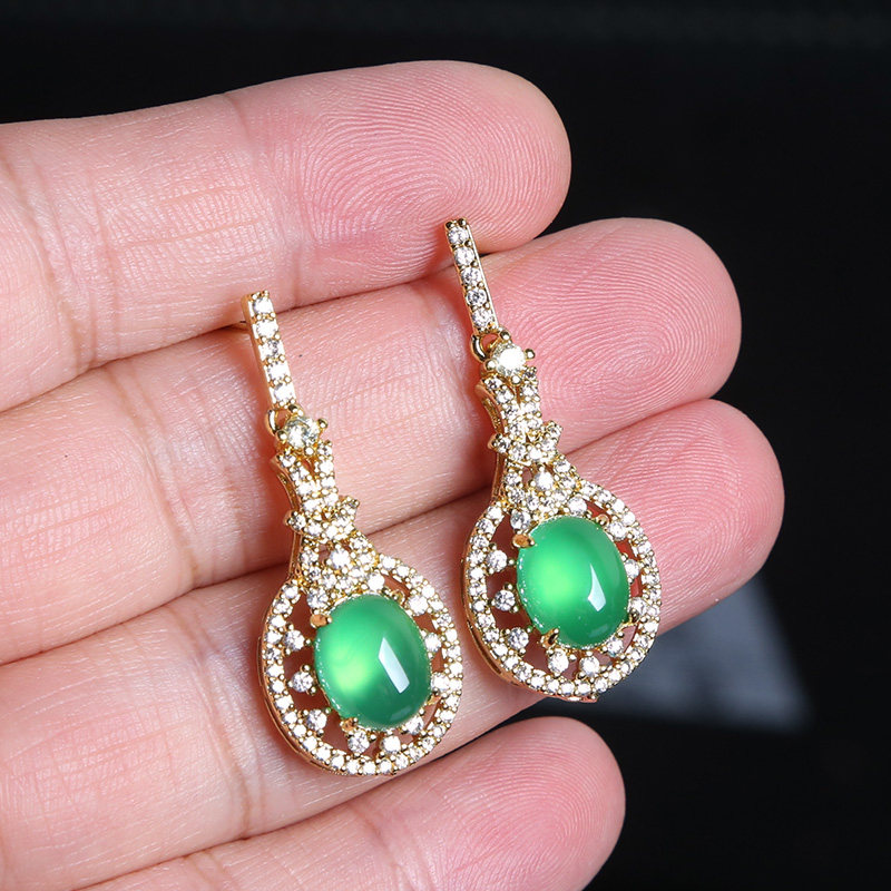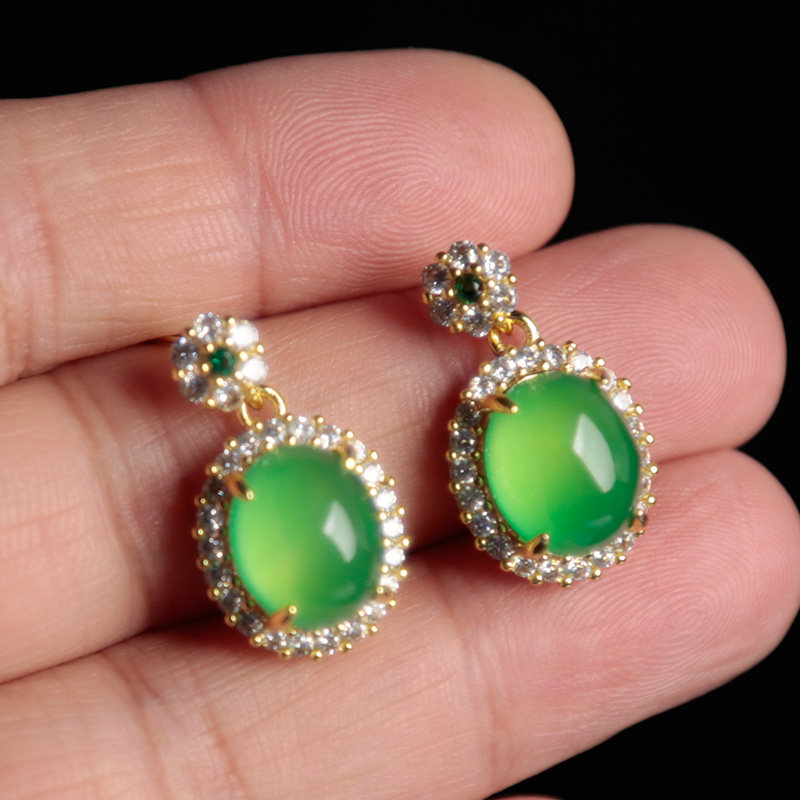 翠绿色玉髓耳坠子天然玉石耳饰钻石镶嵌耳钉椭圆形耳环时尚女款