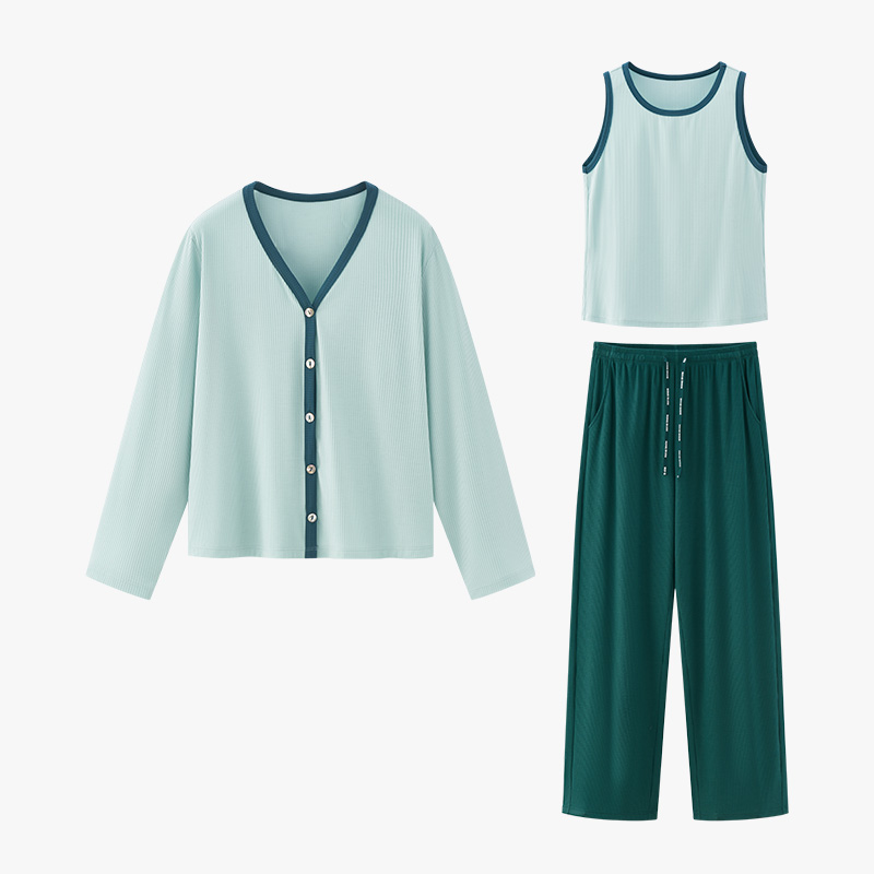 松山棉店小薄荷罗纹居家服三件套女士长袖睡衣冰丝大码家居服套装