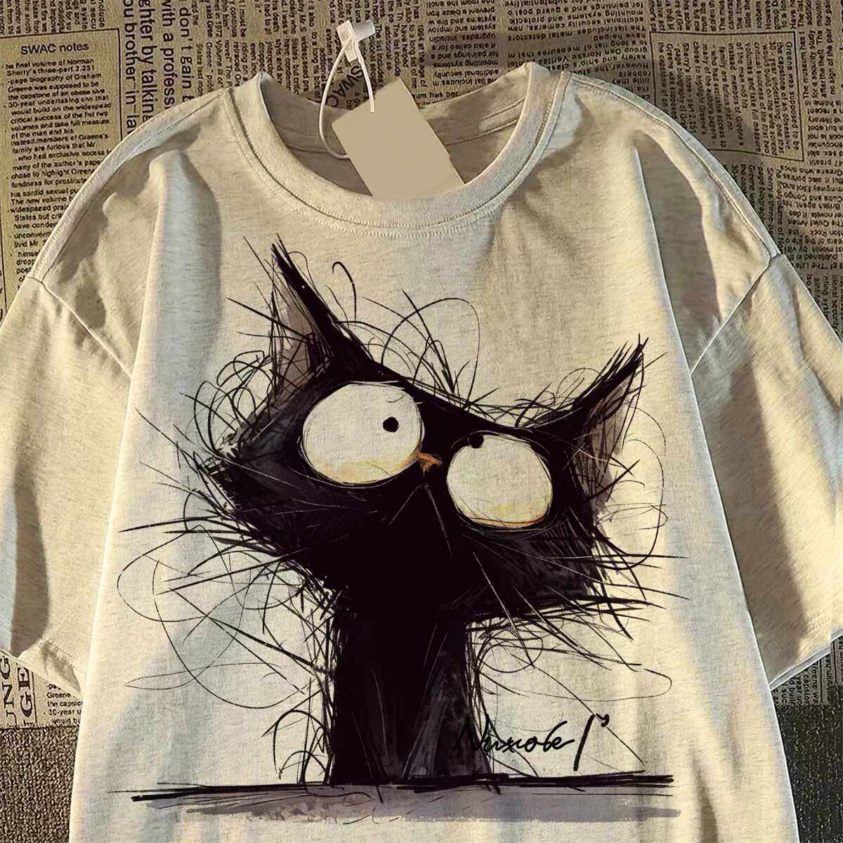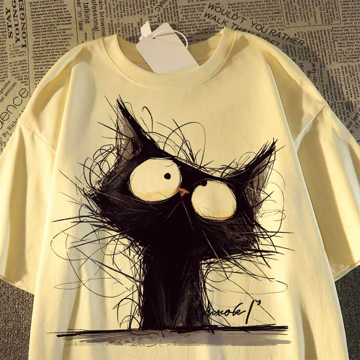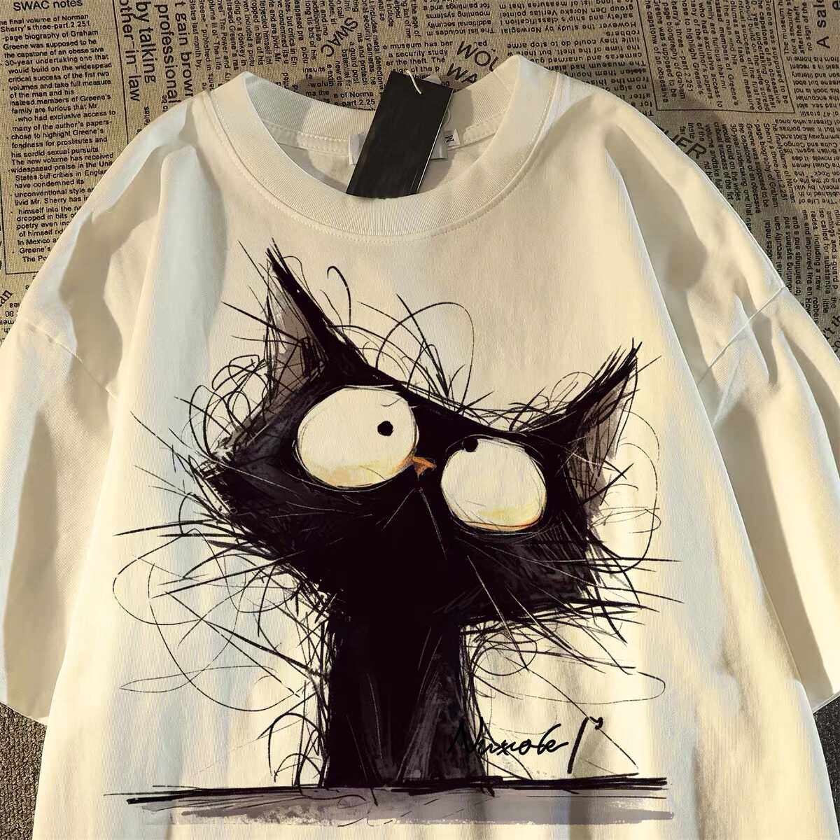 100%纯棉日系复古线条猫咪印花短袖t恤2024新款美式百搭情侣上衣